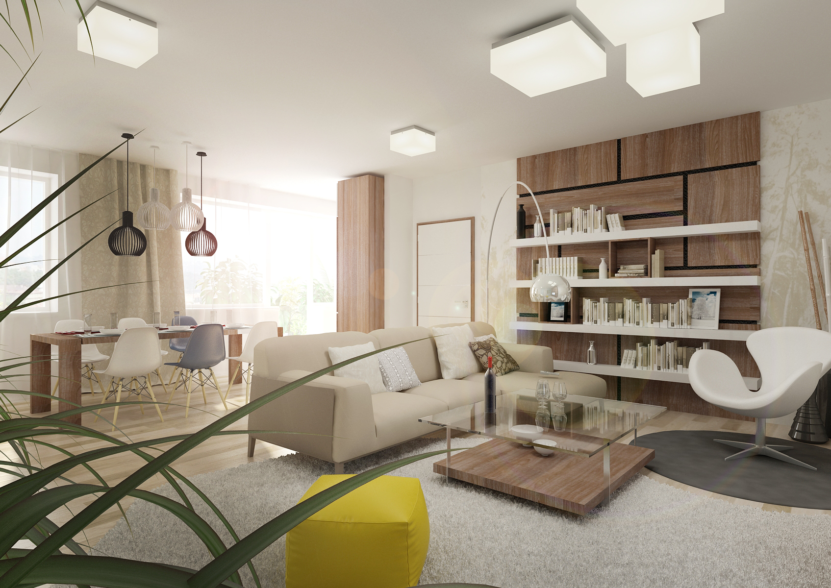 Interior of a two-room apartment with a combination of light and dark wood decor