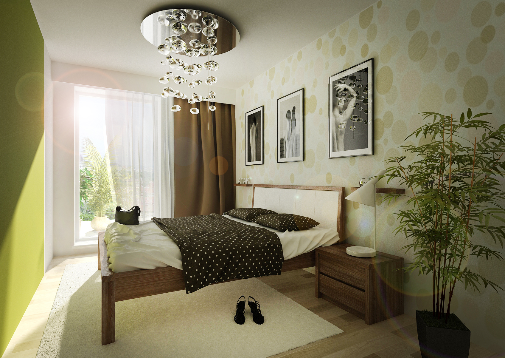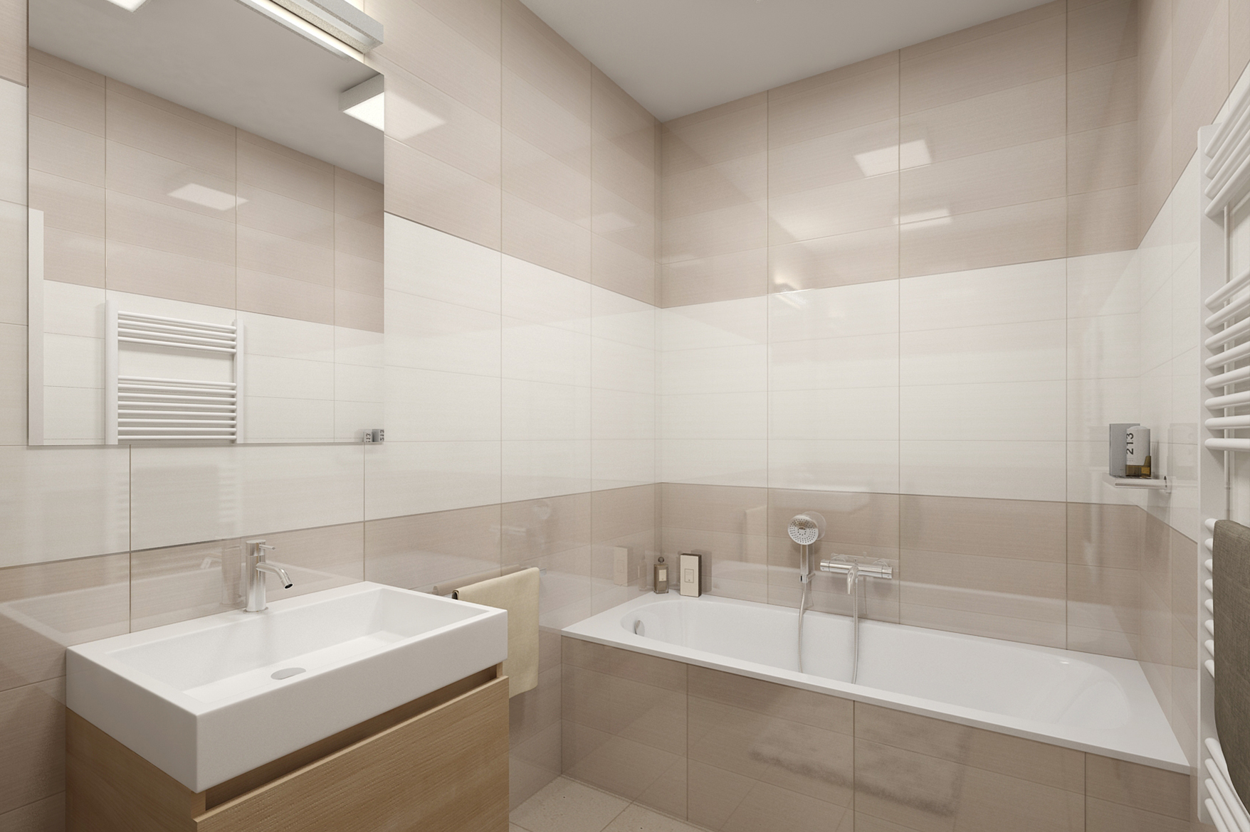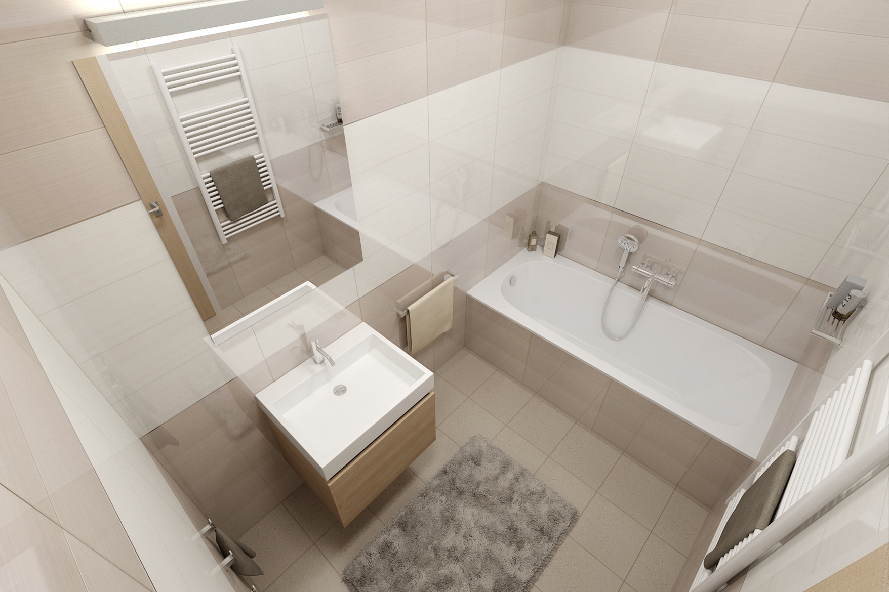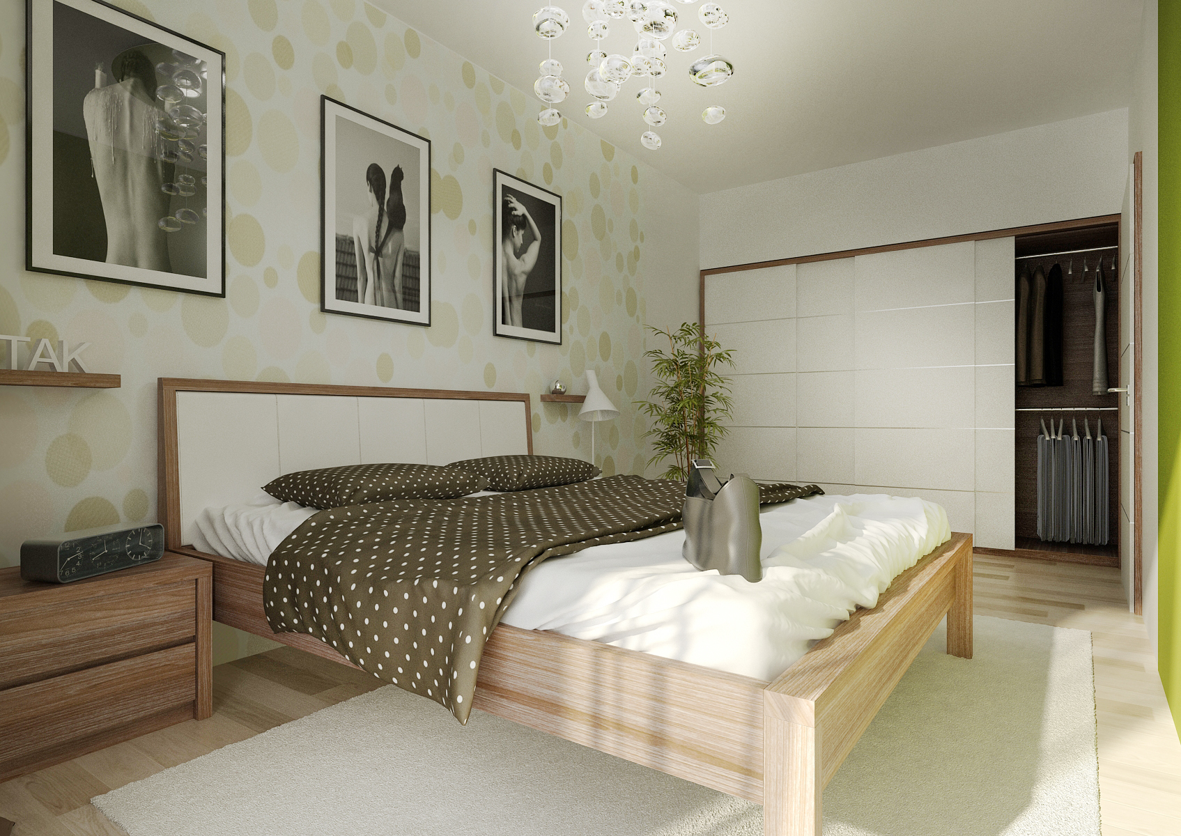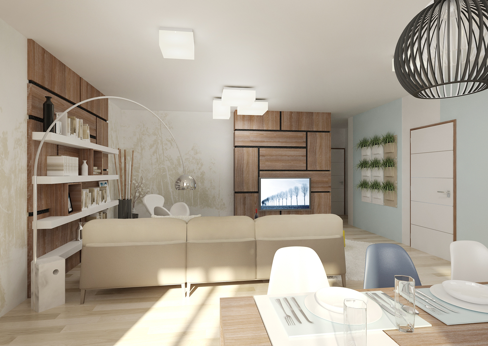 Complete apartment design 2 + kk. The interior alternates between a light wood decor on a vinyl floor and a darker one on the furniture. The living room is dominated by distinctive cladding panels, Tres Tintas wallpaper and Ateh Aquarium ceiling lights.