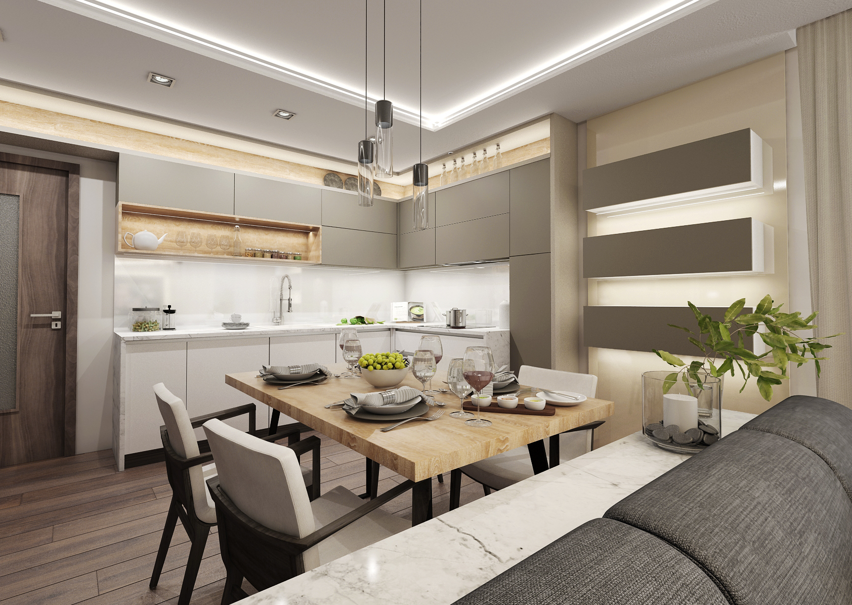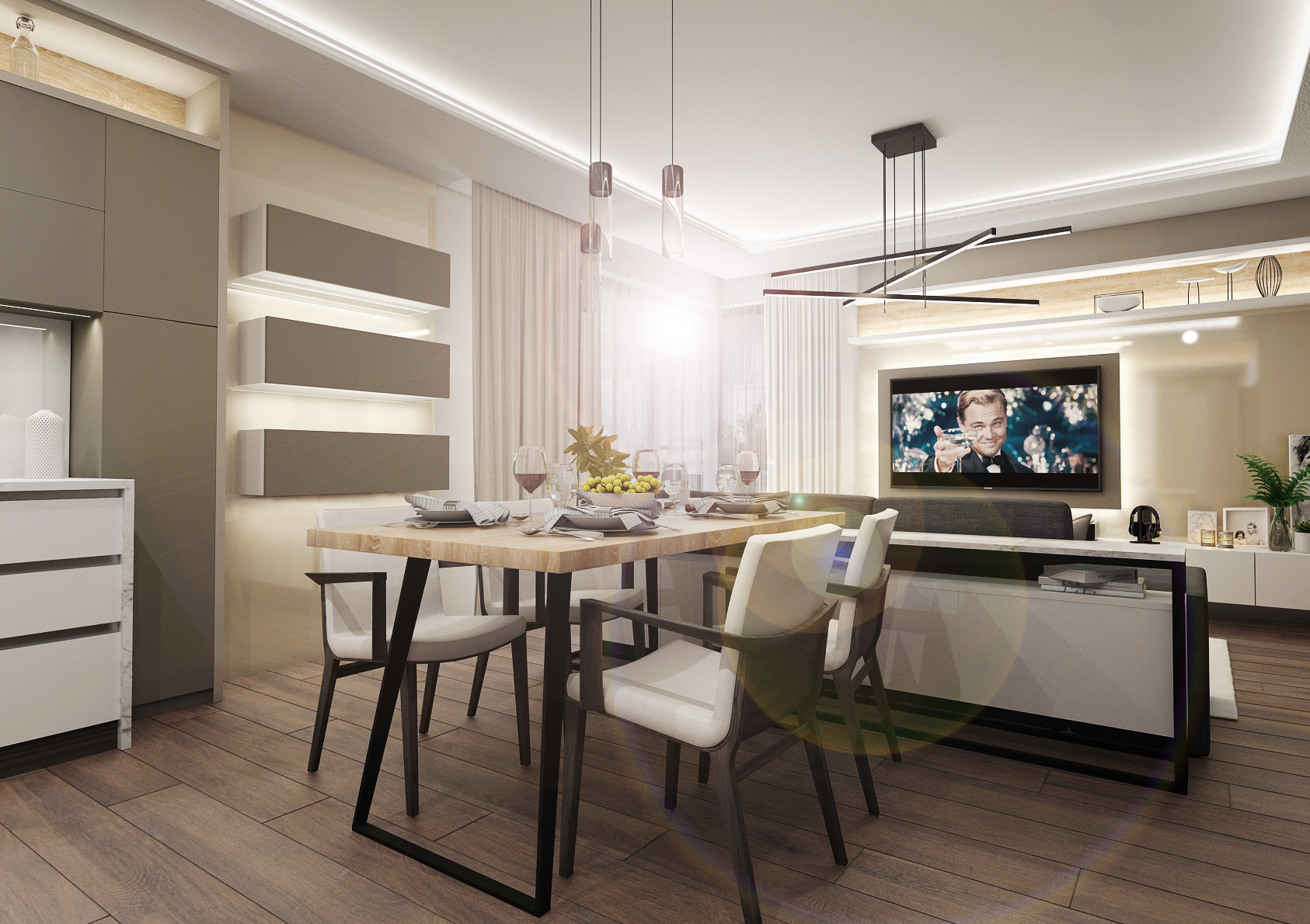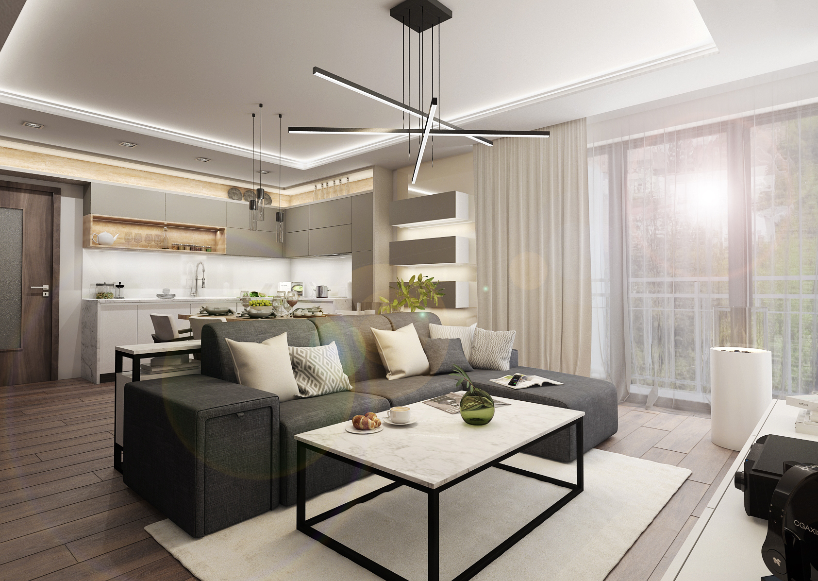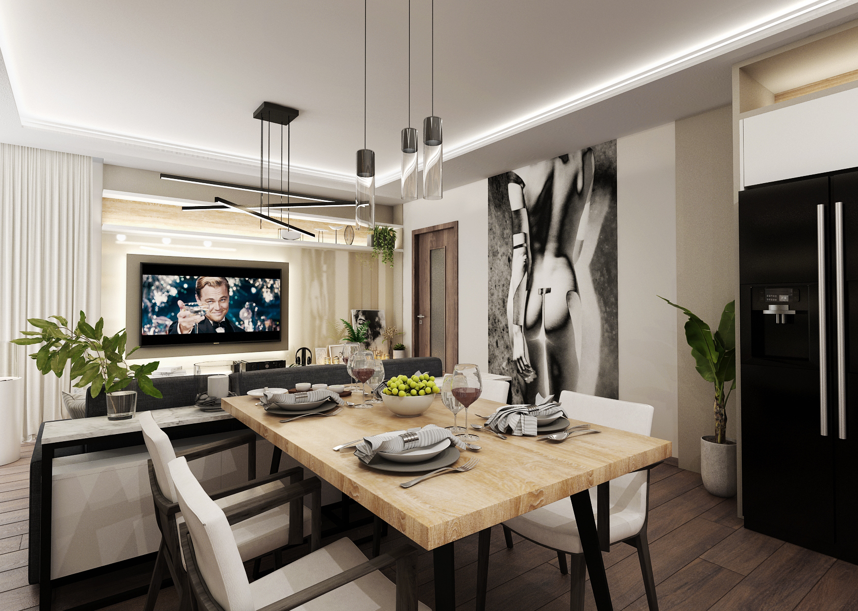 The living space, which is connected to the kitchenette and dining room, is equipped with handleless cabinets, which underline the clean and modern look of the interior. The marble laminate on the sides of the kitchen unit together with the backlight and black accessories give the impression of luxury. There is also a spacious sofa and living room wall. The whole apartment is supplied with enough light by indirect variable lighting, which can be connected to a smart home.