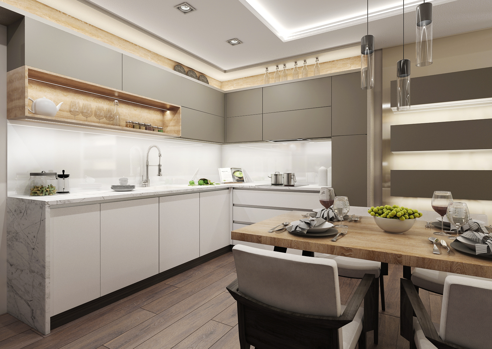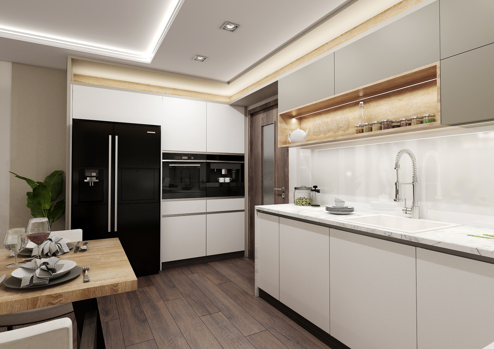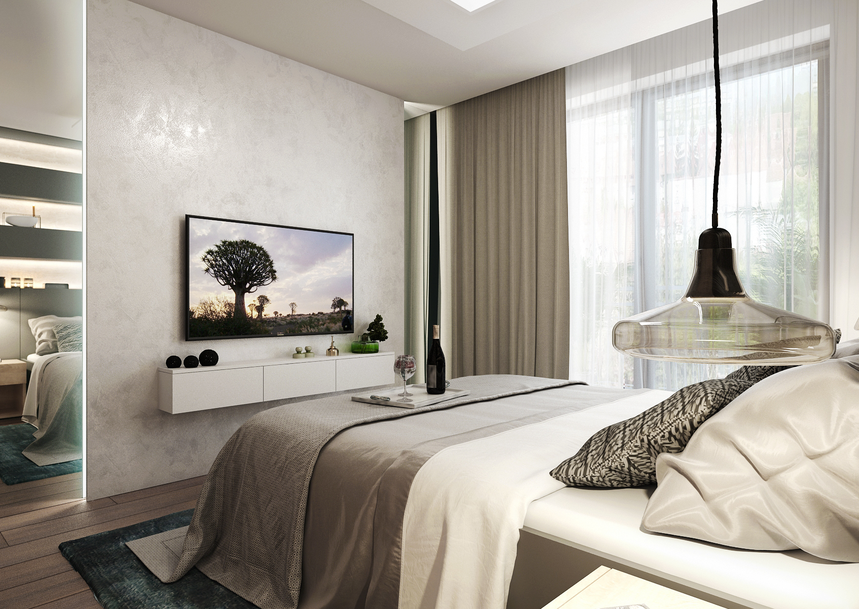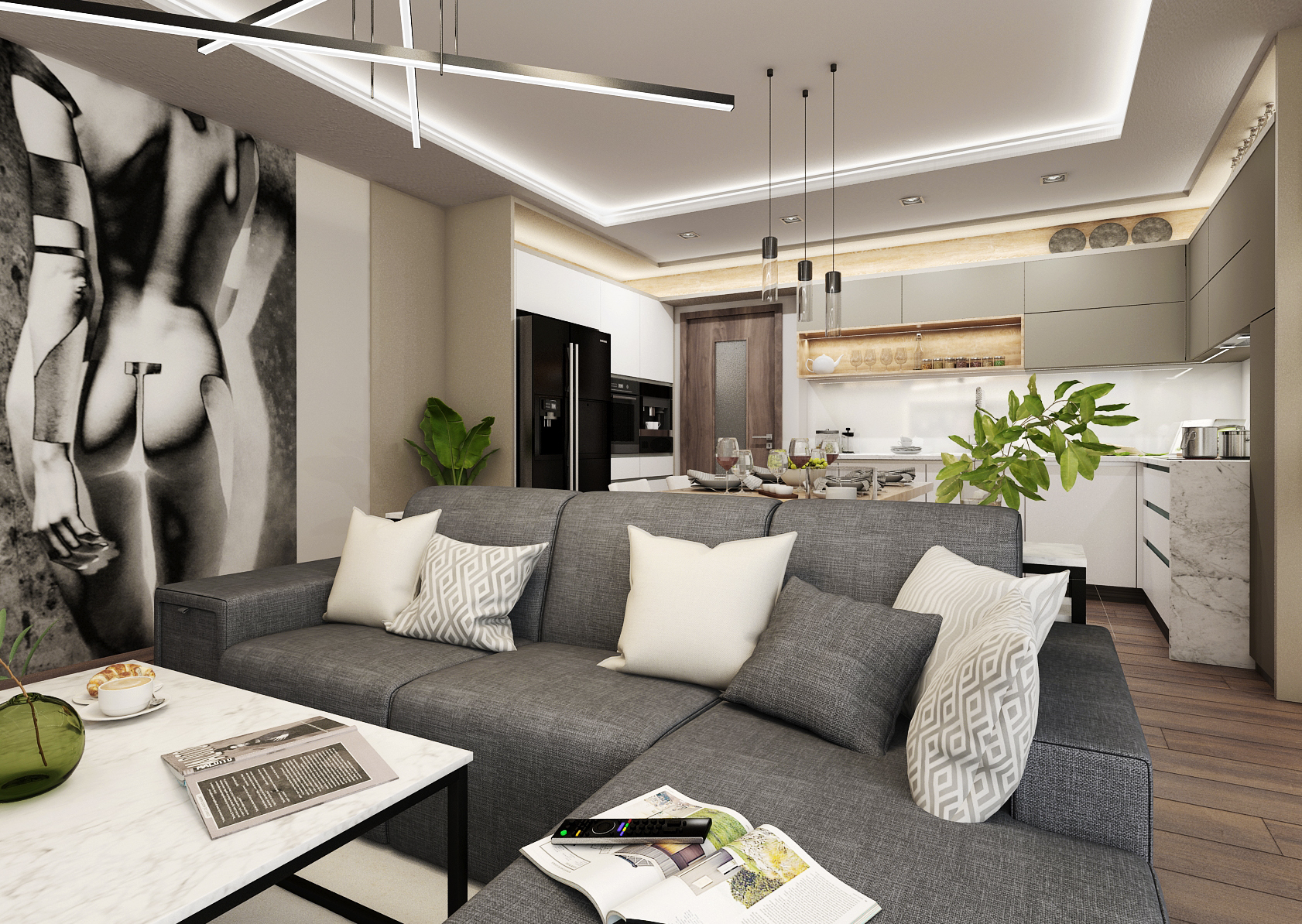 The living space, which is connected to the kitchenette and dining room, is equipped with handleless cabinets, which underline the clean and modern look of the interior. The marble laminate on the sides of the kitchen unit together with the backlight and black accessories give the impression of luxury. There is also a spacious sofa and living room wall. The whole apartment is supplied with enough light by indirect variable lighting, which can be connected to a smart home.
