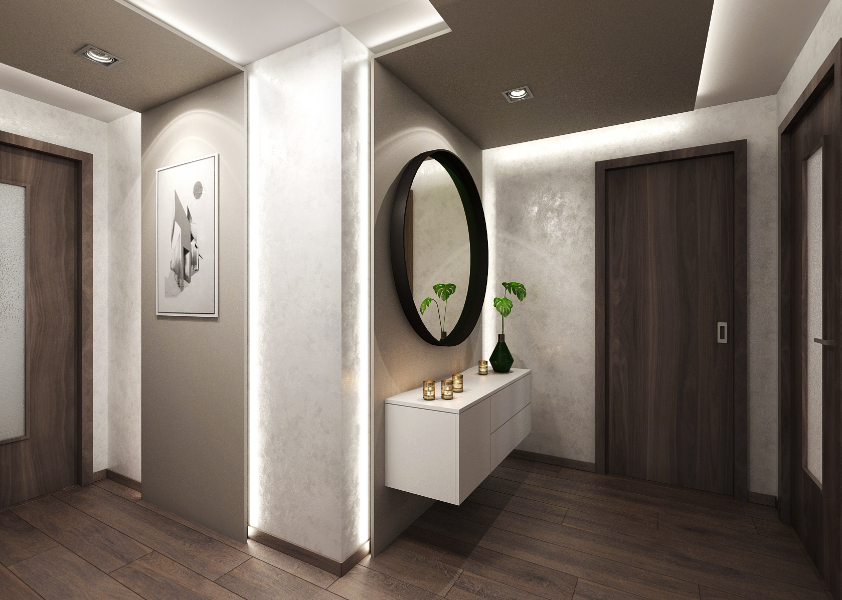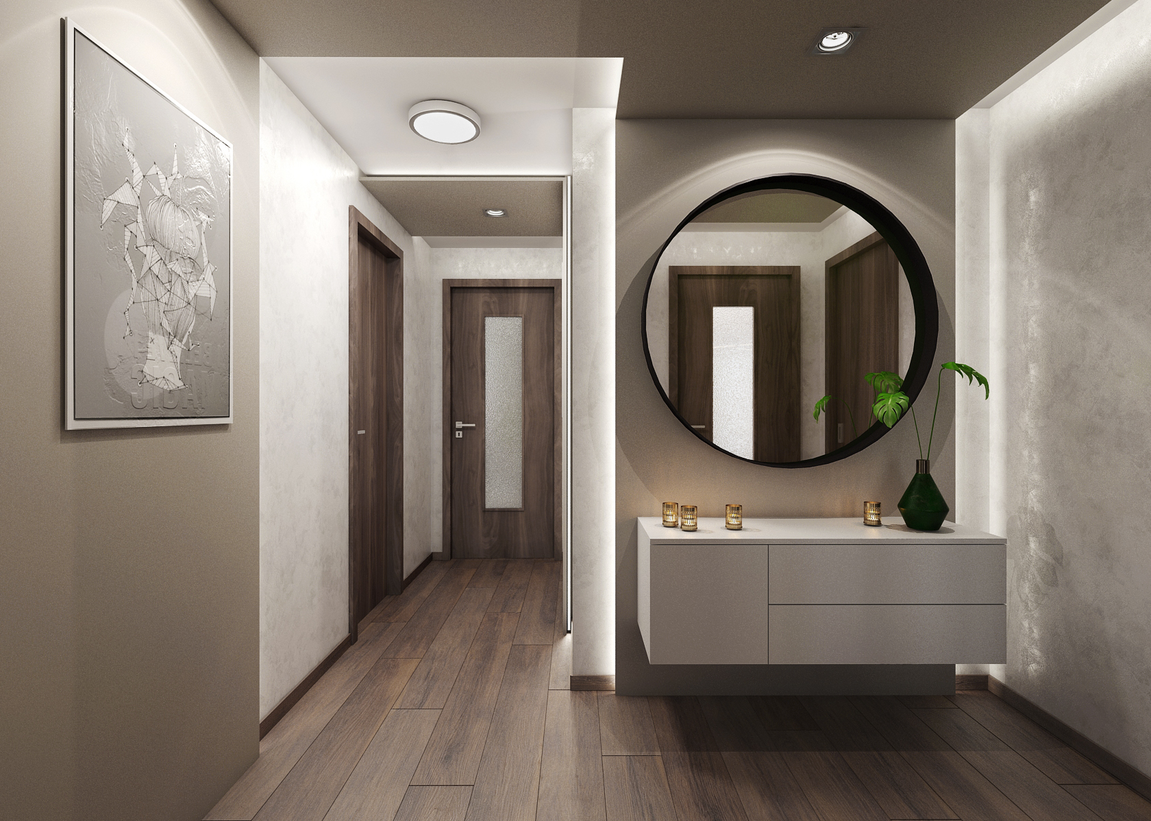 The apartment is penetrated by a corridor with a large round mirror with a black frame and a storage cabinet anchored in the wall. The premises are also enriched with backlit ceilings along the wall up to the ceiling, which is combined with a structured decorative trowel.