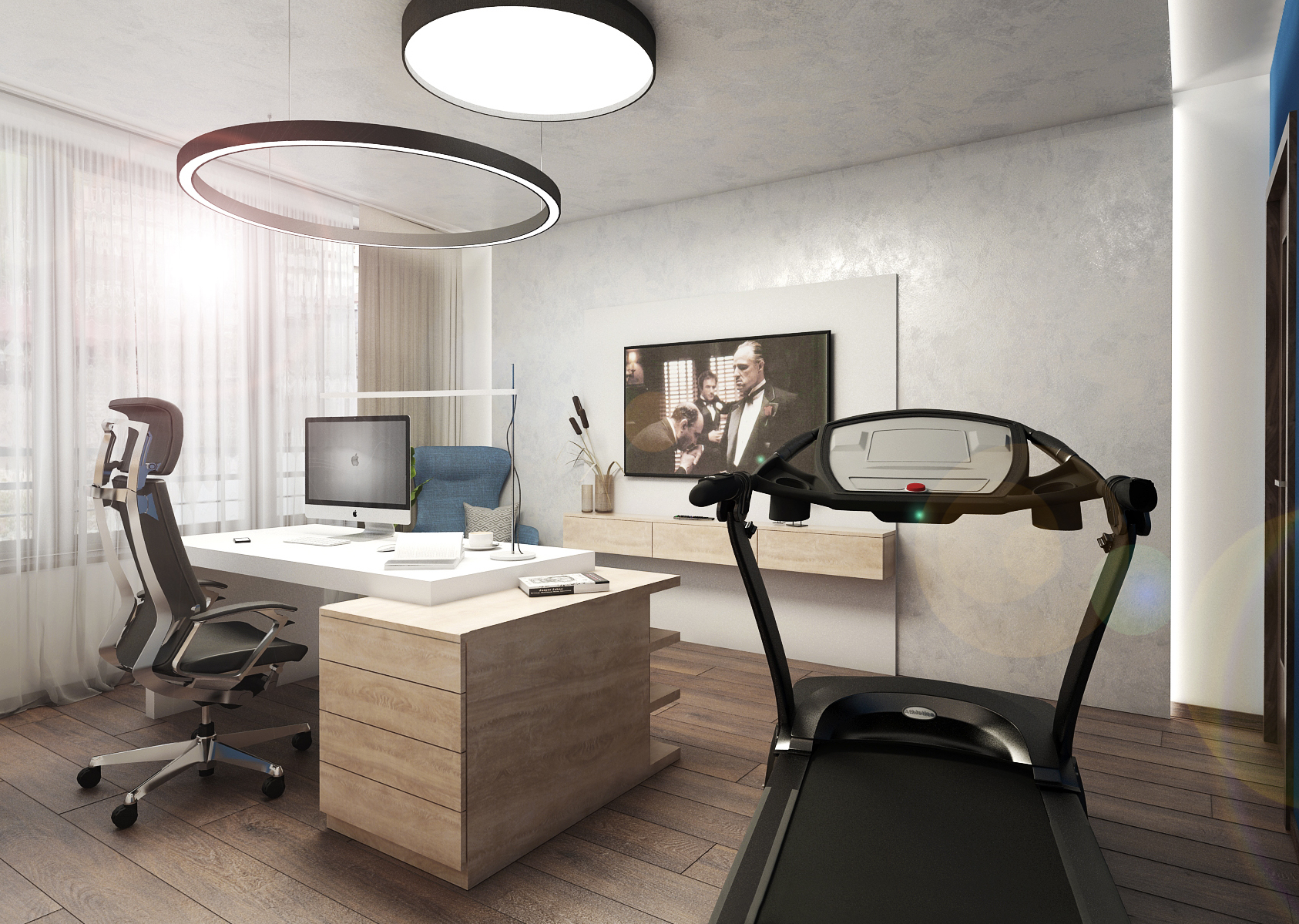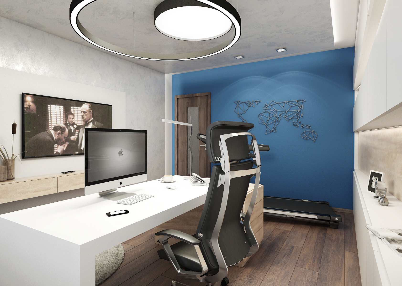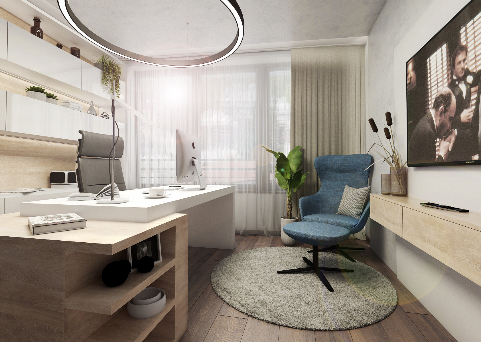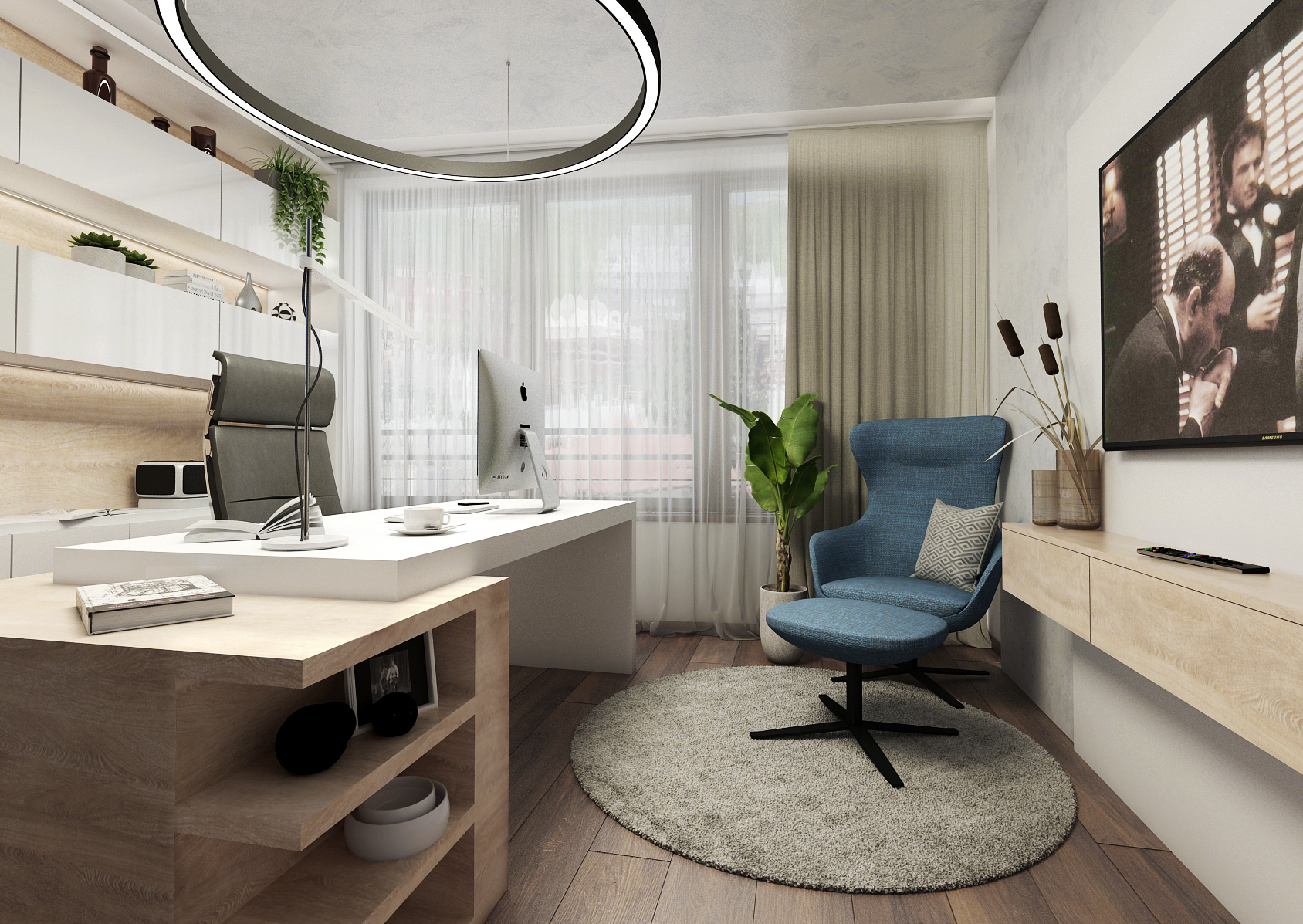 The interior does not lack a home-office, where the free space can be used for a temporary home gym. In contrast to the dark solid floor, there is a white table with cabinets in a light oak wood pattern. The same motif is repeated on the cabinets under the TV and on the built-in cabinet behind the desk. Part of the study is complemented by a blue painting and the ceiling with other walls are also variegated with a structured decorative trowel.