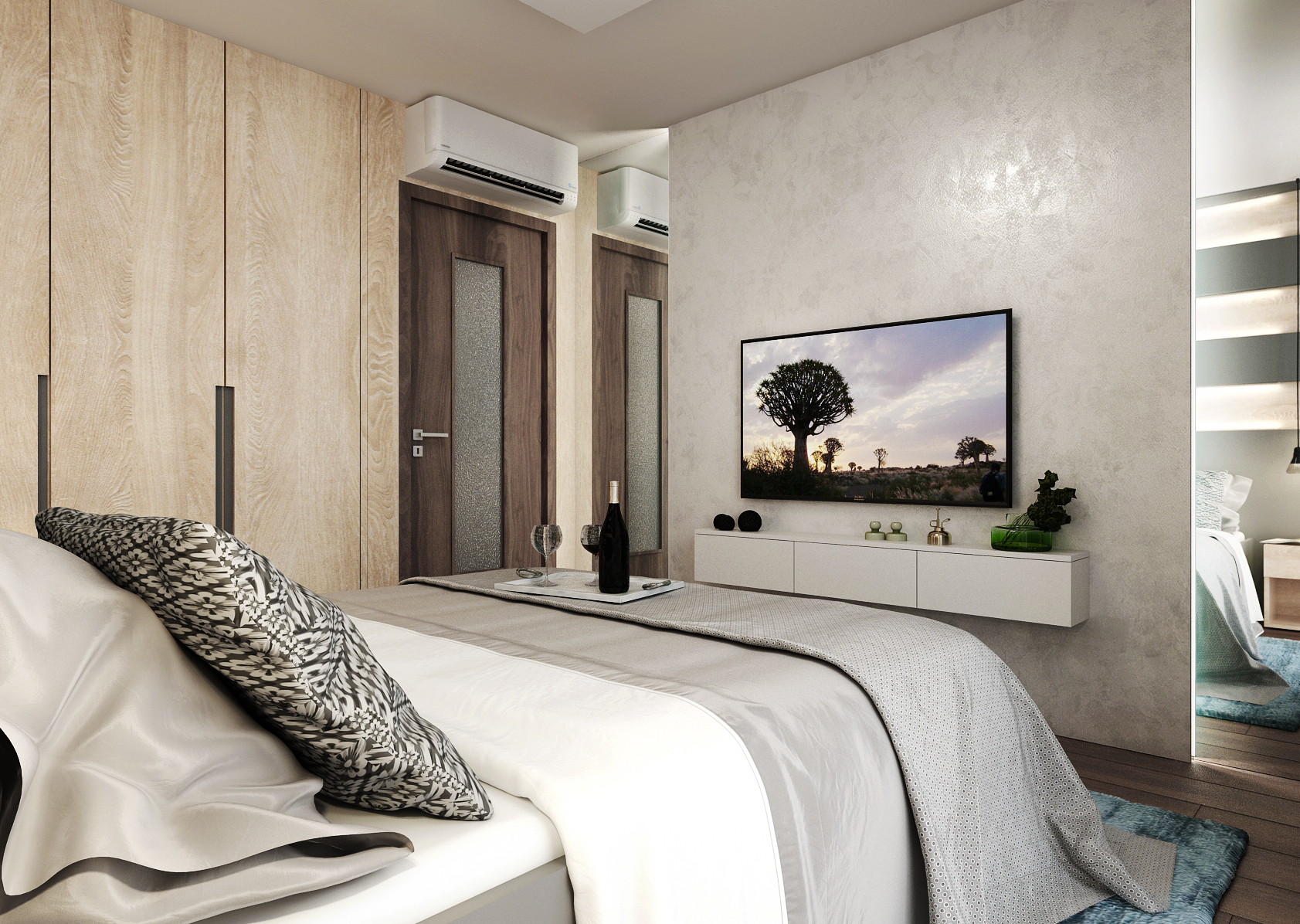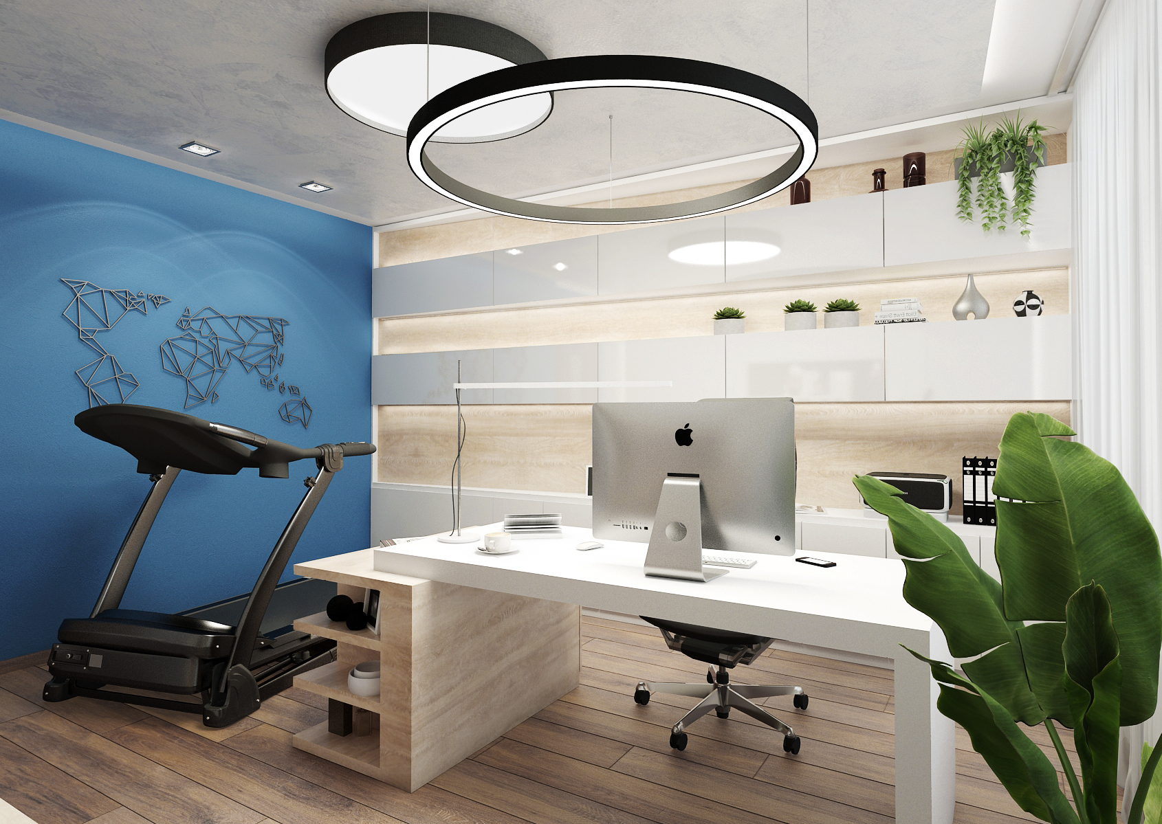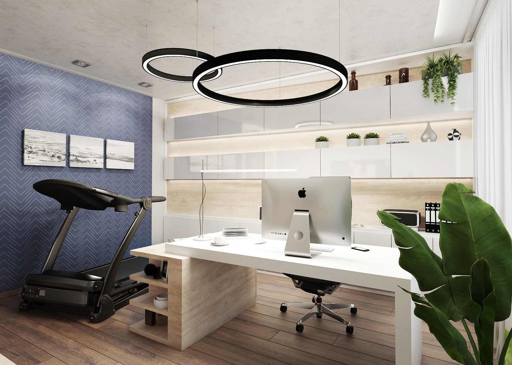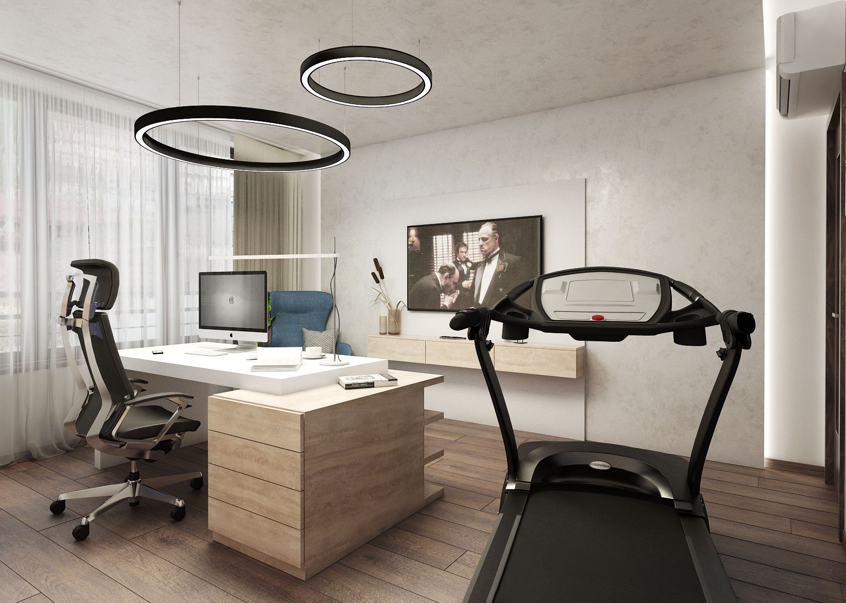The interior does not lack a home-office, where the free space can be used for a temporary home gym. In contrast to the dark solid floor, there is a white table with cabinets in a light oak wood pattern. The same motif is repeated on the cabinets under the TV and on the built-in cabinet behind the desk. Part of the study is complemented by a blue painting and the ceiling with other walls are also variegated with a structured decorative trowel.