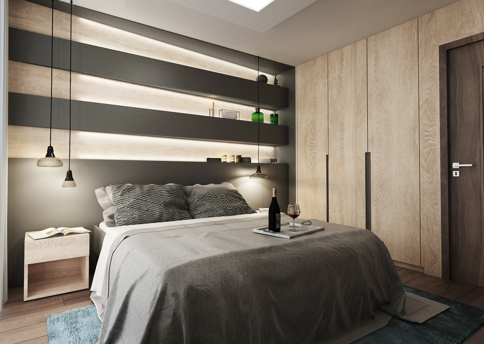 In the bedroom with an oak built-in wardrobe and a massive dark floor, the painting is again replaced by a decorative trowel. An interesting element here are shelves of triangular shape, which optically protrude from the wall behind the bed headboard and built-in cabinets in line.