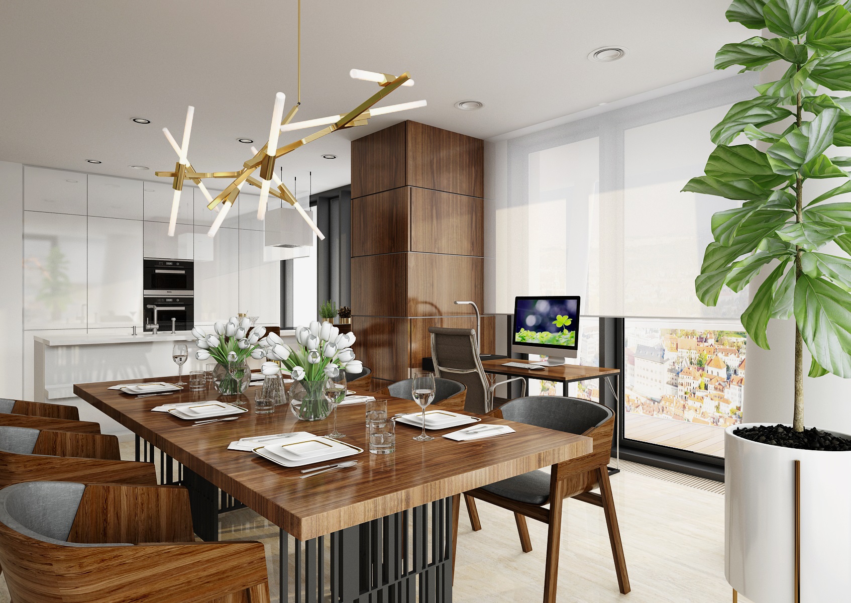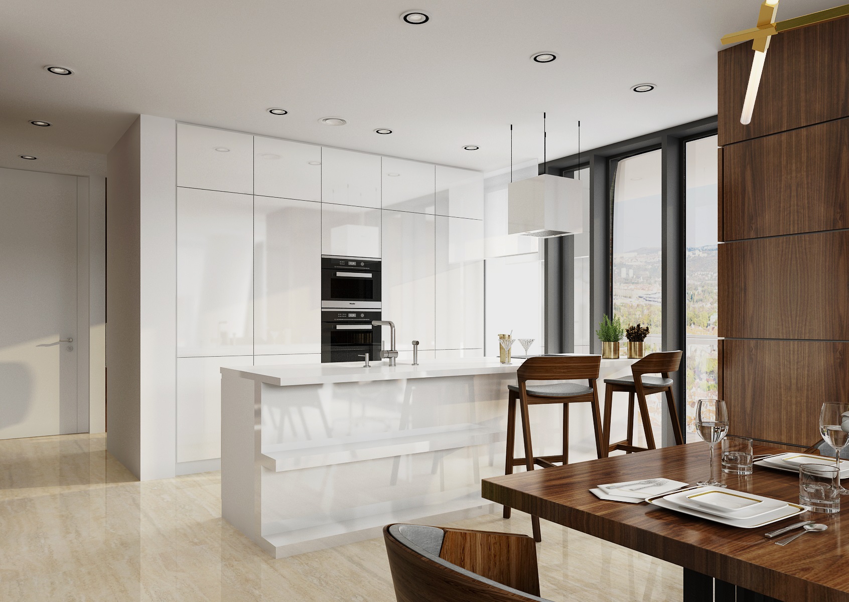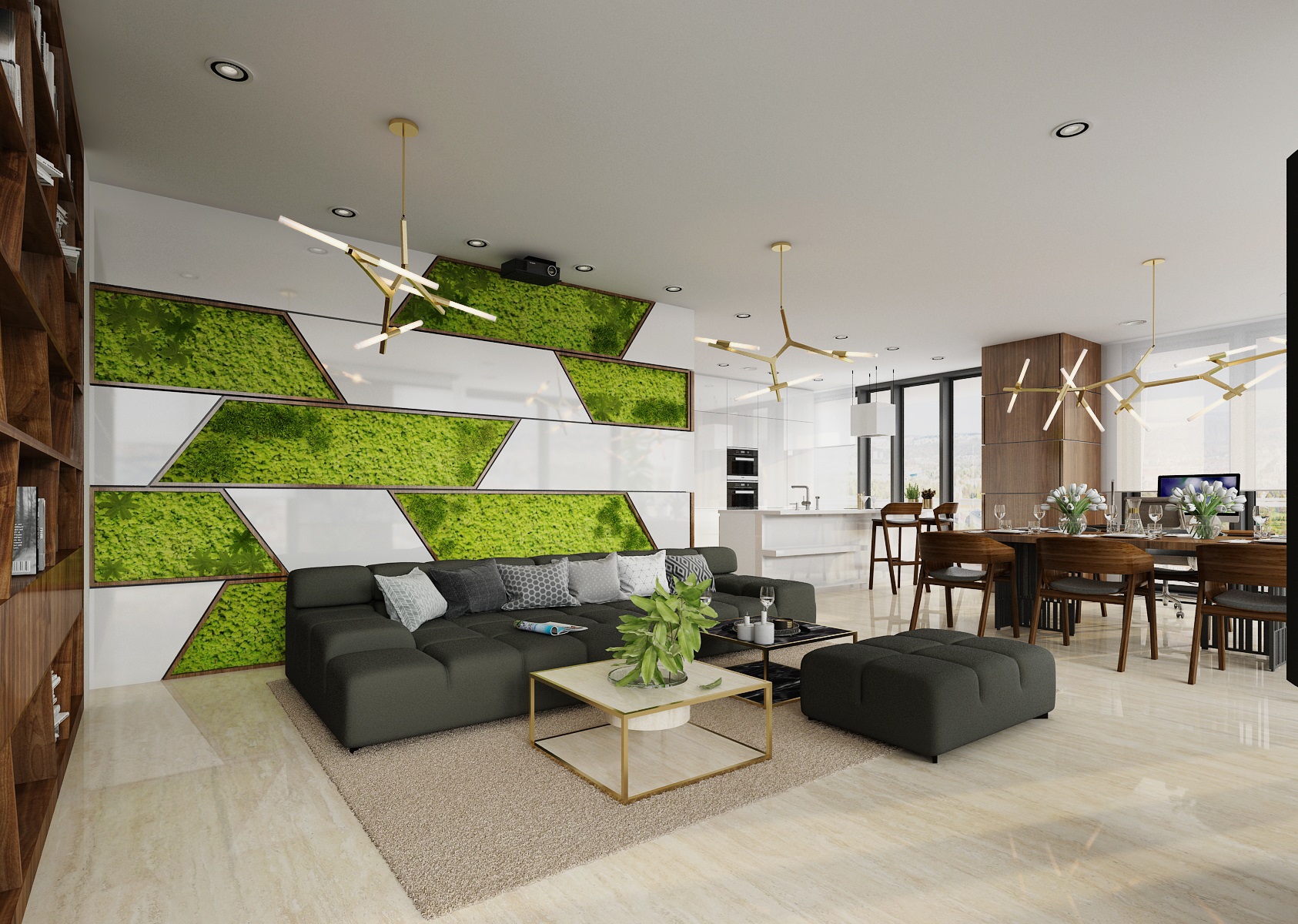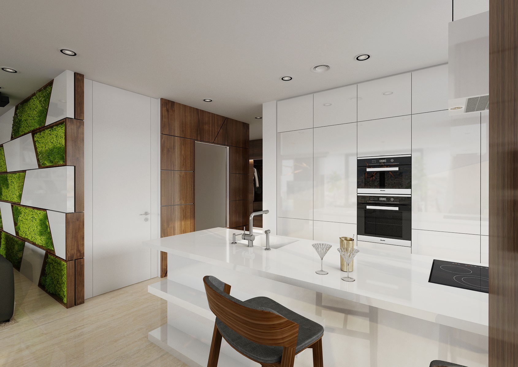 Light flooring is made of large-format travertine, the furniture is mostly made of walnut veneer and in high gloss white lacquer, the Merano chair from TON, the wall tiles are "enlivened" by mummified moss and the space is enhanced with Agnes lights by Lindsey Adelman.