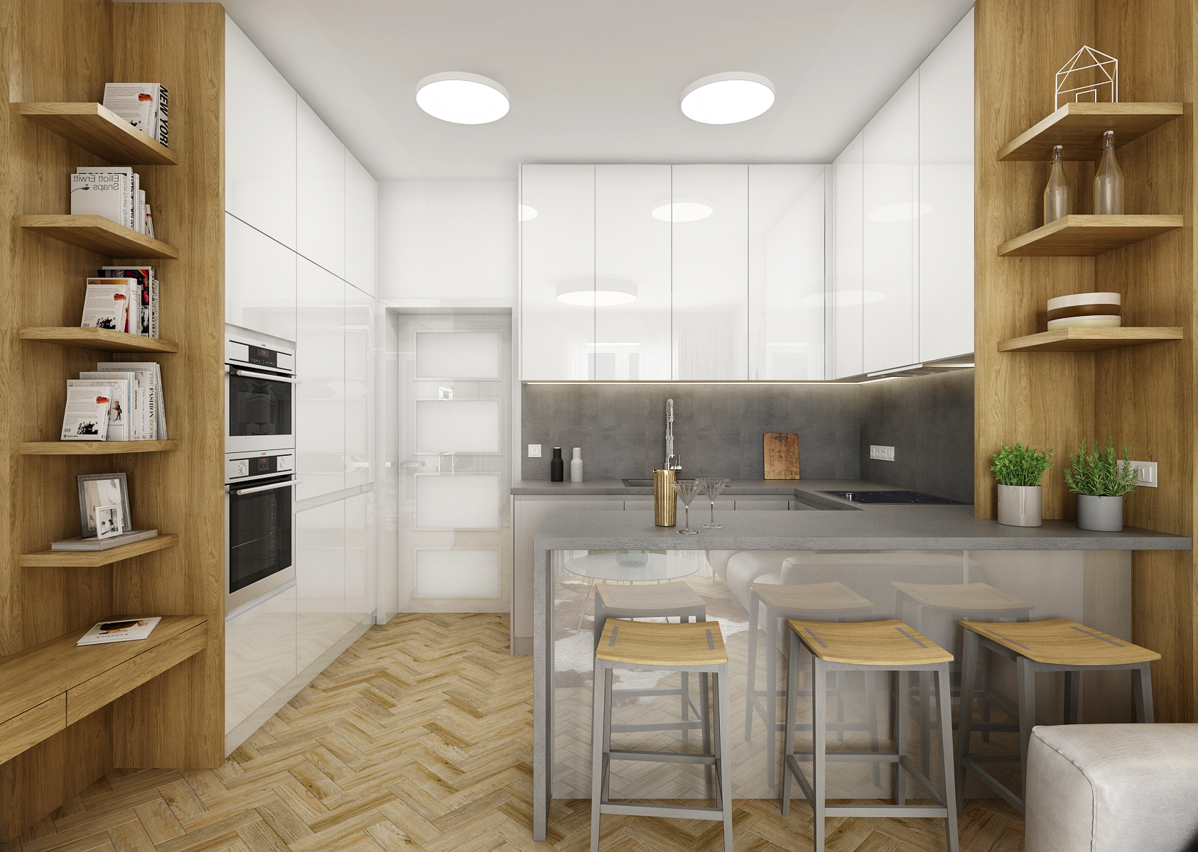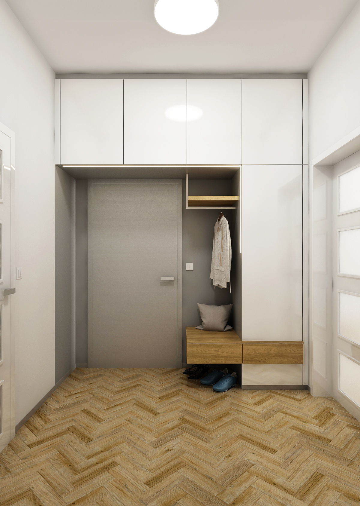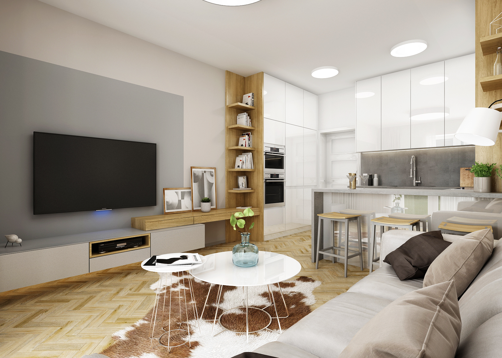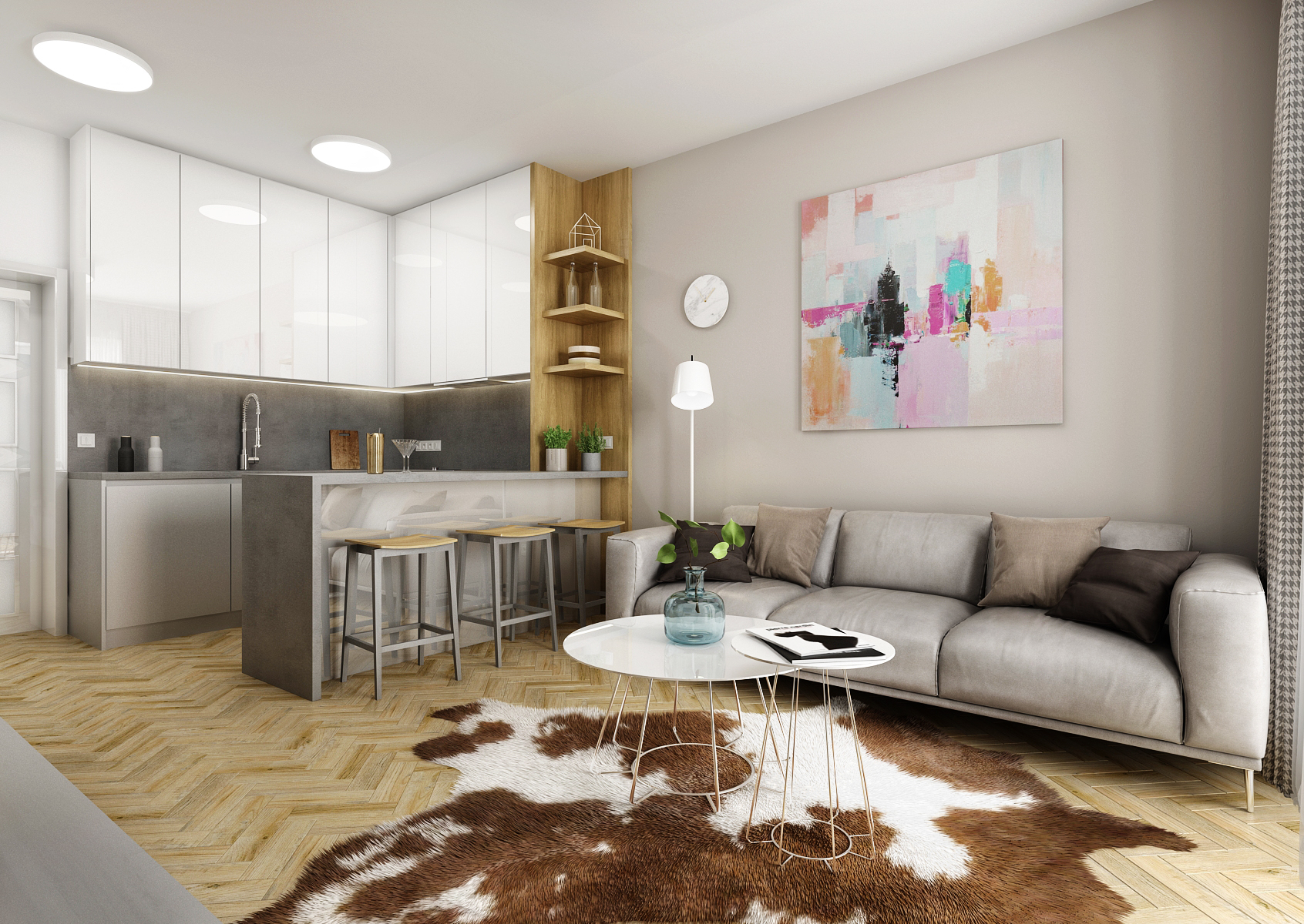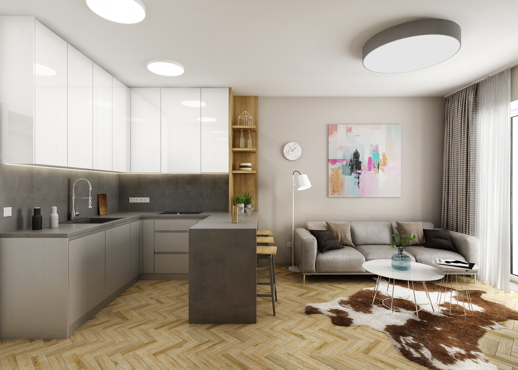 This design of the living space is dominated by the parquet floor and light shades of gray, which are reflected both on the furniture elements and the painting.