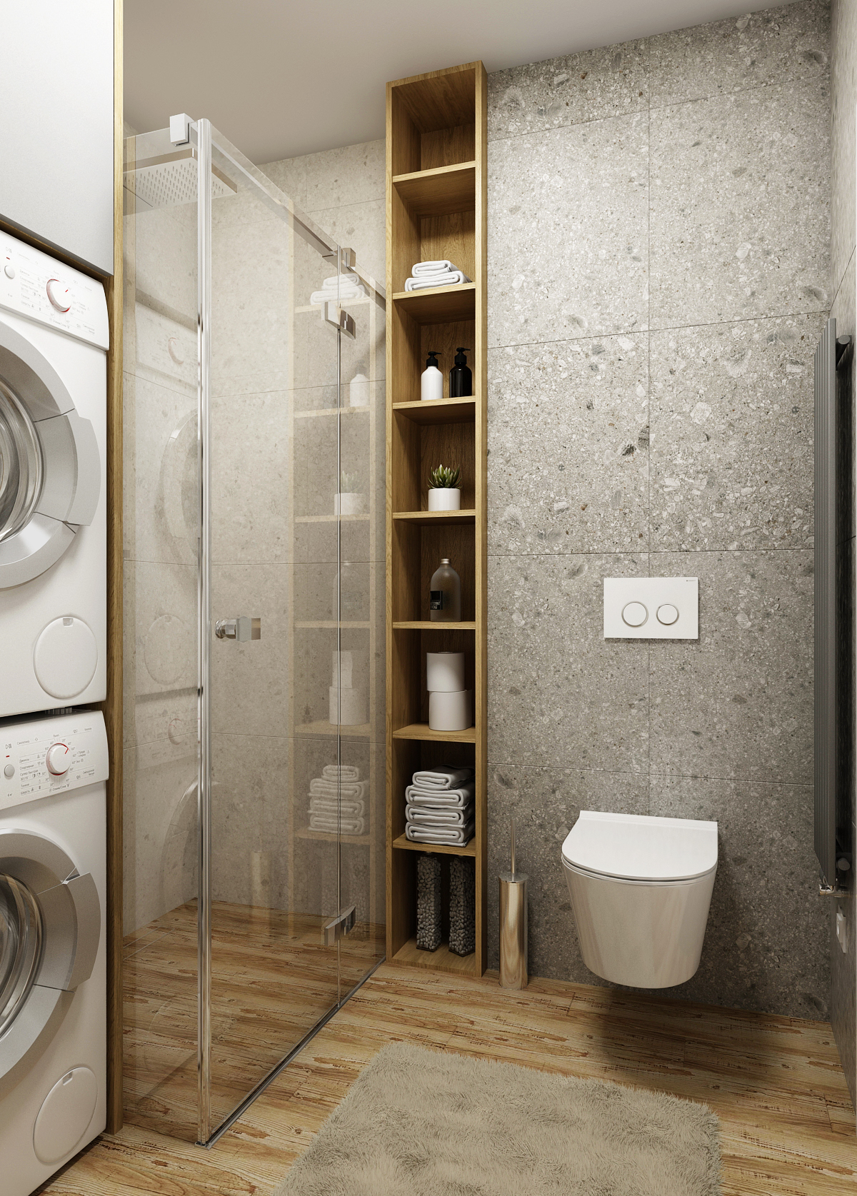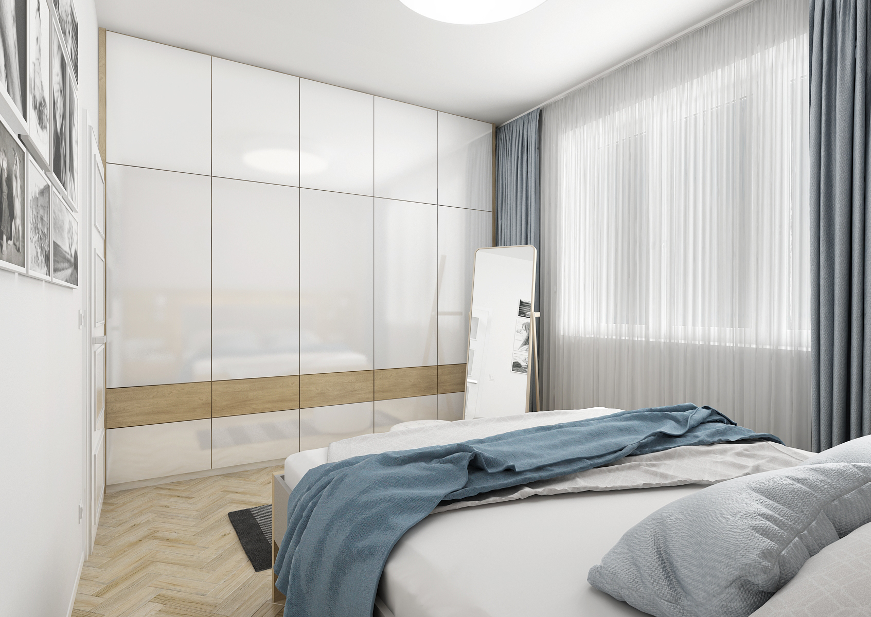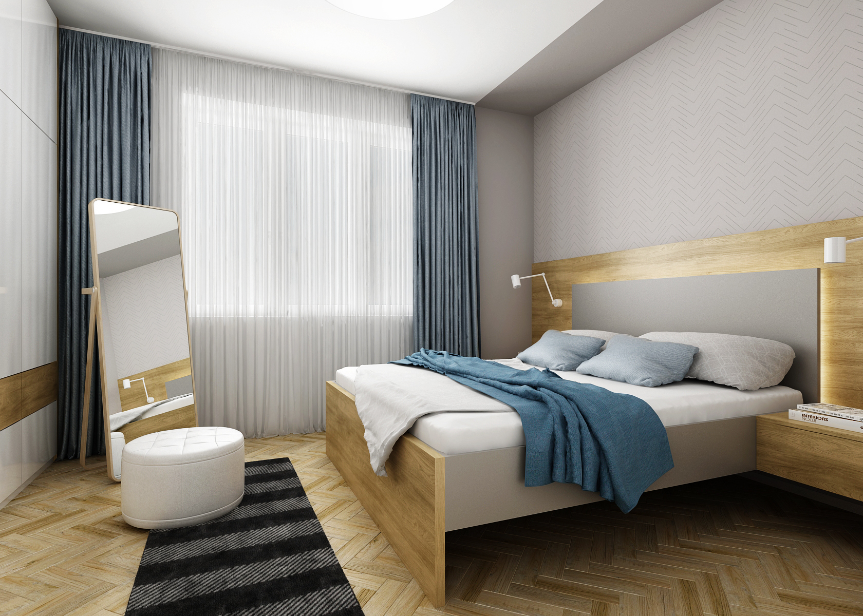 Oak is also located in the bedroom in the form of a massive bed with an illuminated bed headboard. The whole apartment has a large amount of storage space, whether it is a corner shelf in the living room, a shelf in the bathroom or cabinet walls in the hallway and in the bedroom.