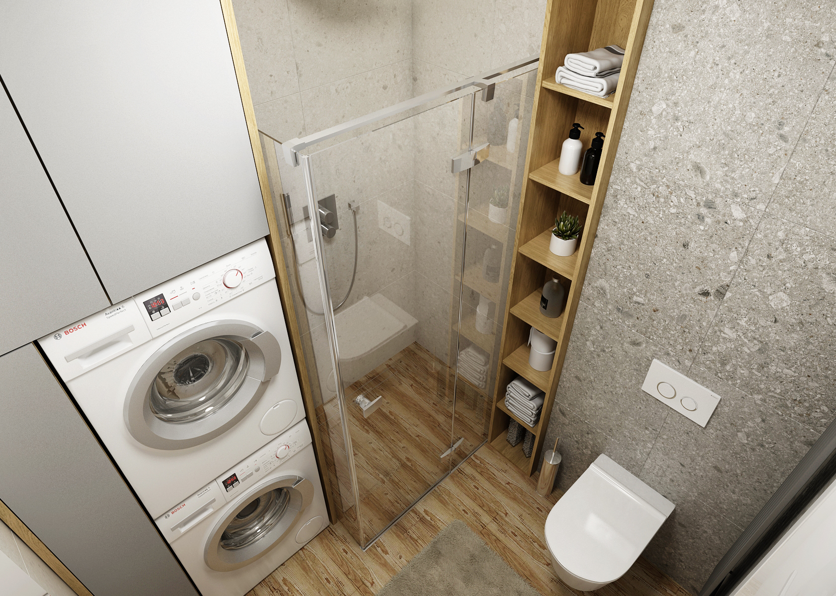 Gray is here in combination with oak wood decor. Hanging furniture in the living room is illuminated with LED tape, an important element here is the hidden wiring for cabling from the TV.