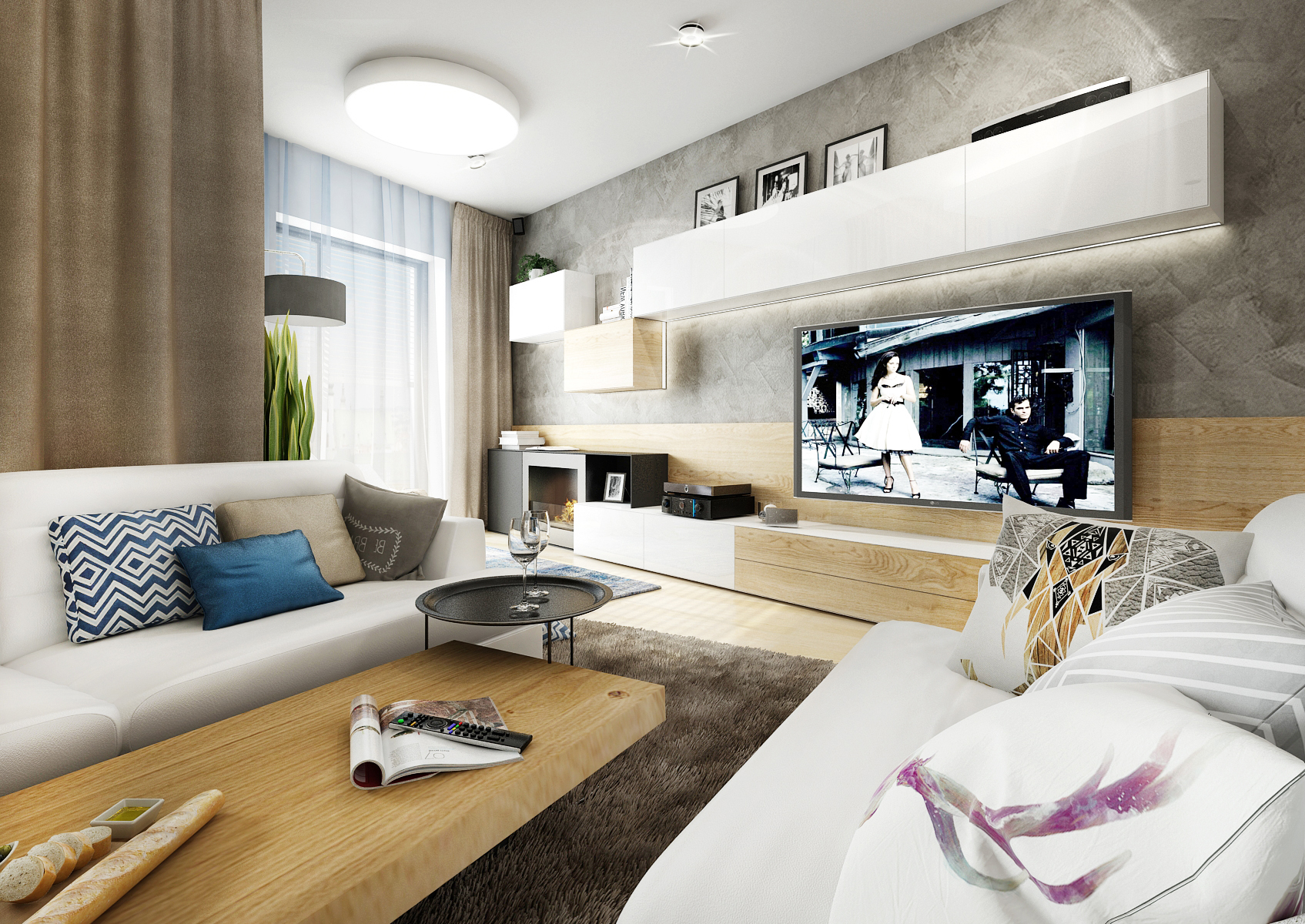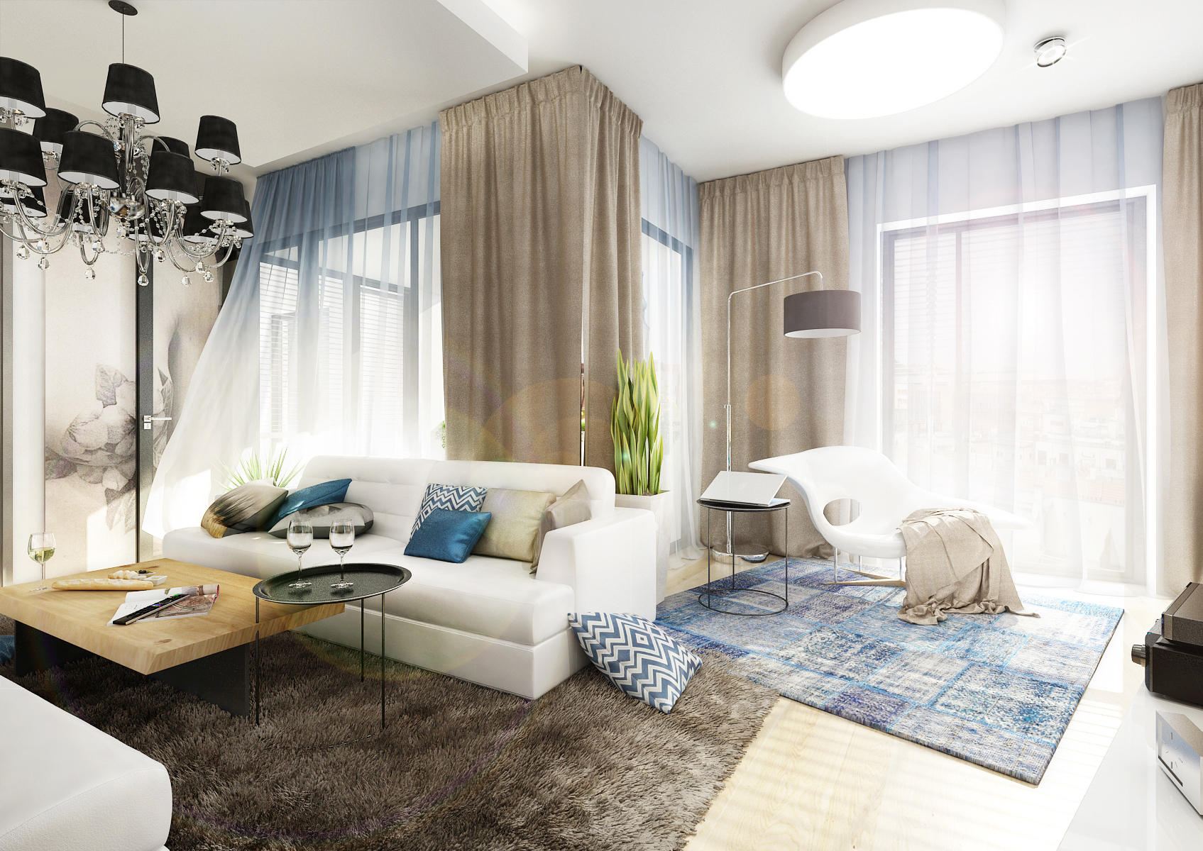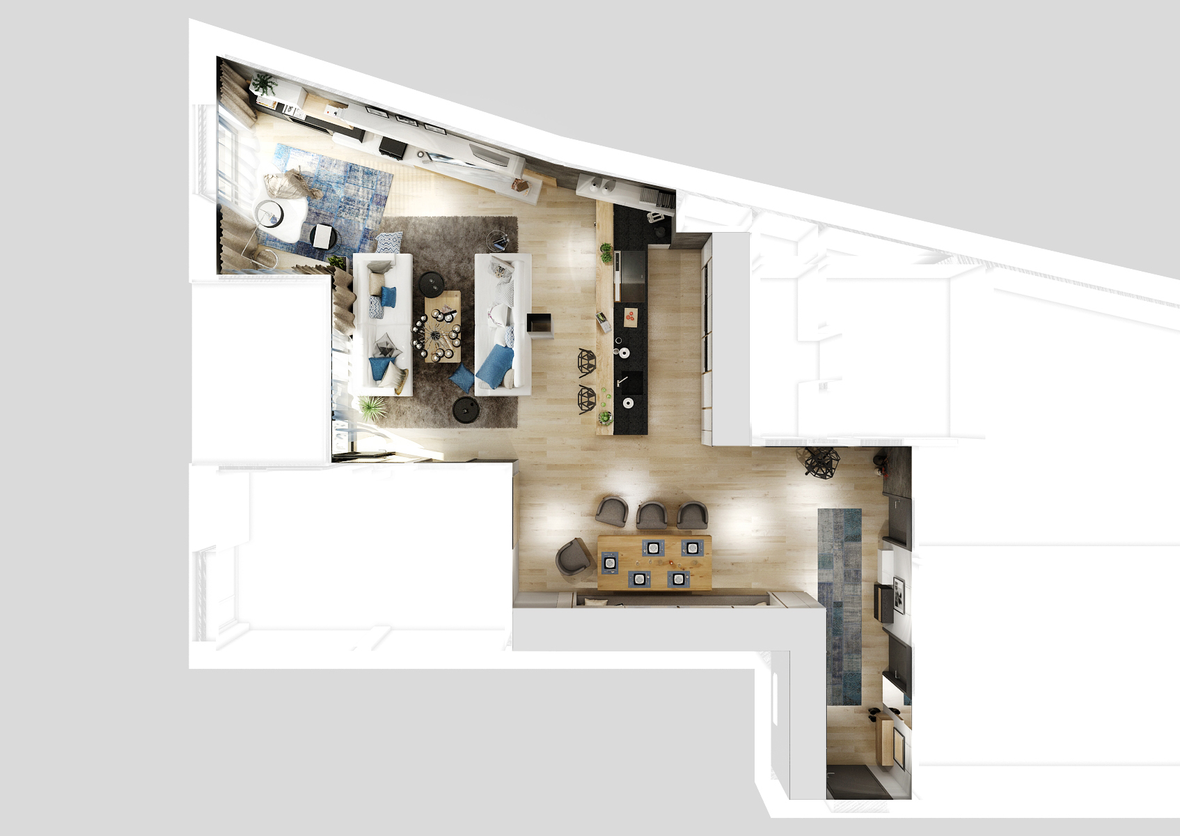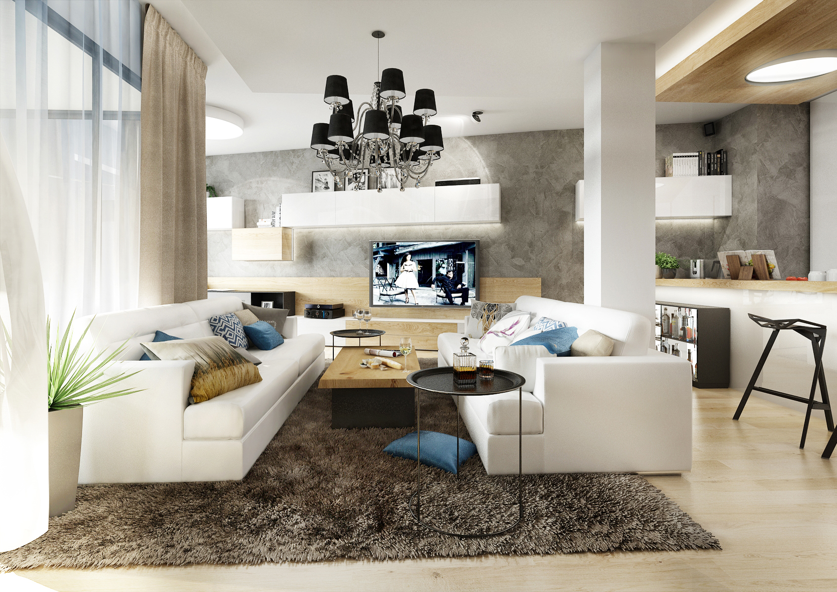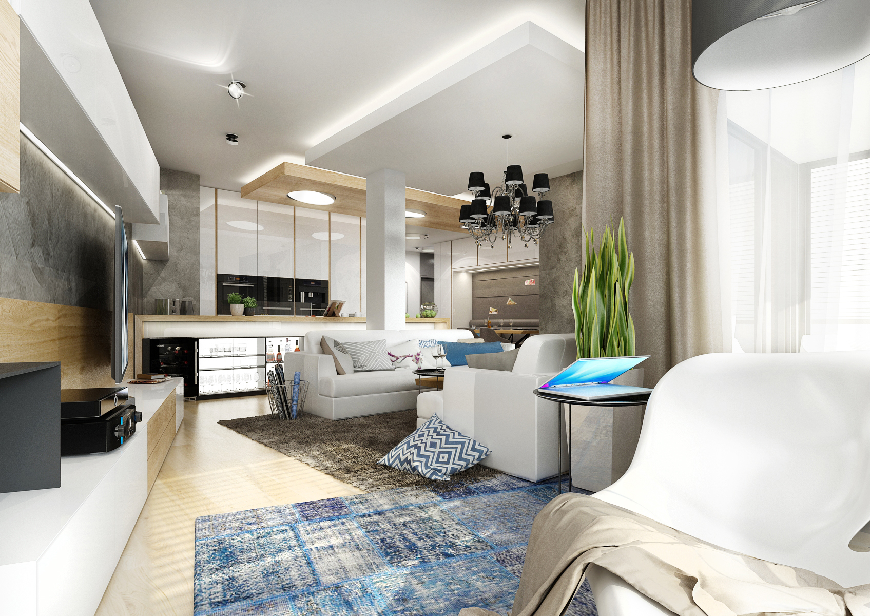 Living room with kitchen and dining room in one common area