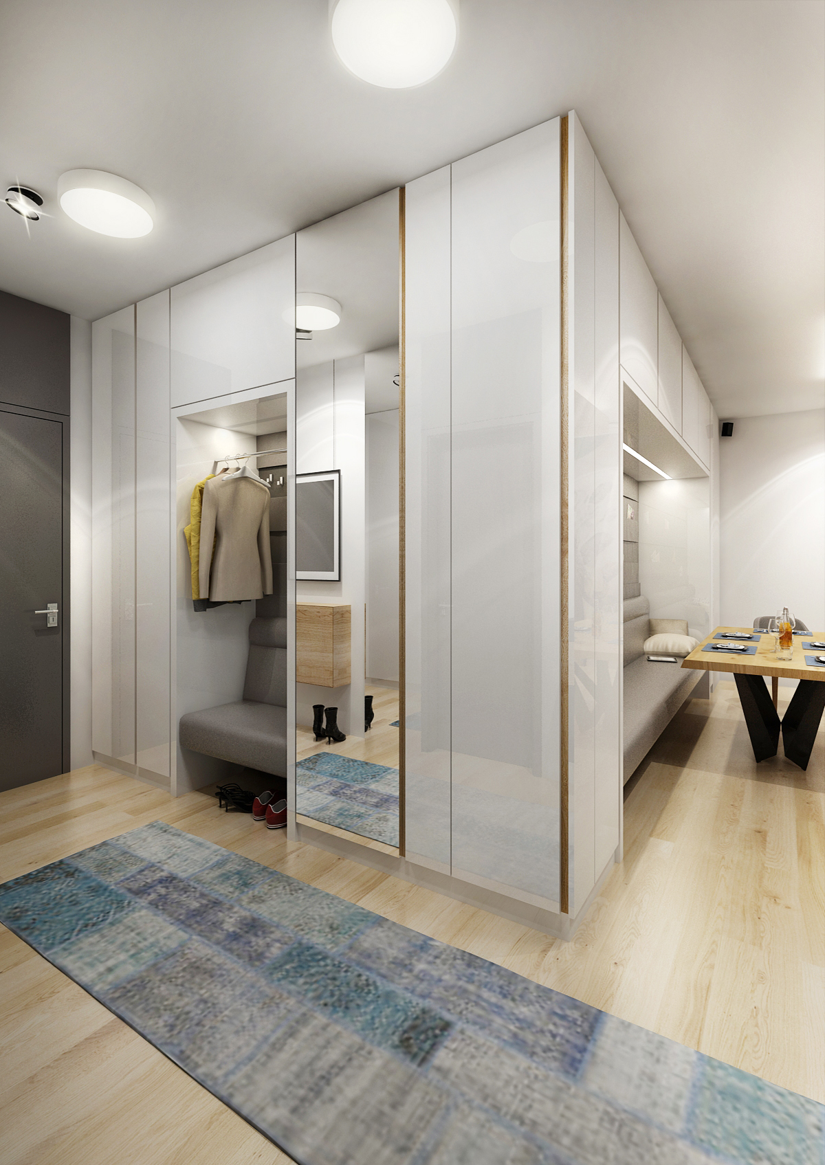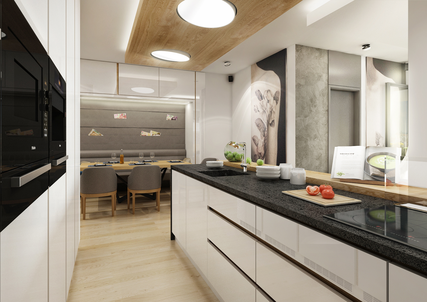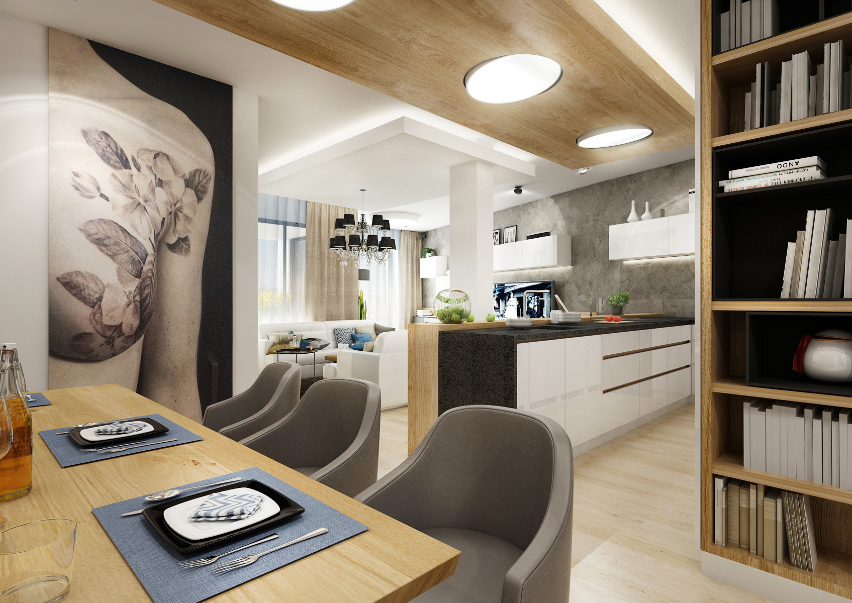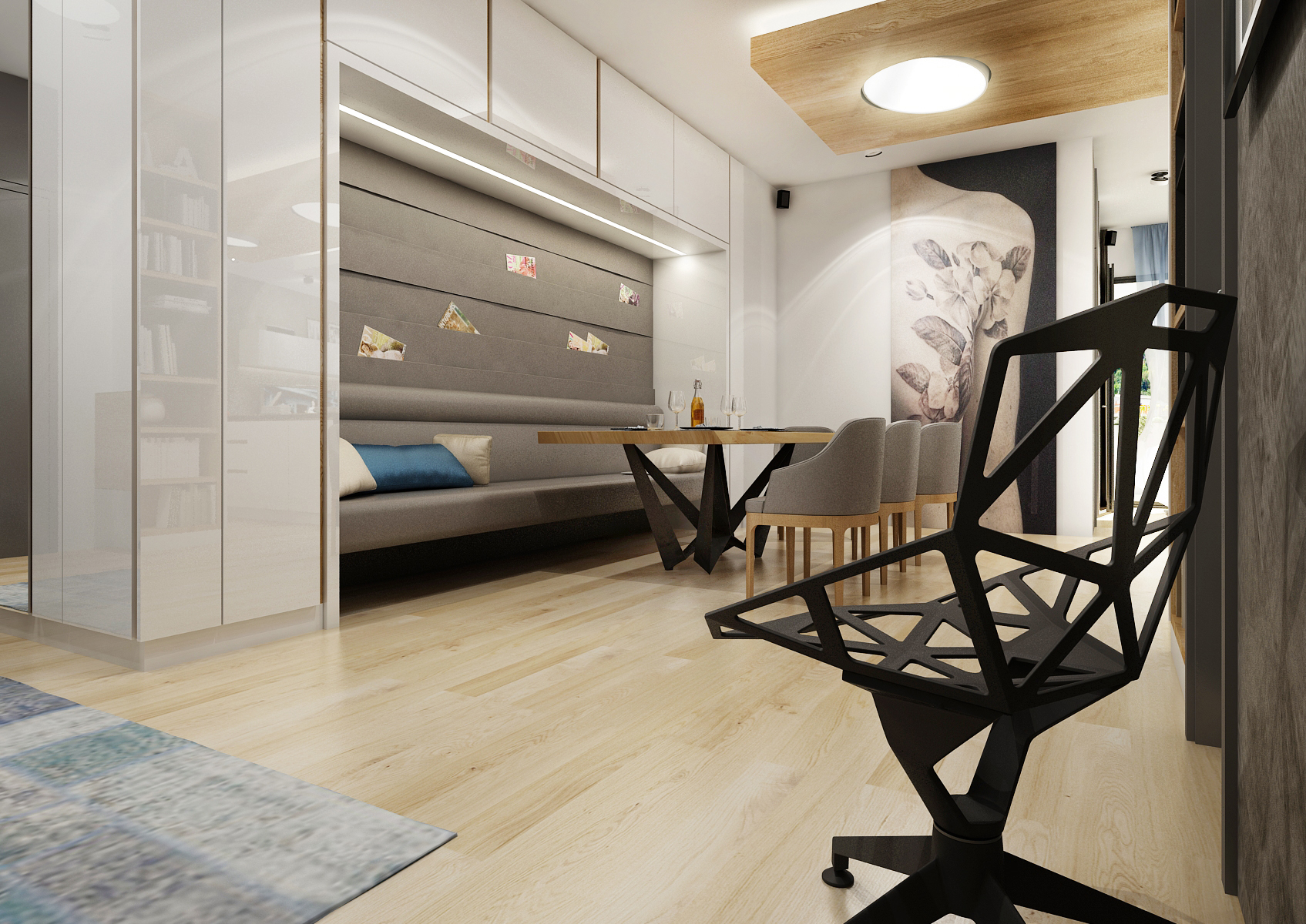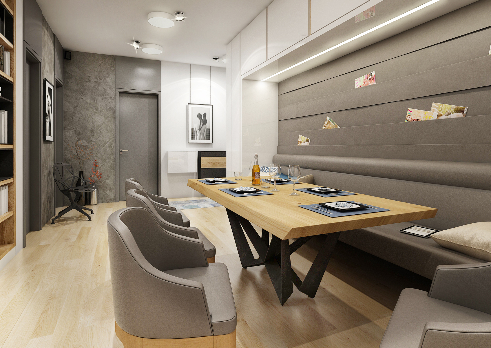 Living space with an open layout focused on the male user. There is a bar with a built-in wine cellar and backlit show-case in the kitchen unit with a long island. The dining table has a solid oak top on a black metal base. There is an upholstered built-in bench in a nice closet and subtle club chairs for sitting. The men's character of the rooms is shaped by earthy colors with an accent of blue and decent wallpaper with a female nude.