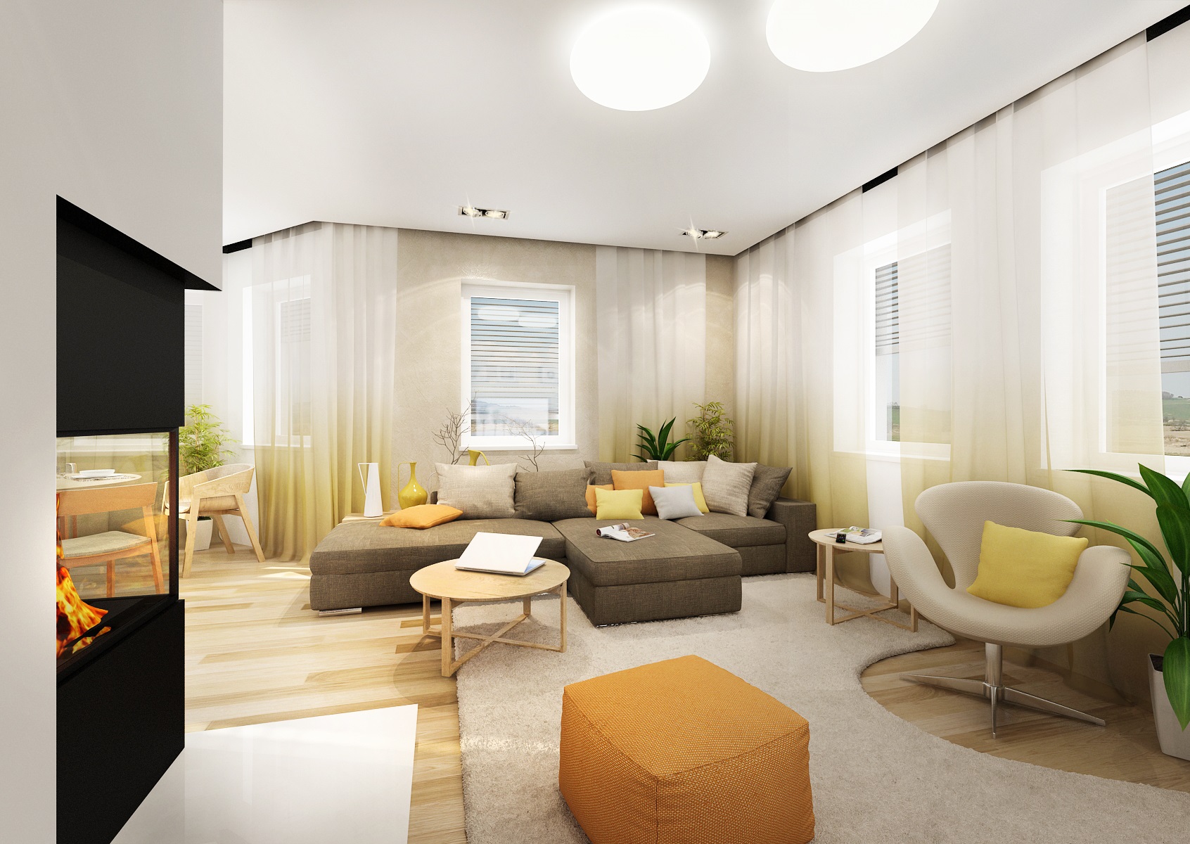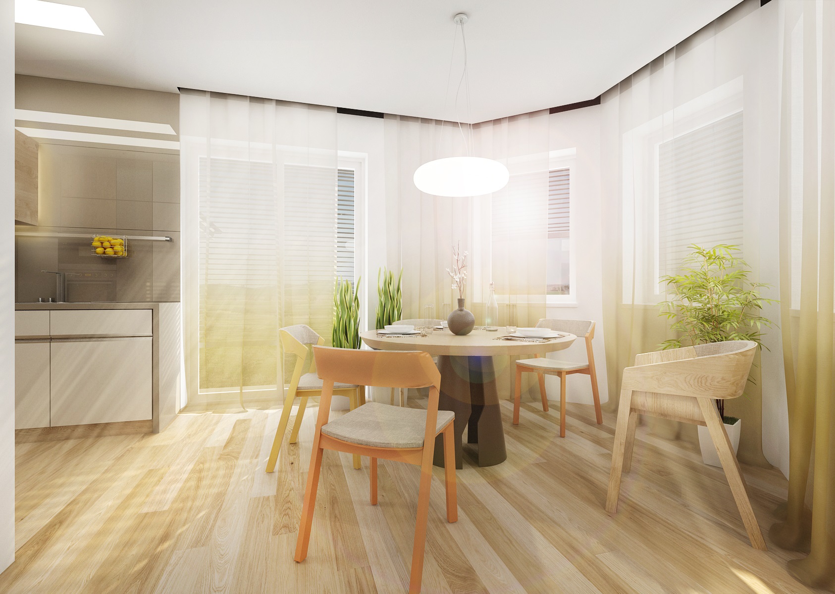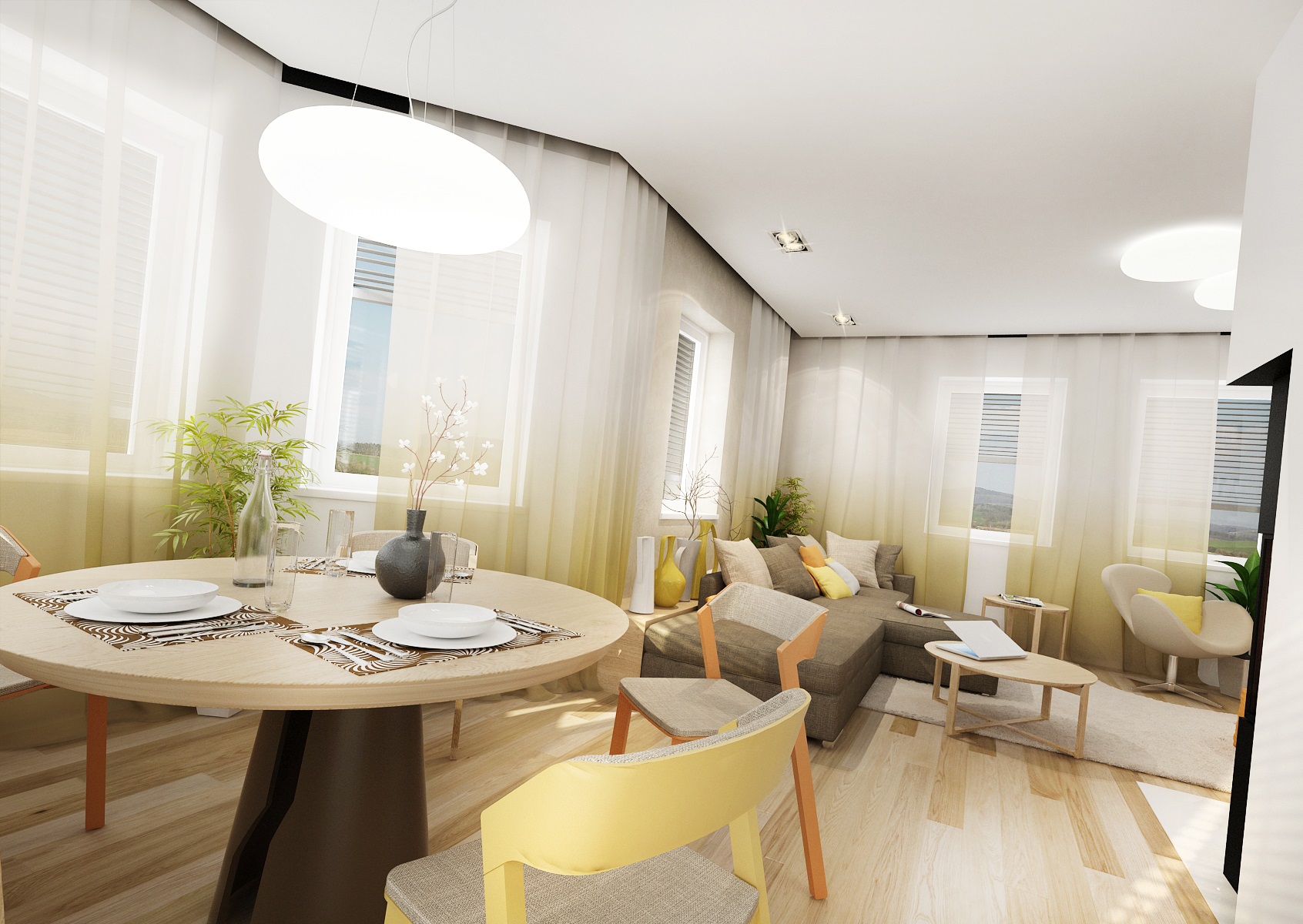 Modern interior of a bungalow is decorated in mostly natural tones. The curtains are untraditionally with a yellow-brown gradien and at the dining table with a design base we found variations of TON chairs.