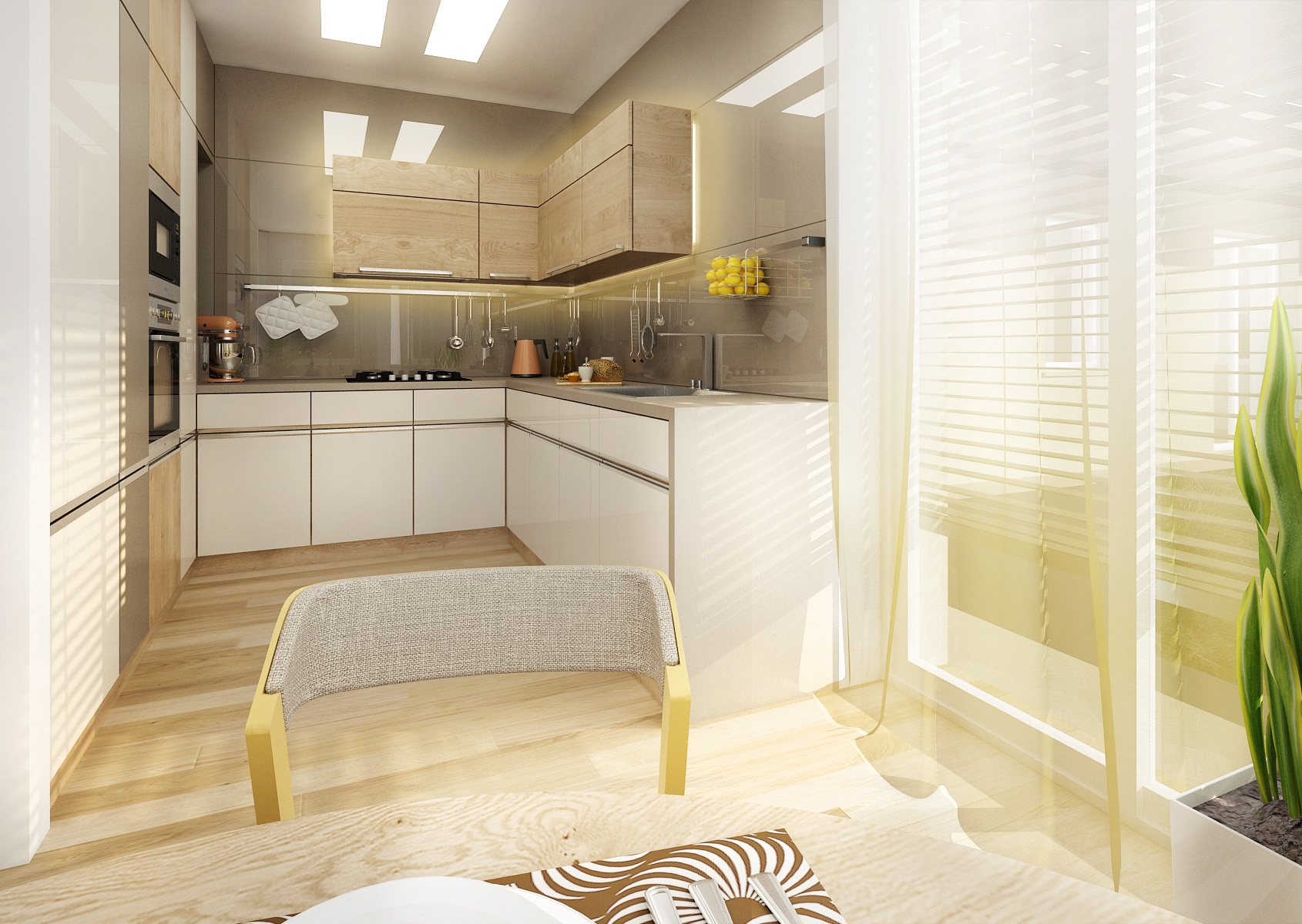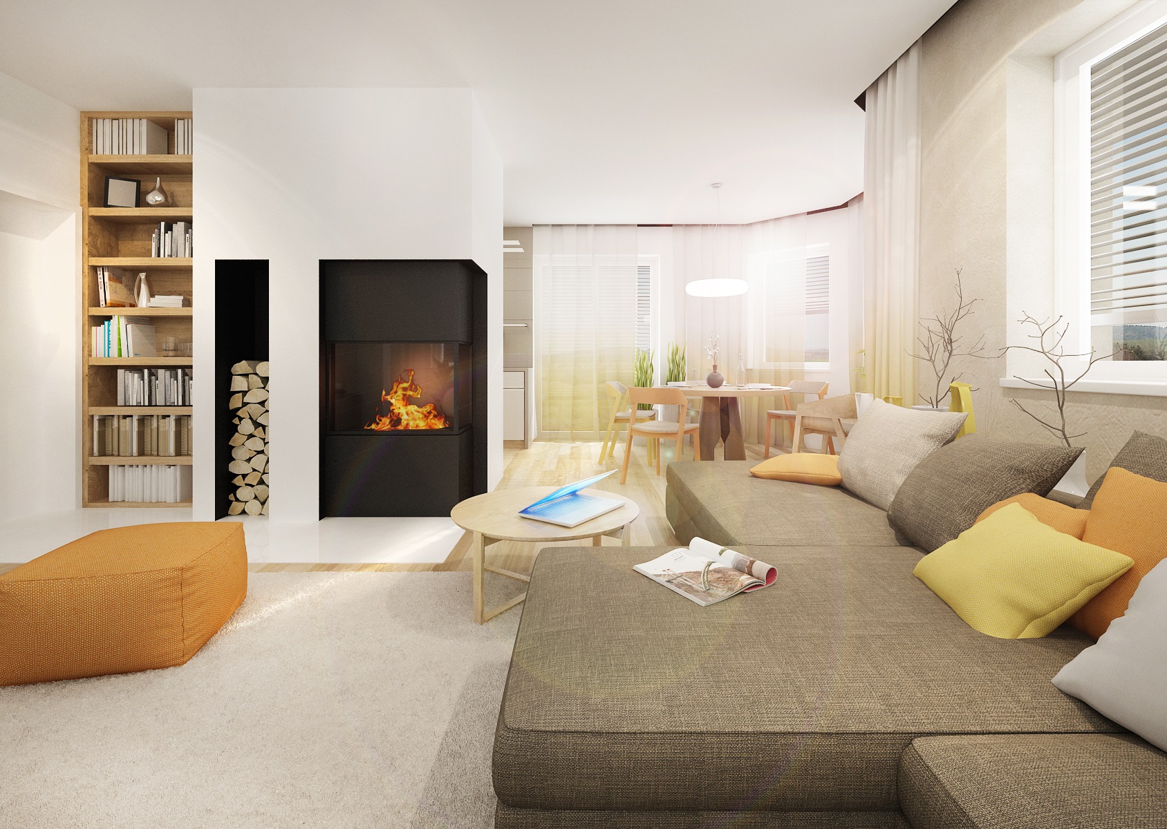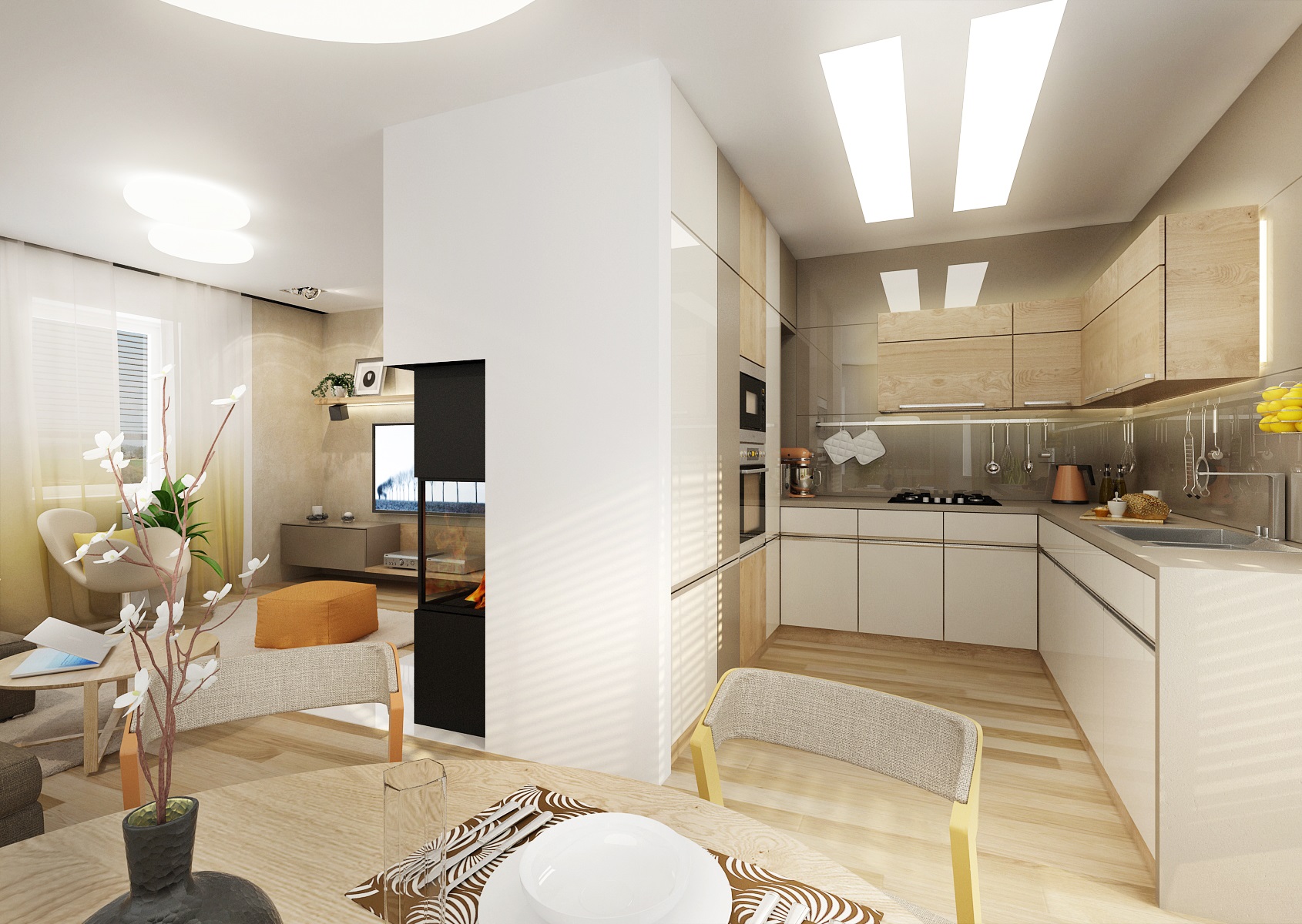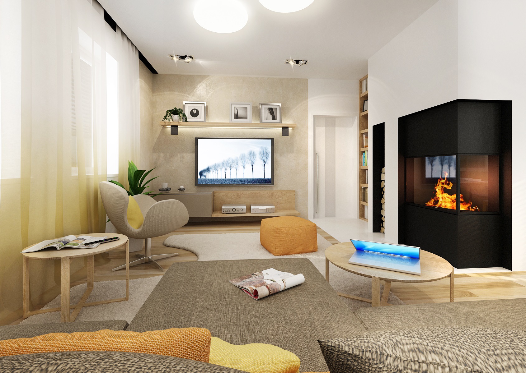 Modern interior of a bungalow is decorated in mostly natural tones. The curtains are untraditionally with a yellow-brown gradien and at the dining table with a design base we found variations of TON chairs.