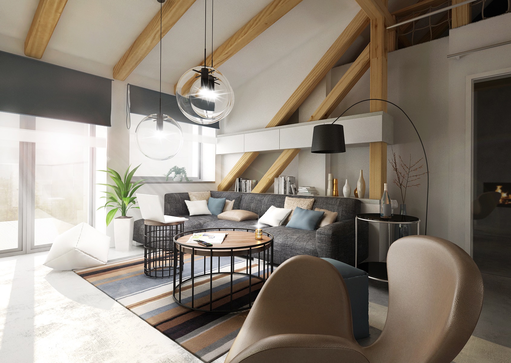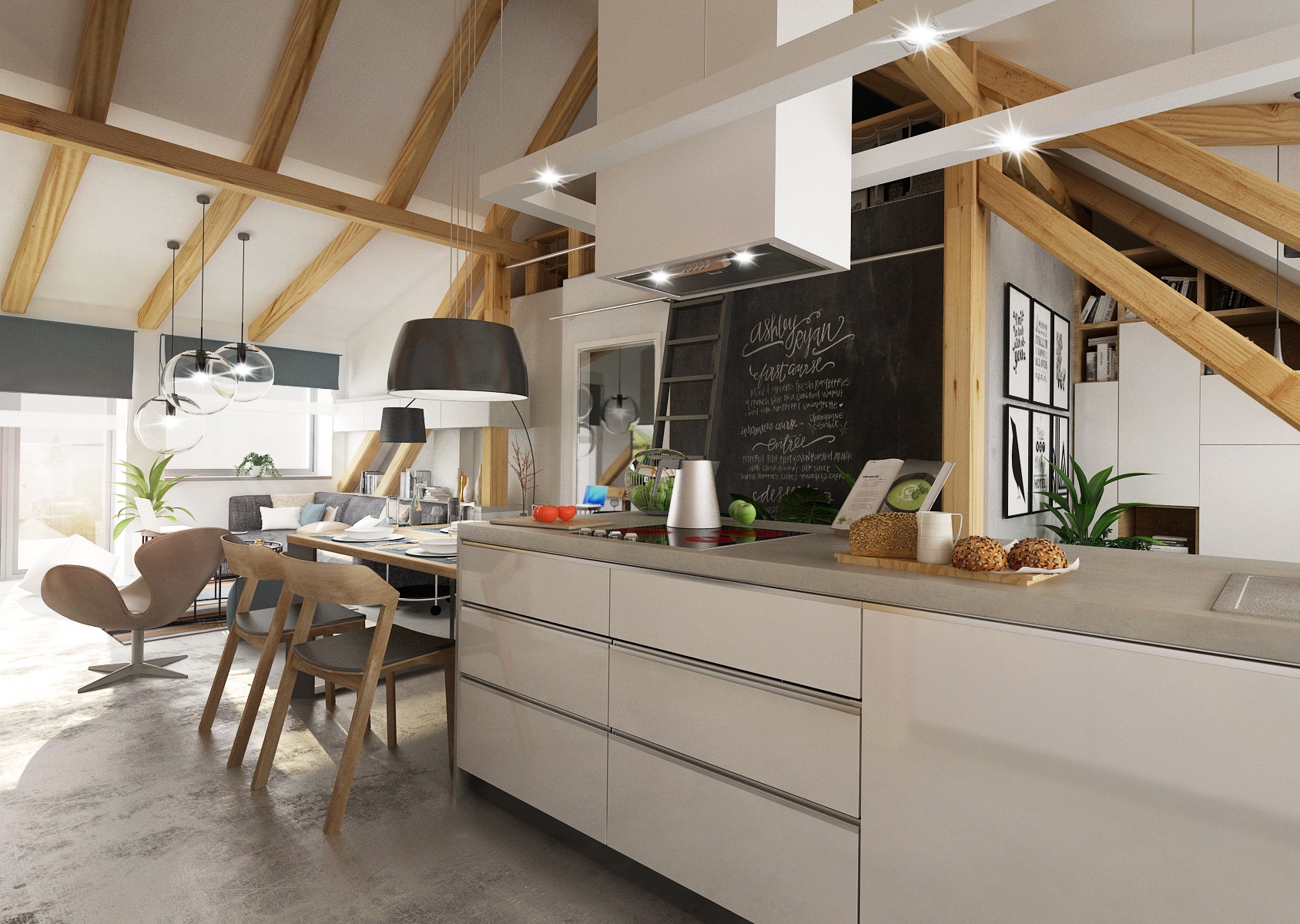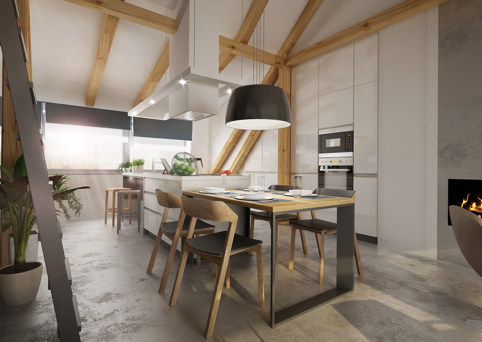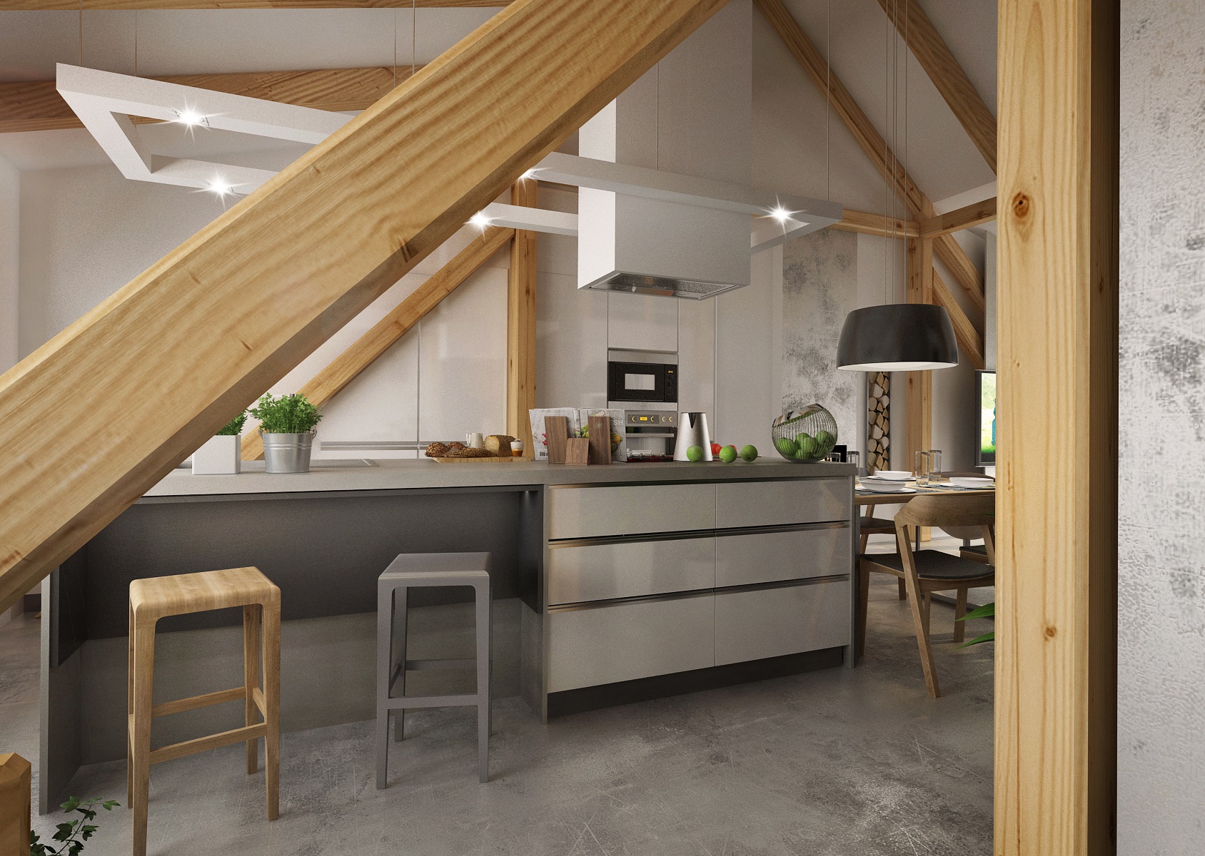 An attic apartment for a young couple with ceiling beams, in which the cement trowel, which is used both on the floor and on the walls plays a key role. Thanks to the height in the interior, we were able to place the bedroom on the open floor above the bathroom.
