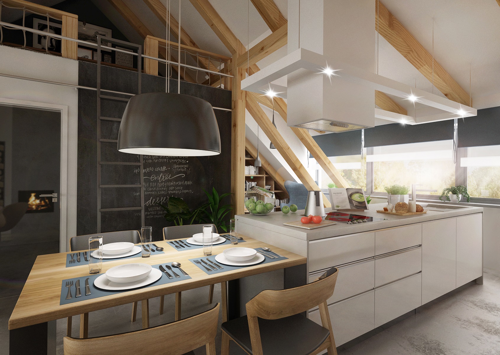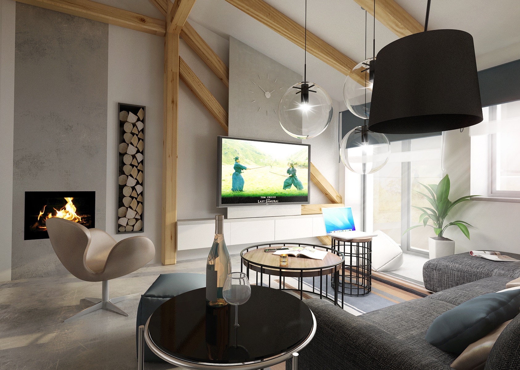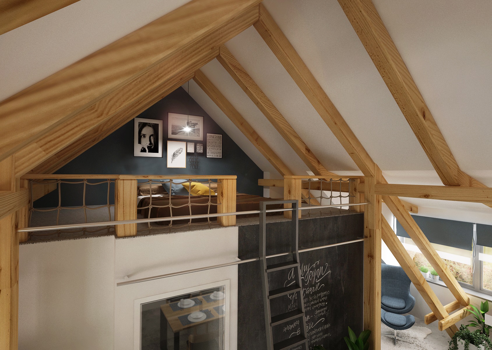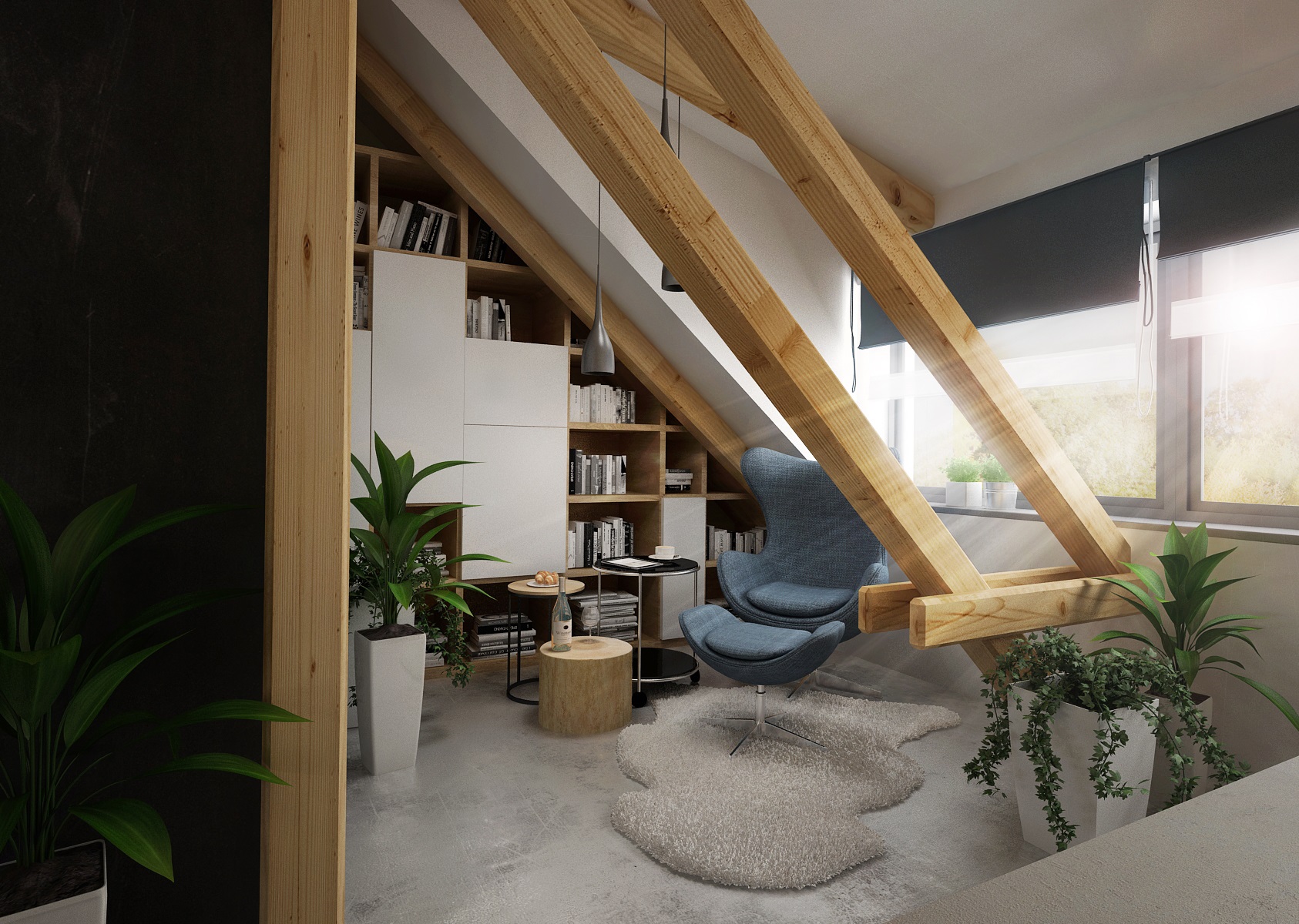 An attic apartment for a young couple with ceiling beams, in which the cement trowel, which is used both on the floor and on the walls plays a key role. Thanks to the height in the interior, we were able to place the bedroom on the open floor above the bathroom.