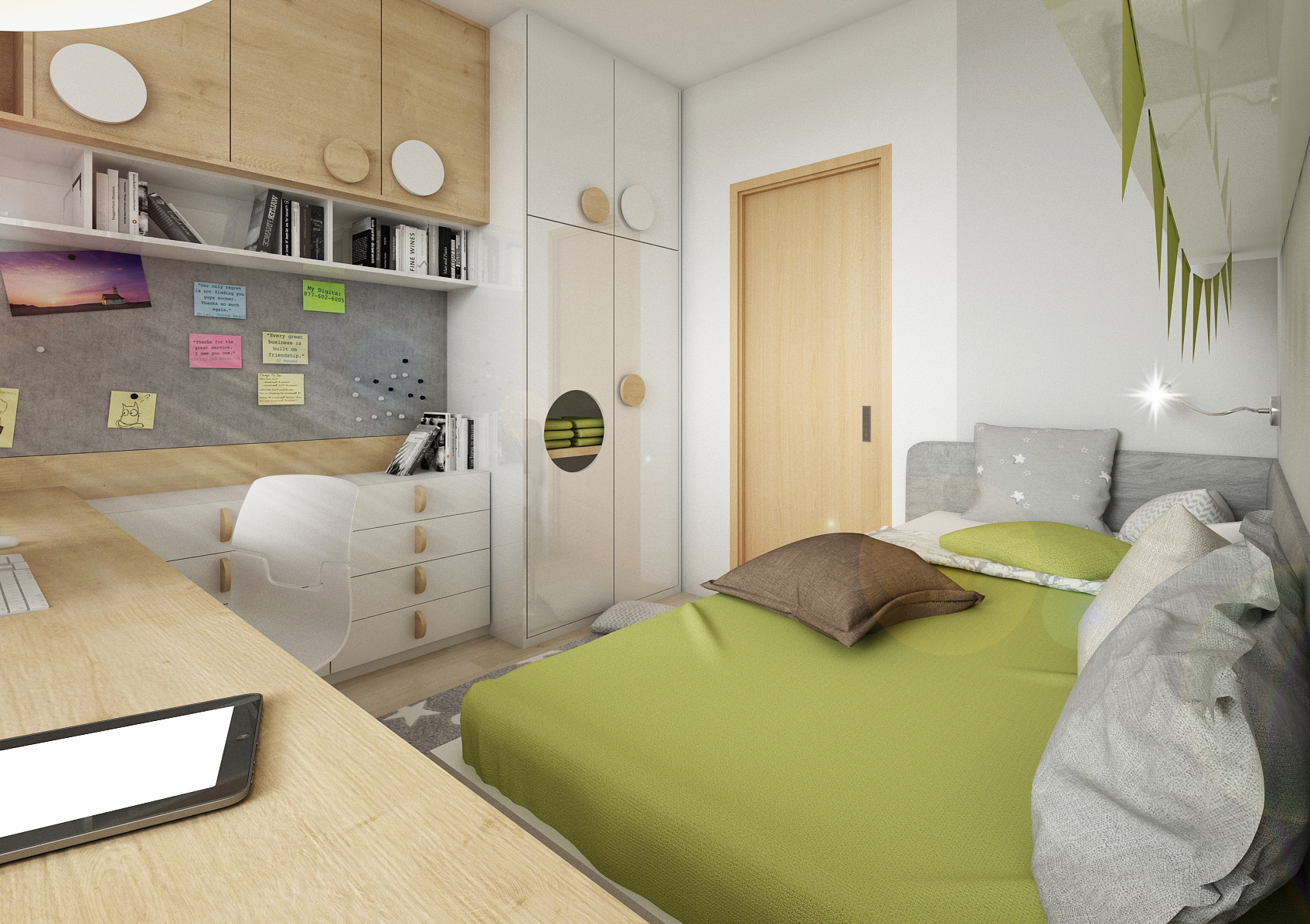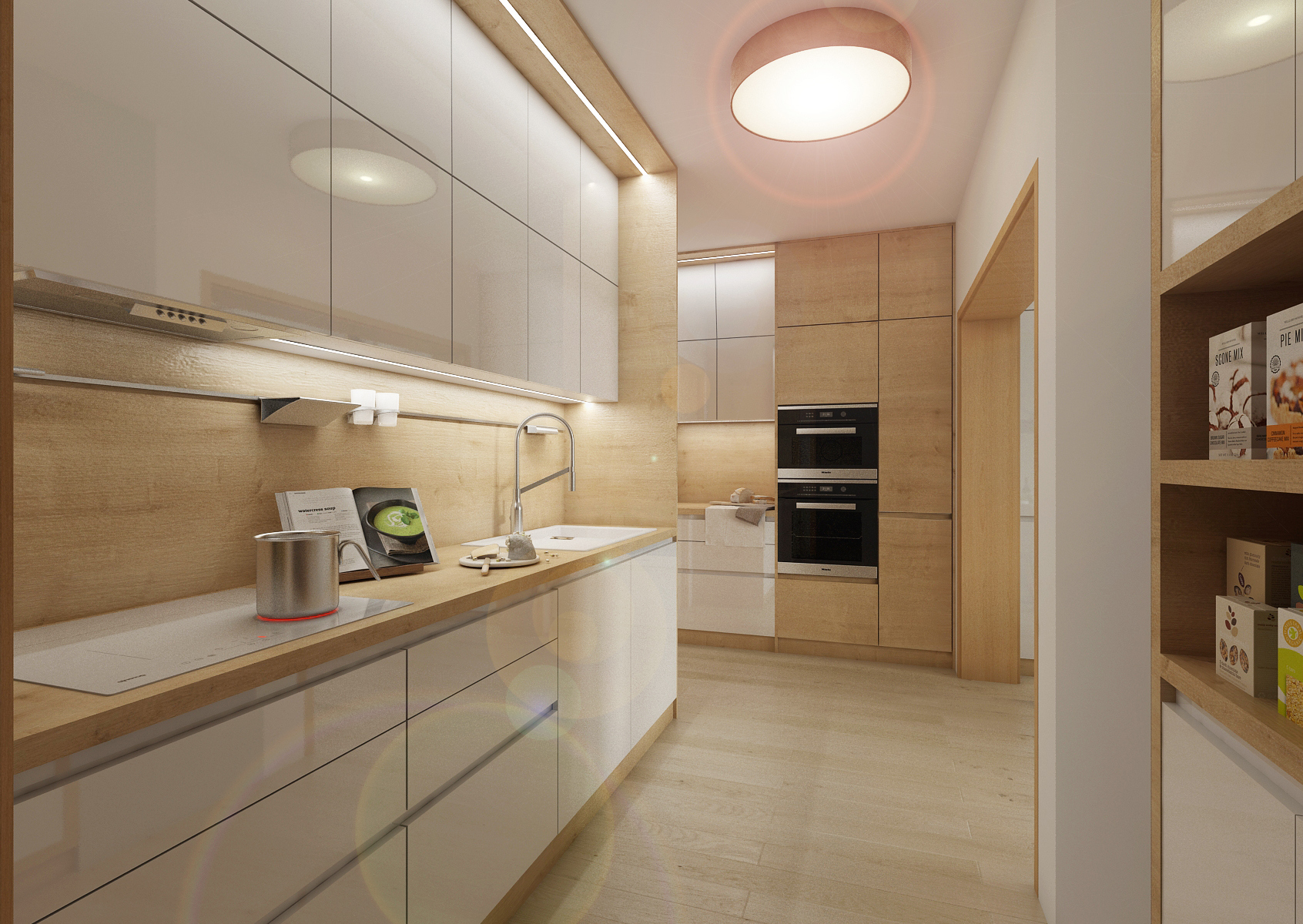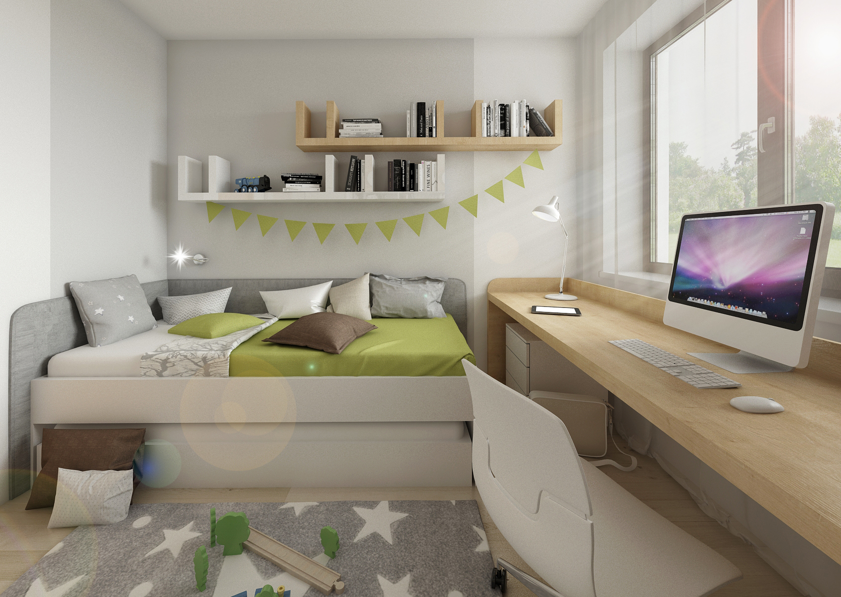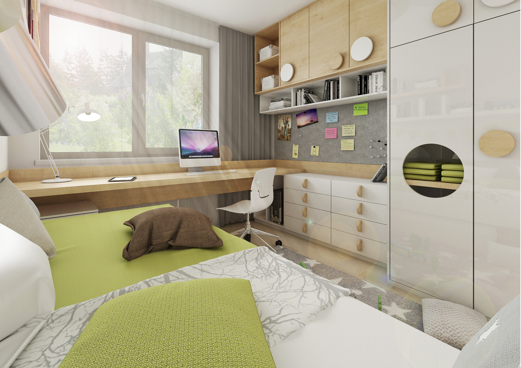 A small apartment with a kitchenette can also be bright and spacious, the furniture in a combination of white lacquer and light oak freely transitions from the kitchen to the living room. This room also serves as a bedroom. The space for the kitchen has been used to the maximum, the cabinets reach the ceiling, the storage spaces are always suitable. The lightness is also supported by the gray color on the upholstery and painting. Only the armchair and textiles on the sofa bed for everyday sleeping stand out. The same material is repeated in the children's room, custom-made furniture fills every bit of space. A large work desk and library is an essential part of the student room. The bed is a sofa bed, it hides a pull-out second bed for occasional visits.
