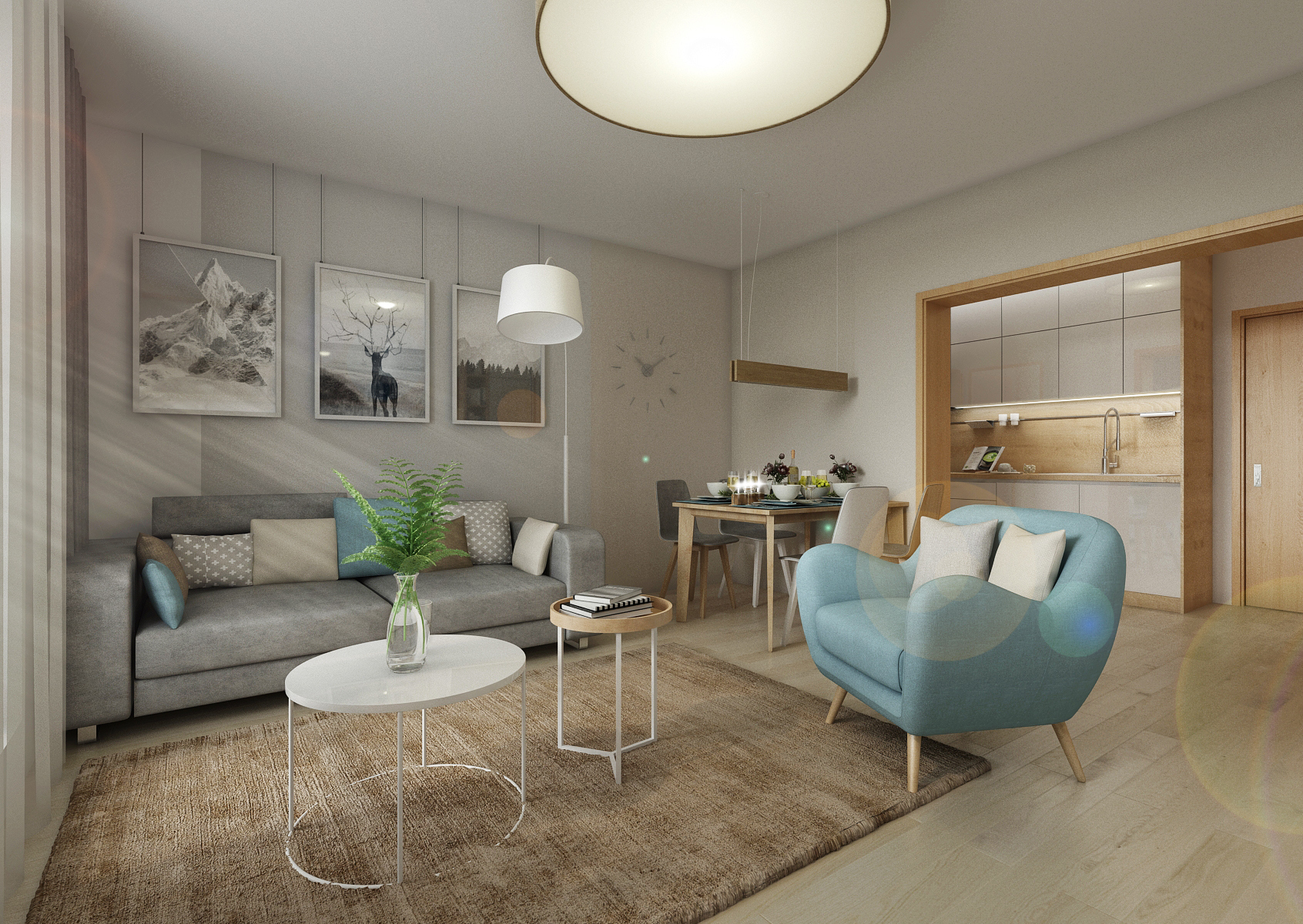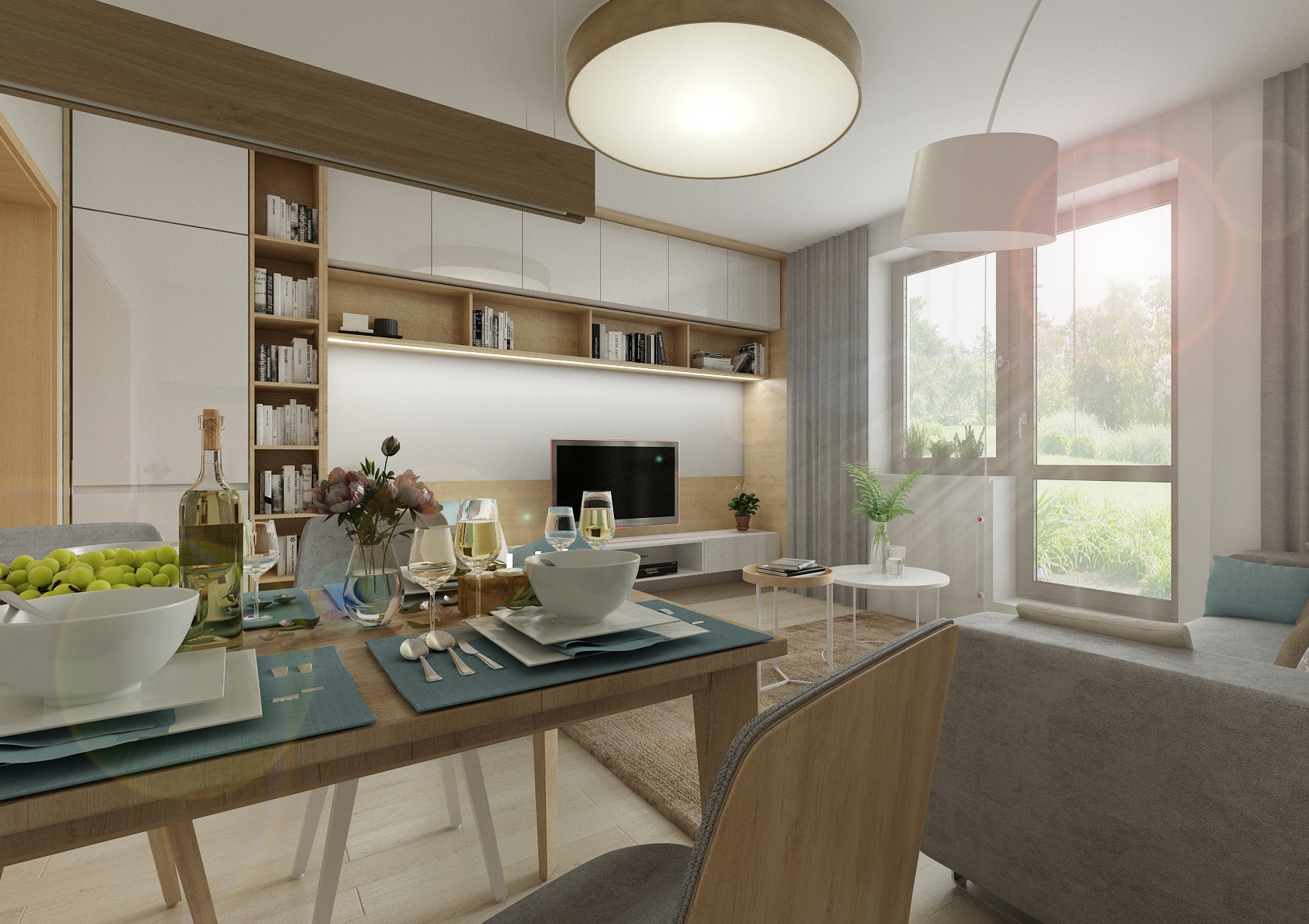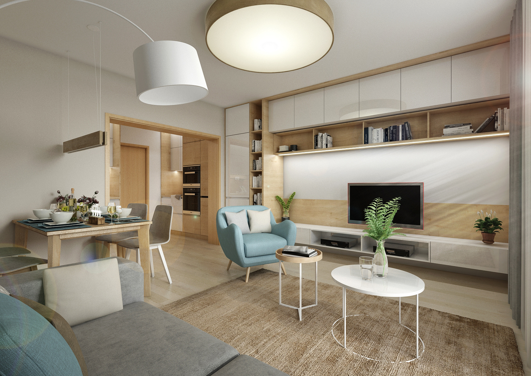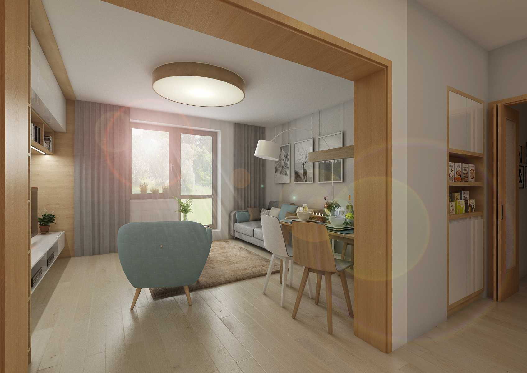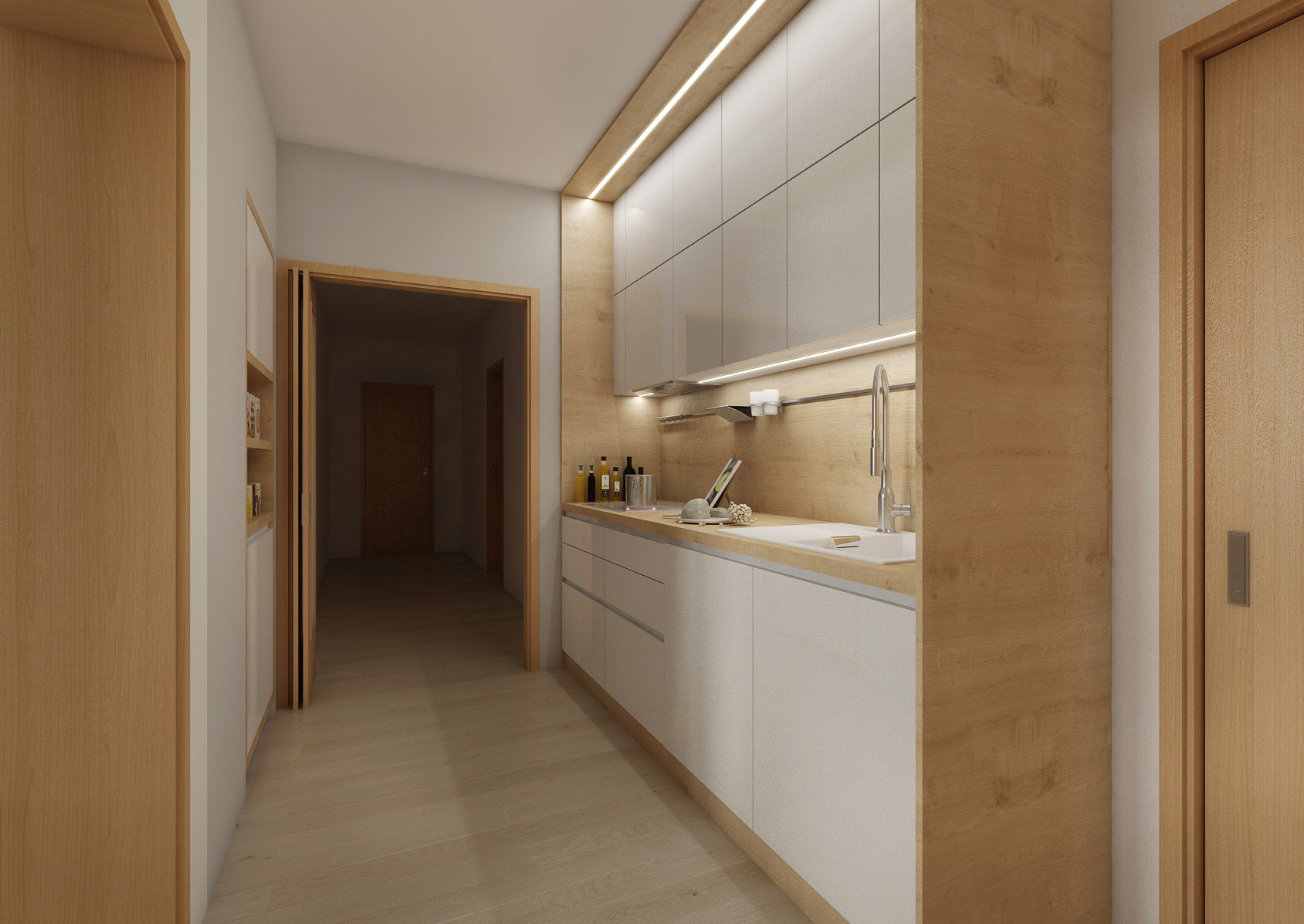 A small apartment with a kitchenette can also be bright and spacious, the furniture in a combination of white lacquer and light oak freely transitions from the kitchen to the living room. This room also serves as a bedroom. The space for the kitchen has been used to the maximum, the cabinets reach the ceiling, the storage spaces are always suitable. The lightness is also supported by the gray color on the upholstery and painting. Only the armchair and textiles on the sofa bed for everyday sleeping stand out. The same material is repeated in the children's room, custom-made furniture fills every bit of space. A large work desk and library is an essential part of the student room. The bed is a sofa bed, it hides a pull-out second bed for occasional visits.