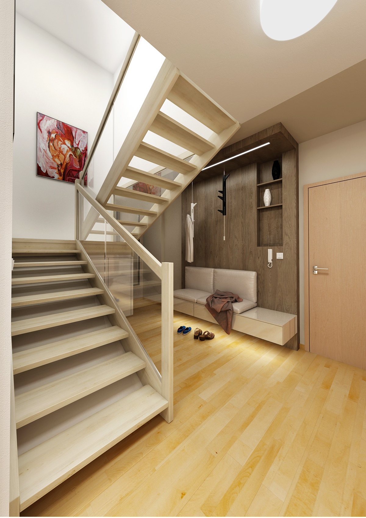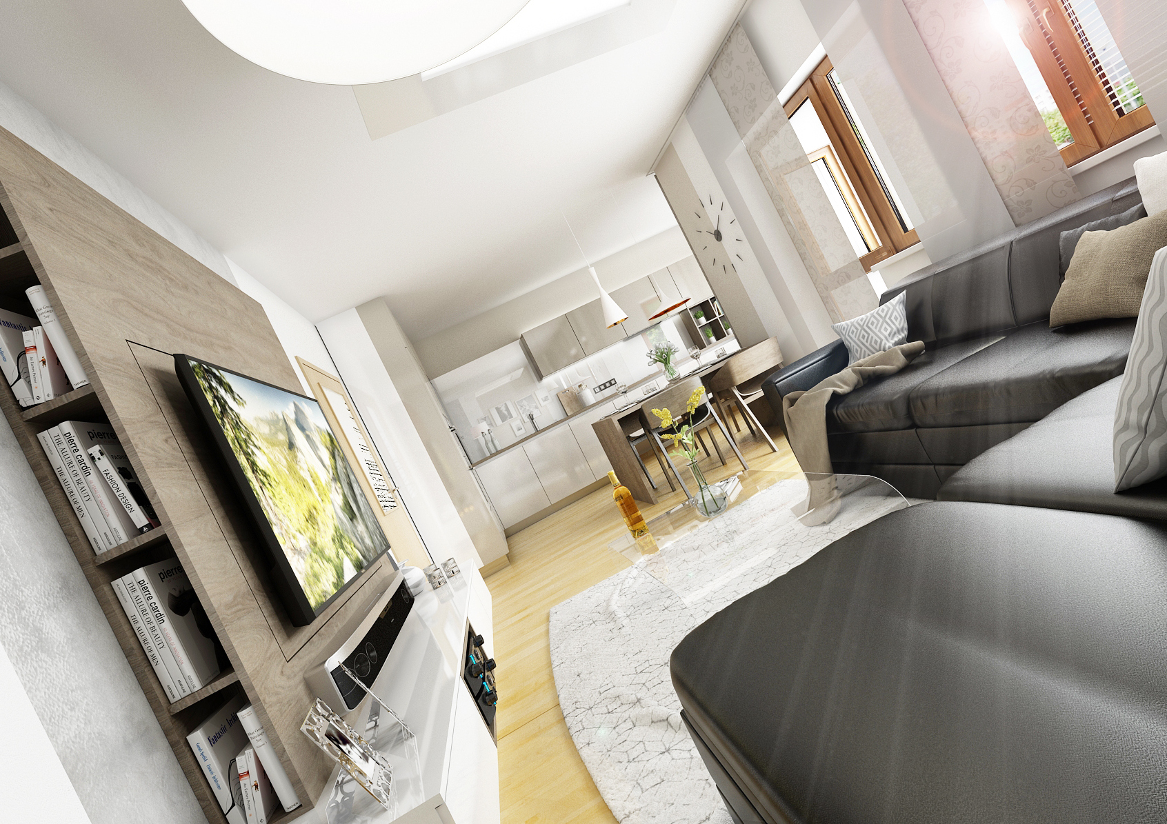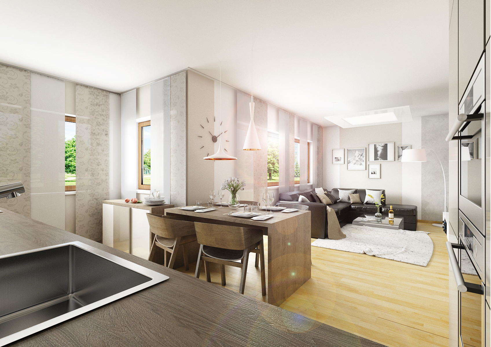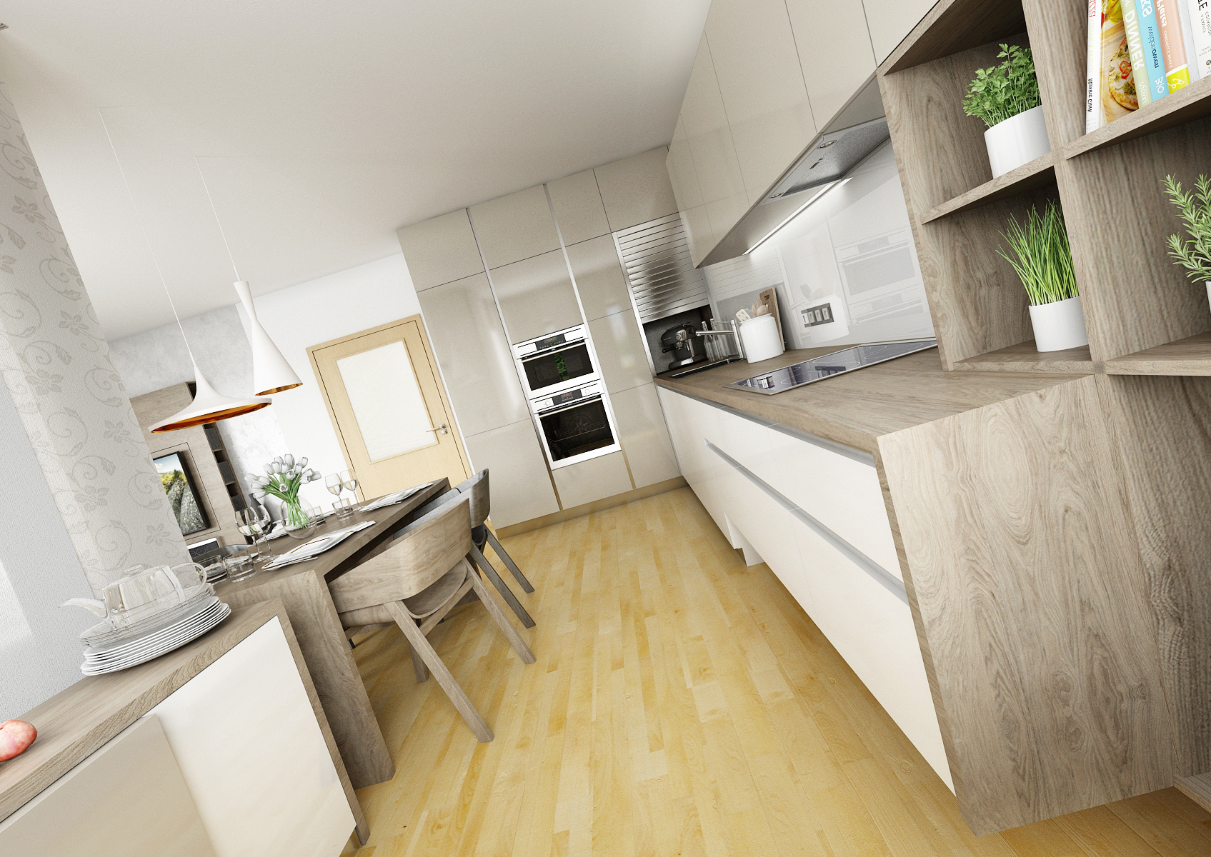 The ground floor of the family house was renovated, more precisely the entrance hall, kitchen and living room. By removing the partition, the two rooms were merged into one space. Glossy melamine from Kronospan in a combination of white and satin was used for the kitchen counter. Part of the kitchen is hung and optically expands the room. The screen is made of white Lacobel, which is very practical for maintenance. The coffee machine is hidden behind the stainless steel roller shutter in the corner, so it does not take up space on the worktop. There is also a kitchen plinth in stainless steel. The worktop, dining table and TV shelf are made of LTD in a structured stained oak decor. The materials are also repeated on the hall equipment. The depth of the TV wall allows you to rotate the TV (which is mounted on the panel), partially install the speaker and store books or DVDs.