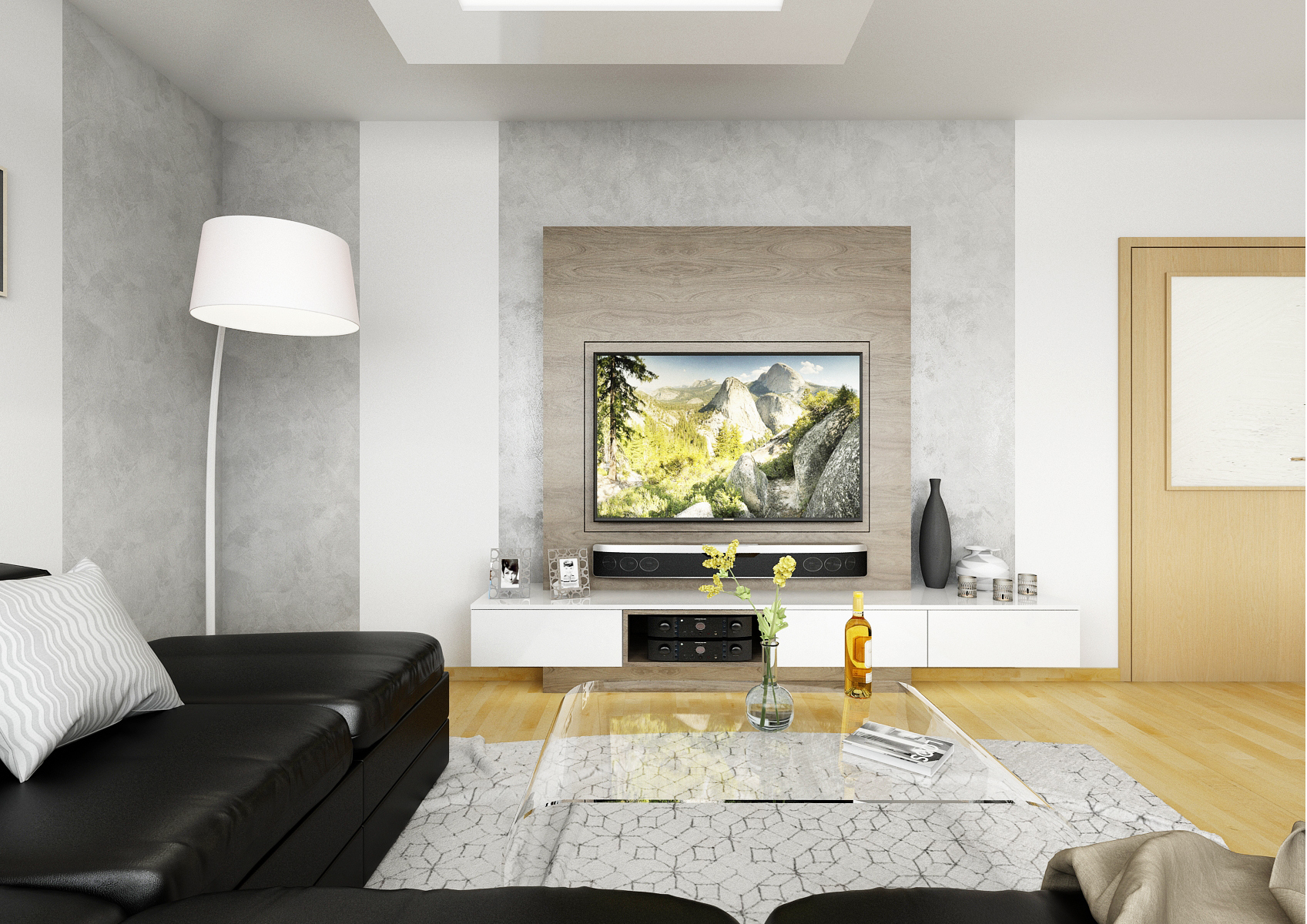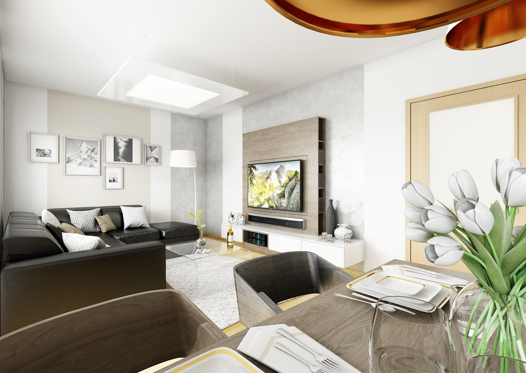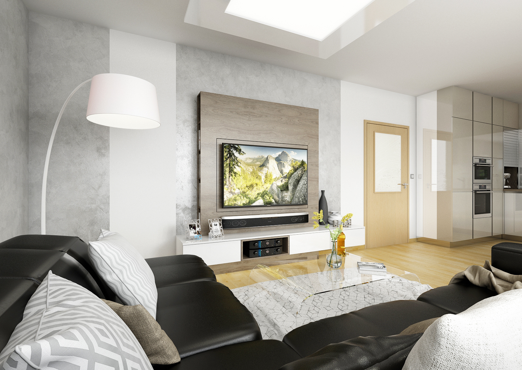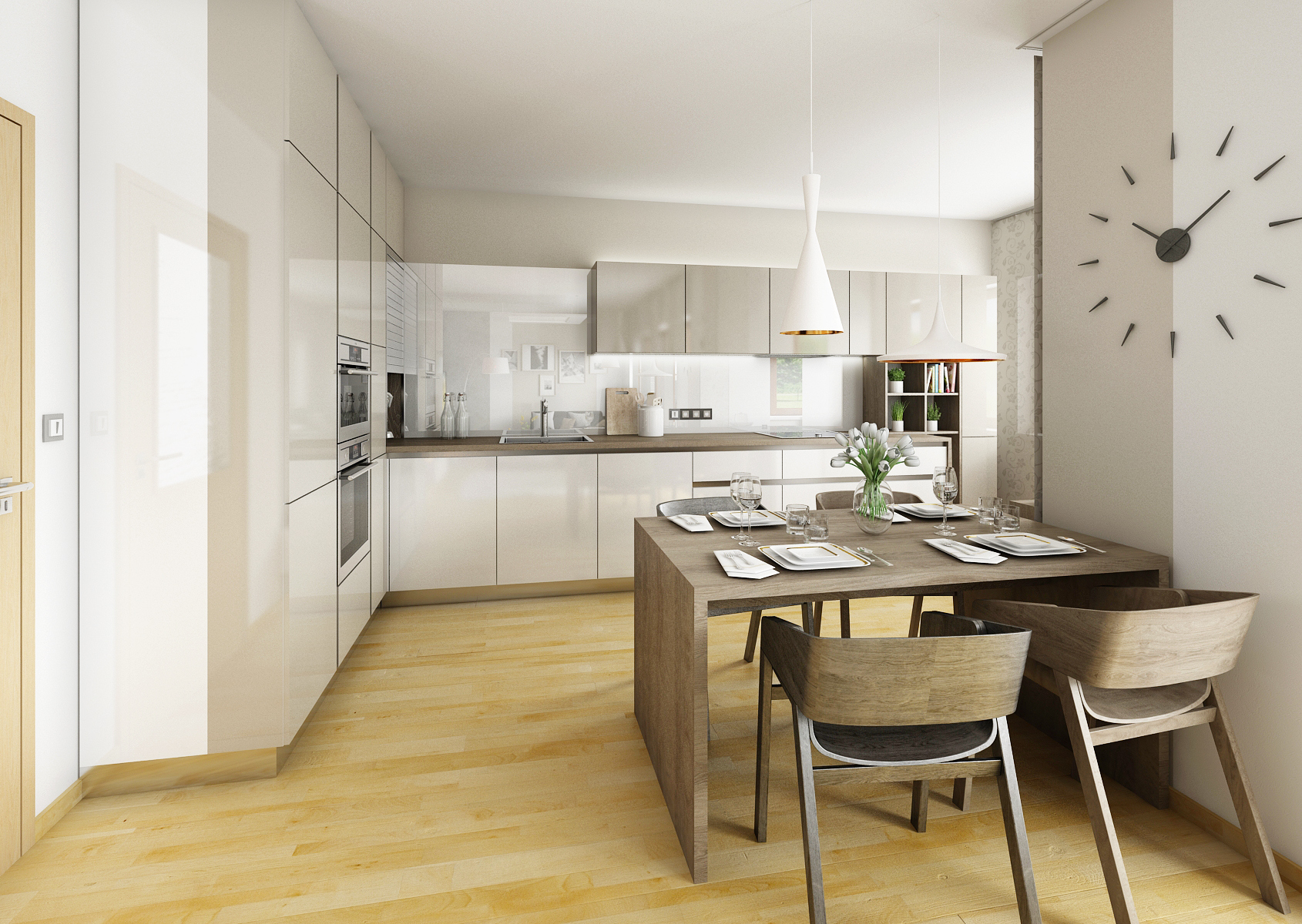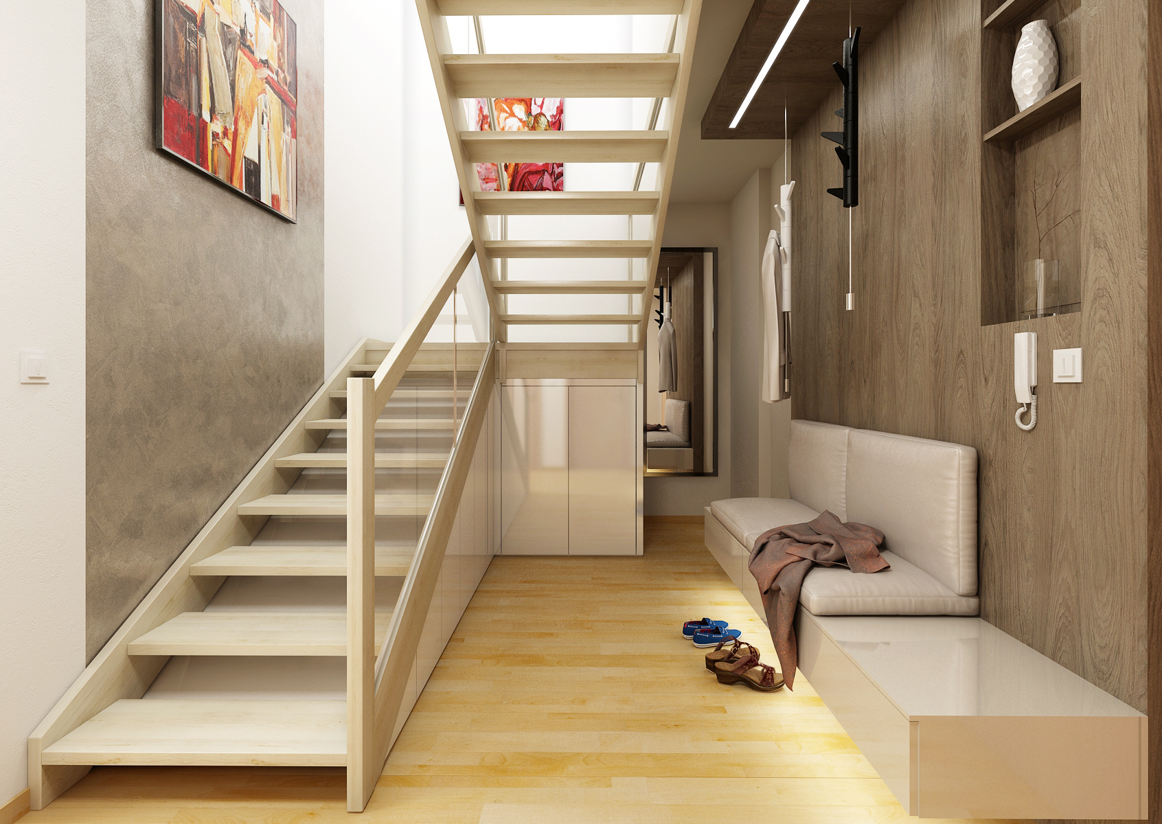 The ground floor of the family house was renovated, more precisely the entrance hall, kitchen and living room. By removing the partition, the two rooms were merged into one space. Glossy melamine from Kronospan in a combination of white and satin was used for the kitchen counter. Part of the kitchen is hung and optically expands the room. The screen is made of white Lacobel, which is very practical for maintenance. The coffee machine is hidden behind the stainless steel roller shutter in the corner, so it does not take up space on the worktop. There is also a kitchen plinth in stainless steel. The worktop, dining table and TV shelf are made of LTD in a structured stained oak decor. The materials are also repeated on the hall equipment. The depth of the TV wall allows you to rotate the TV (which is mounted on the panel), partially install the speaker and store books or DVDs.