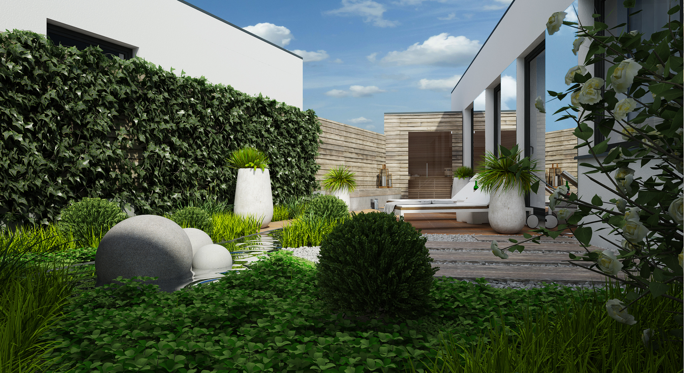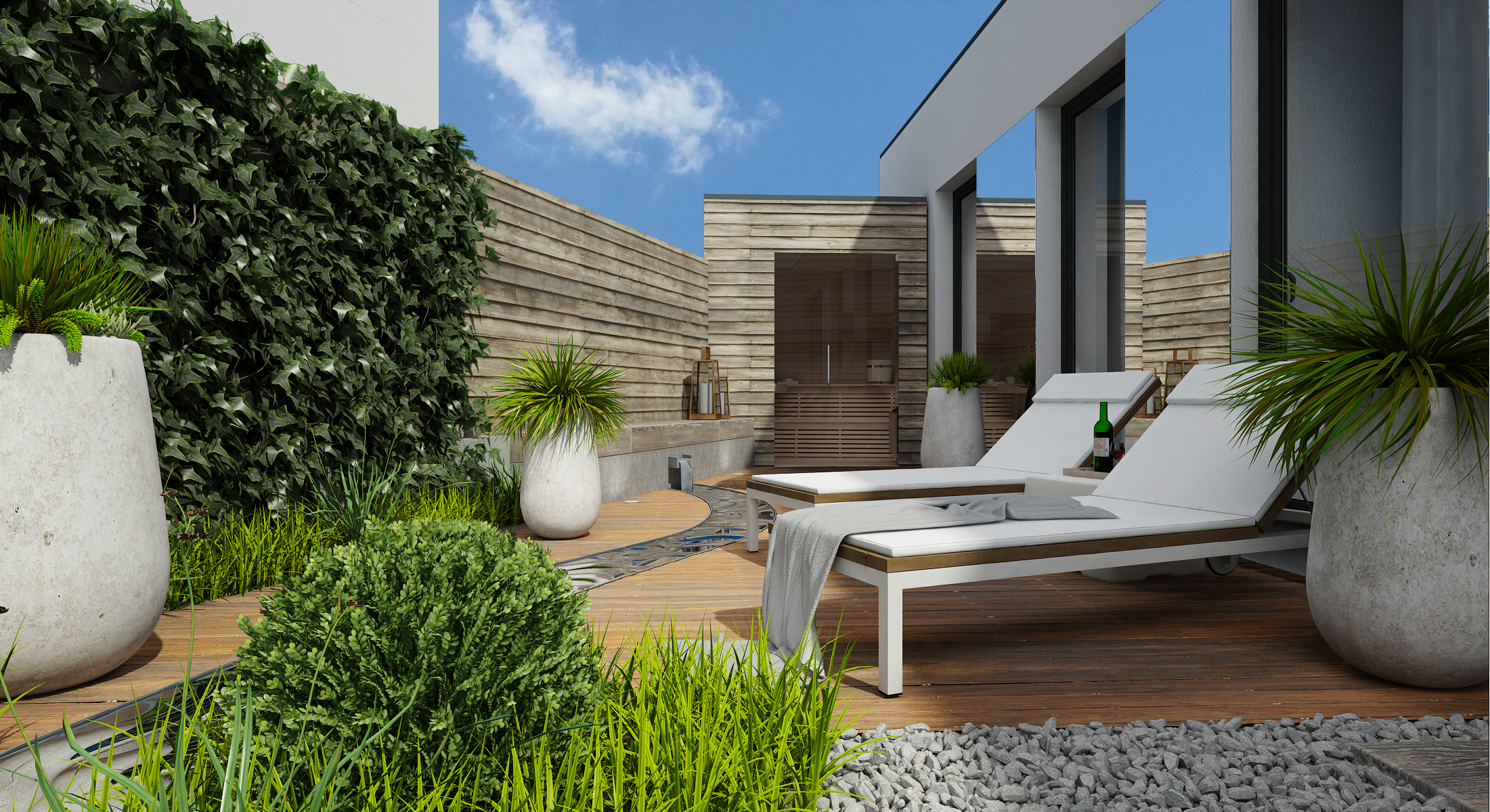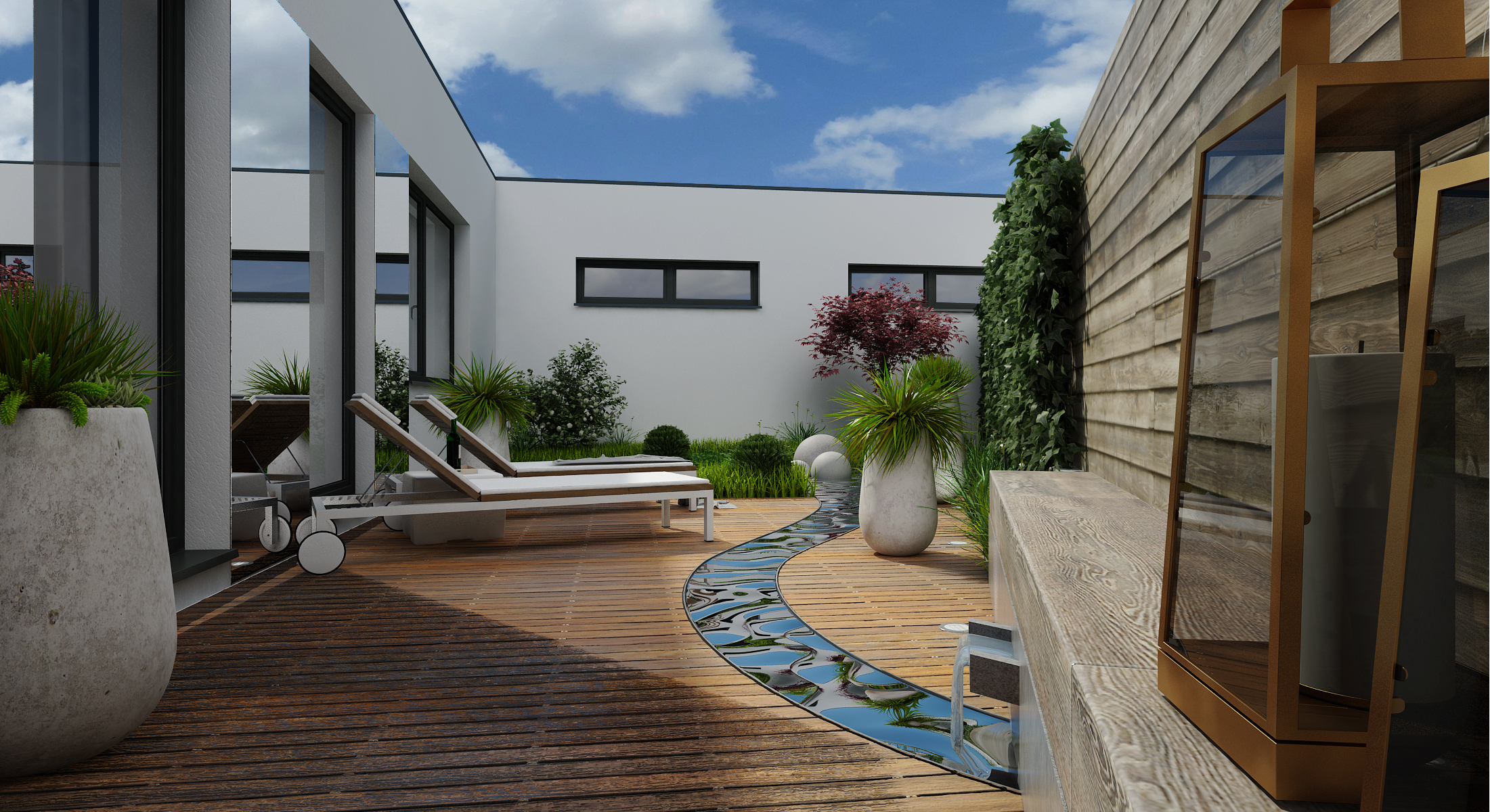 The second, a private terrace, adjoins the couple's bedroom. There is a sauna and an outdoor relaxation room. The moment of well-being is amplified by the noise of water flowing in an artificial riverbed. The water circulates thanks to ingenious piping and pumping.