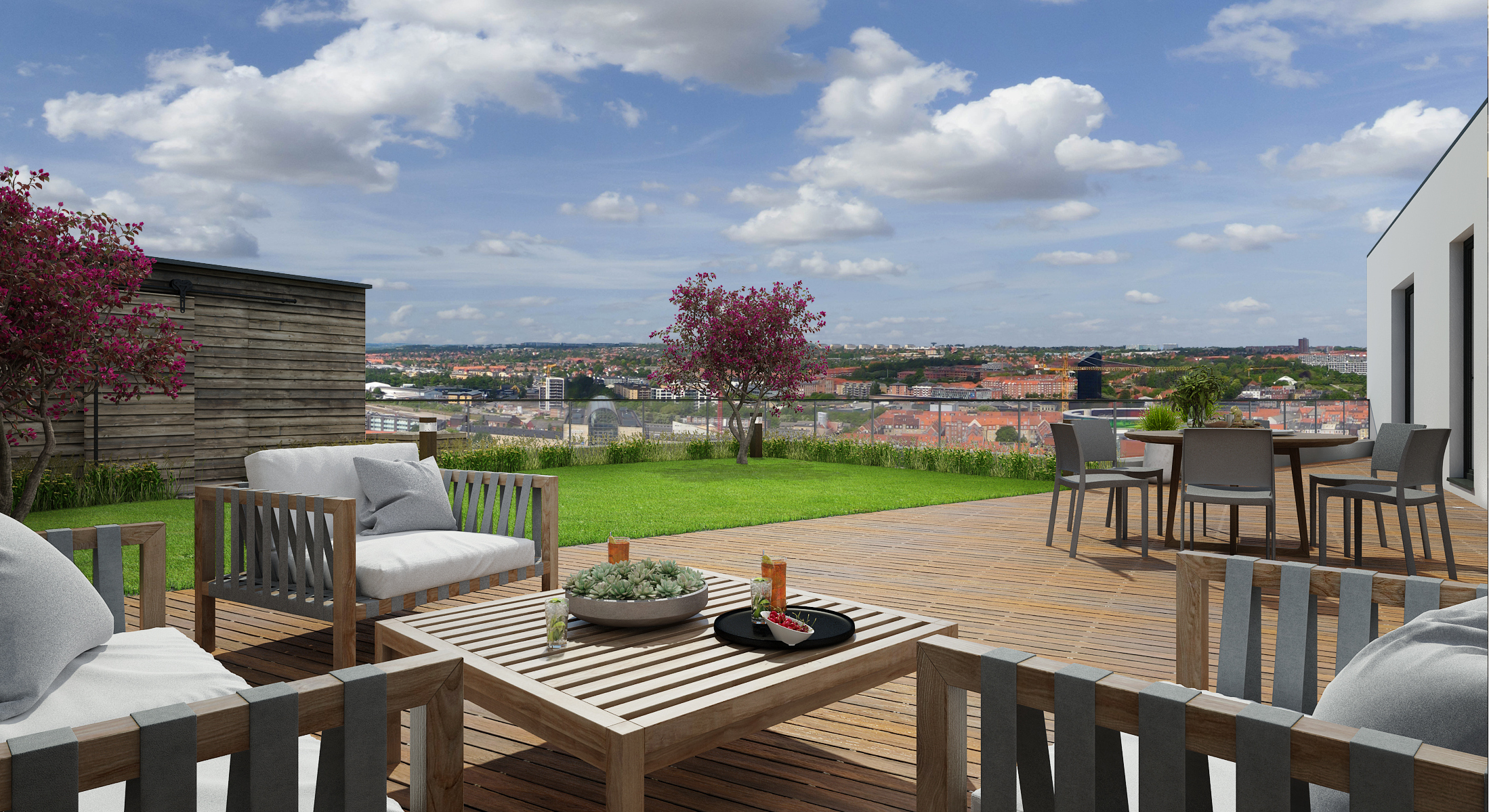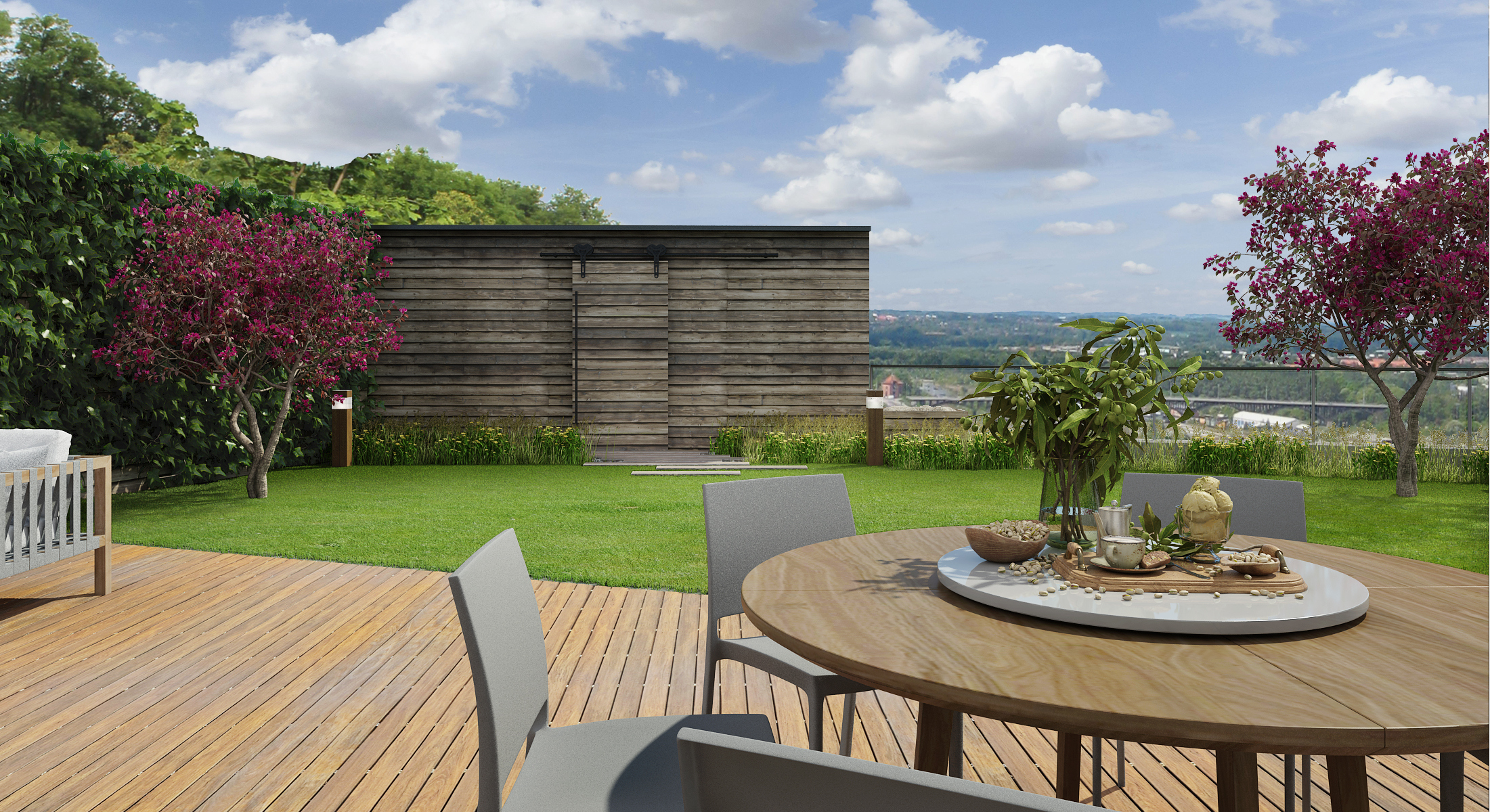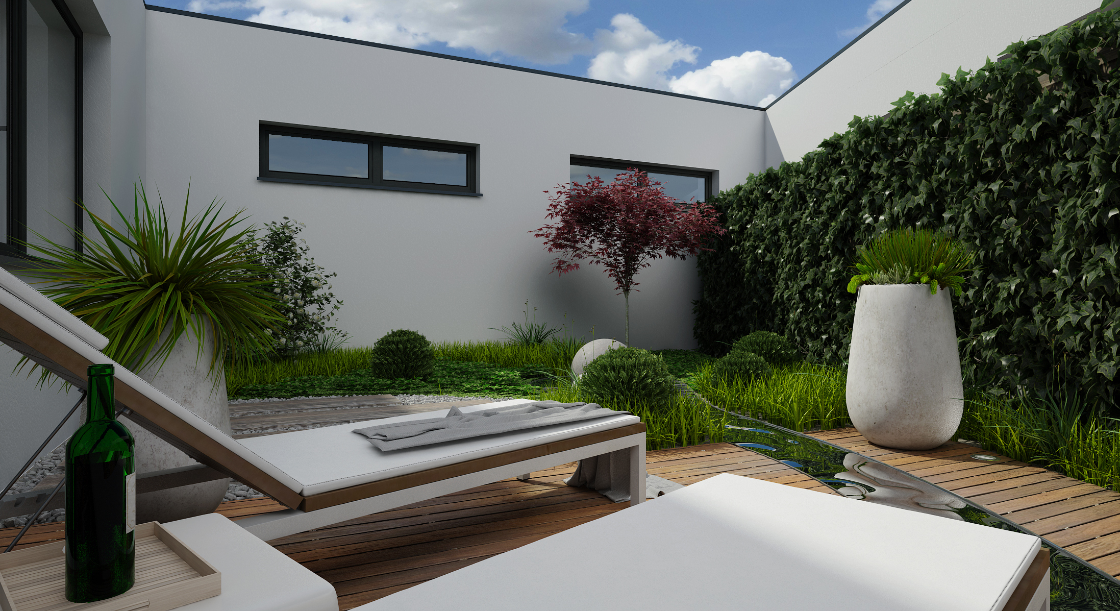 The second, a private terrace, adjoins the couple's bedroom. There is a sauna and an outdoor relaxation room. The moment of well-being is amplified by the noise of water flowing in an artificial riverbed. The water circulates thanks to ingenious piping and pumping.