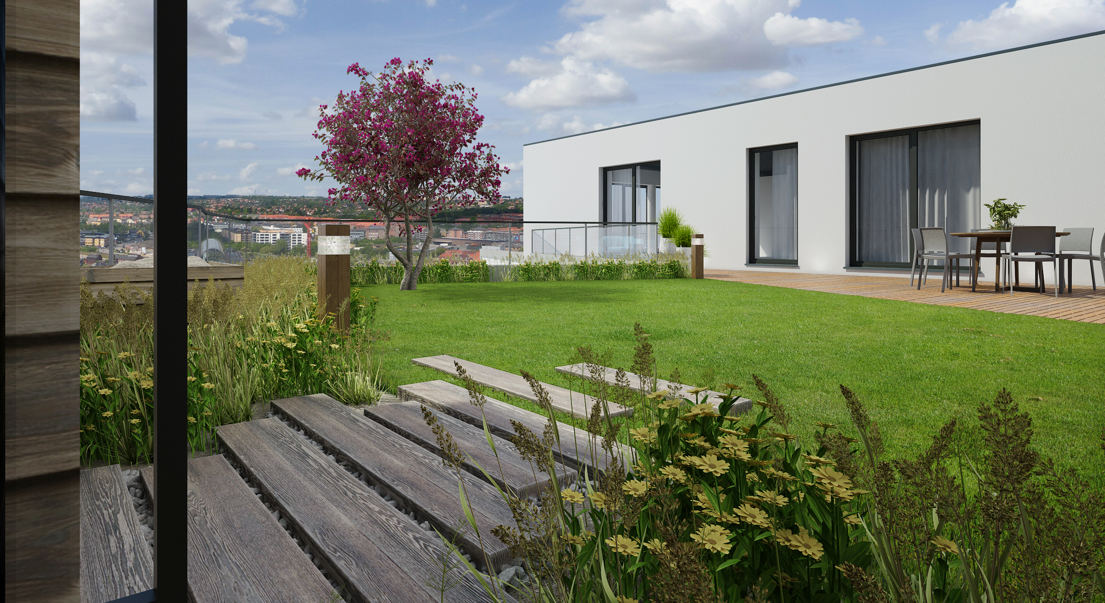 In a family house set in a cliff above the town, we can find two terraces. From the living room we enter a large partially grassed terrace with a dining table and a place to sit. The terrain is steeply sloping, so for safety reasons it was surrounded by railings. A transparent tempered glass barrier was chosen, in order not to disturb the view.