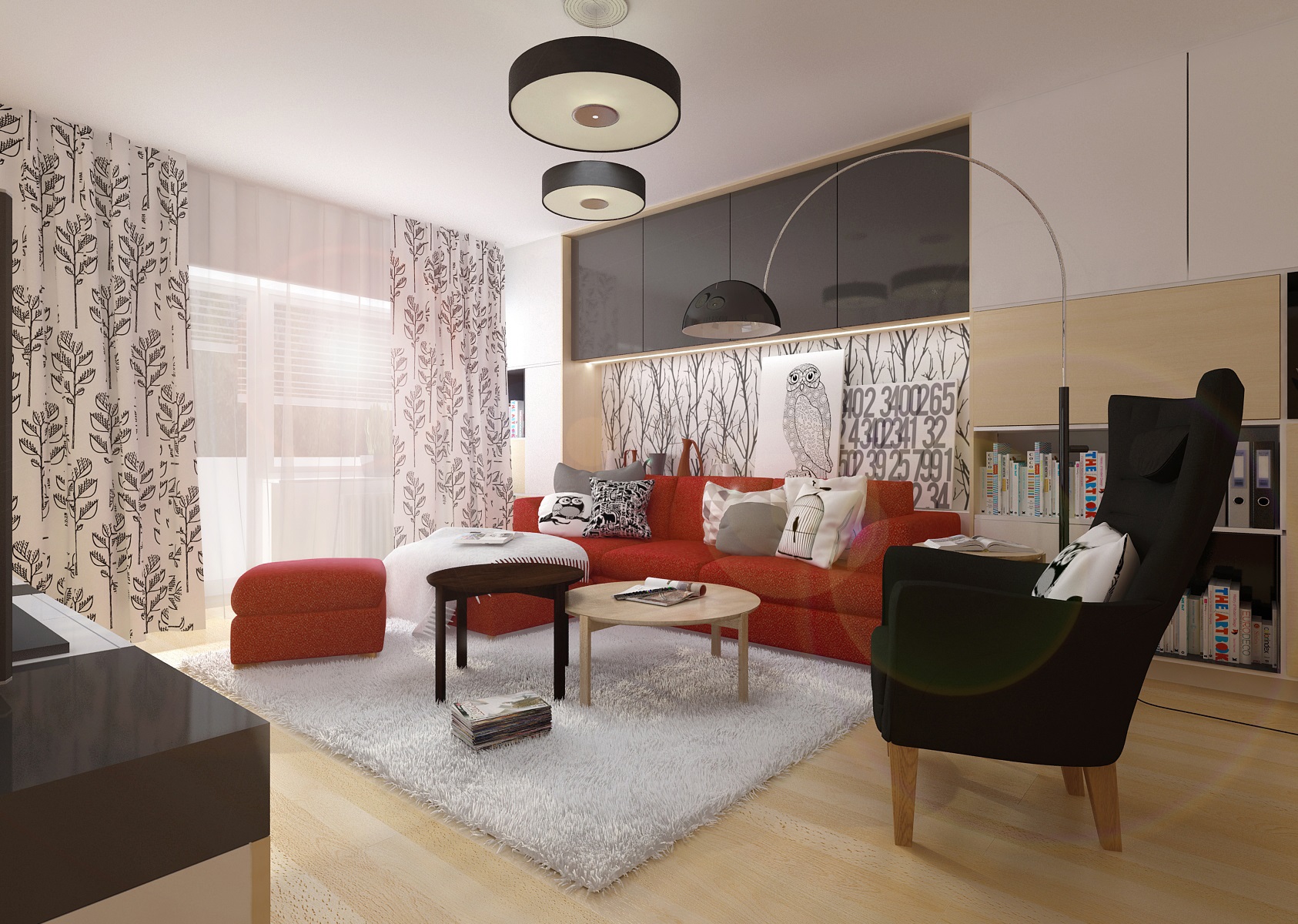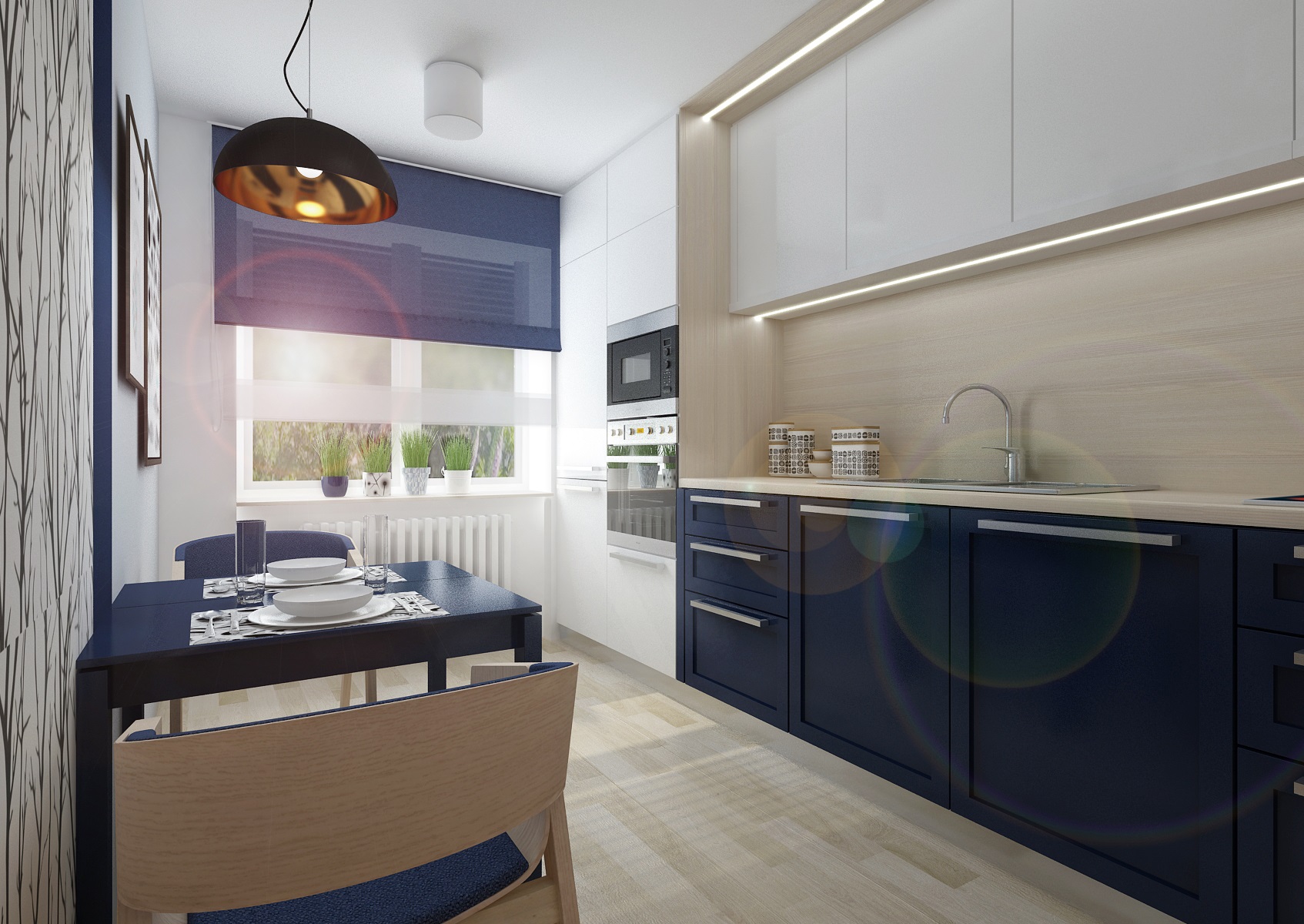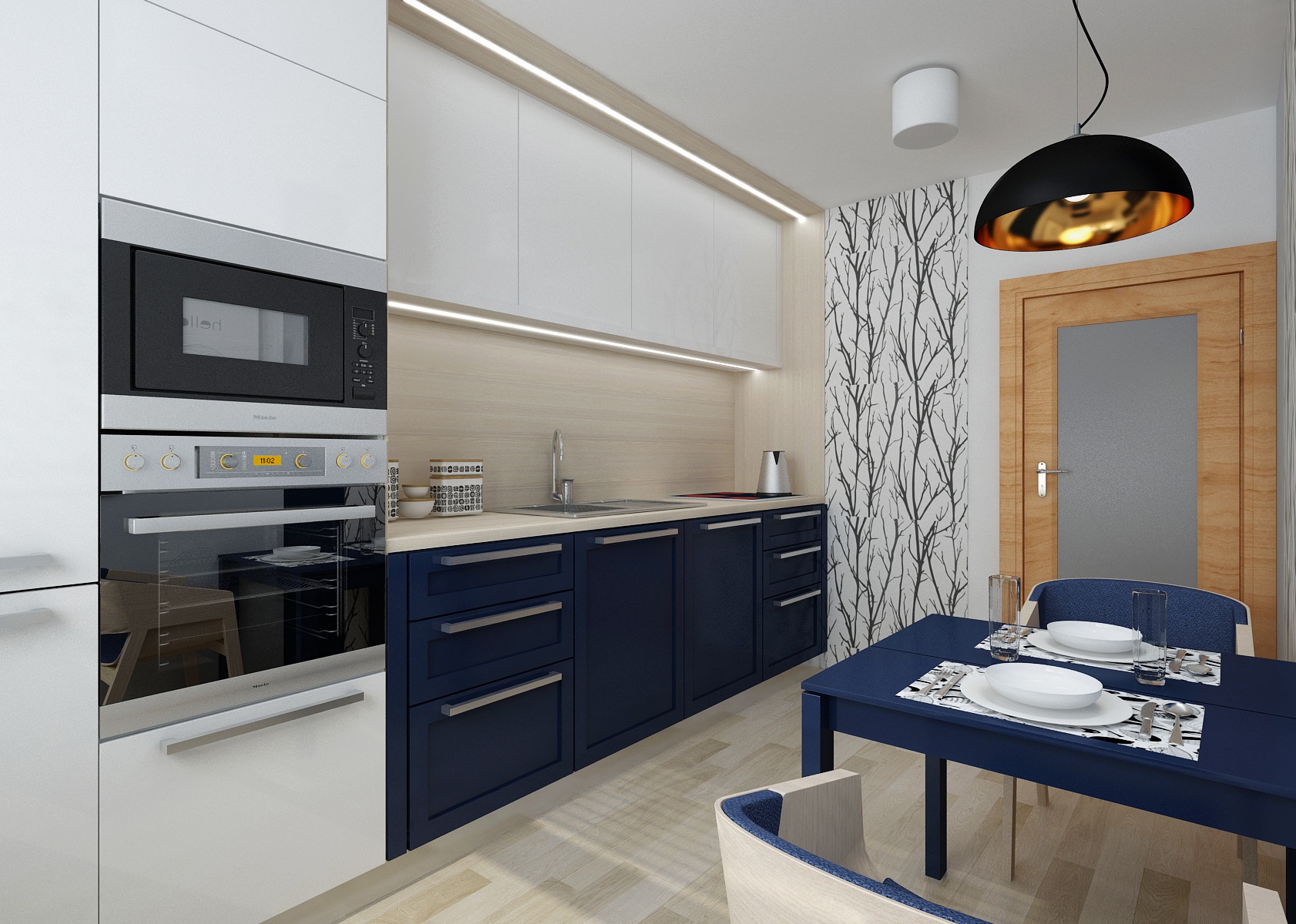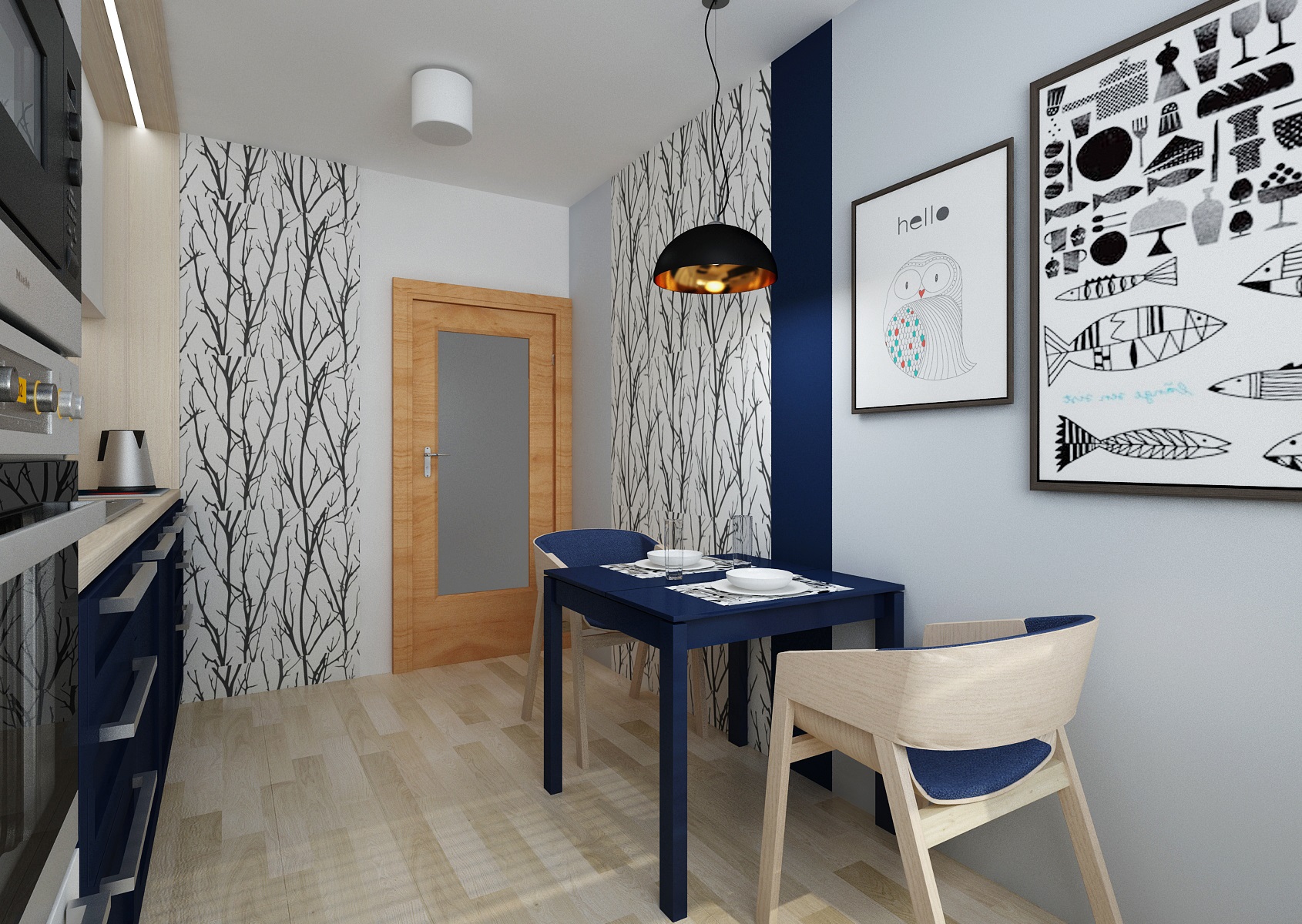 The living room has a classic upholstery, a red sofa from Resa, circular Massive-Esseo textile lamps and curtain nad wallpaper with a plant pattern from the Light and Bright series by Fiona. The kitchen is in a modern rustic style with a distinctive blue doors. The smal dining table is complemented by TON-Merano chairs.