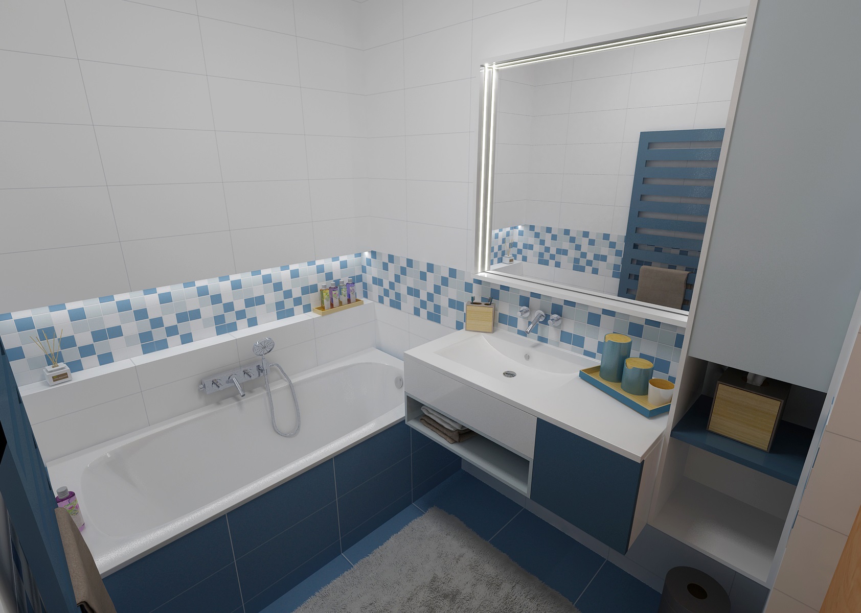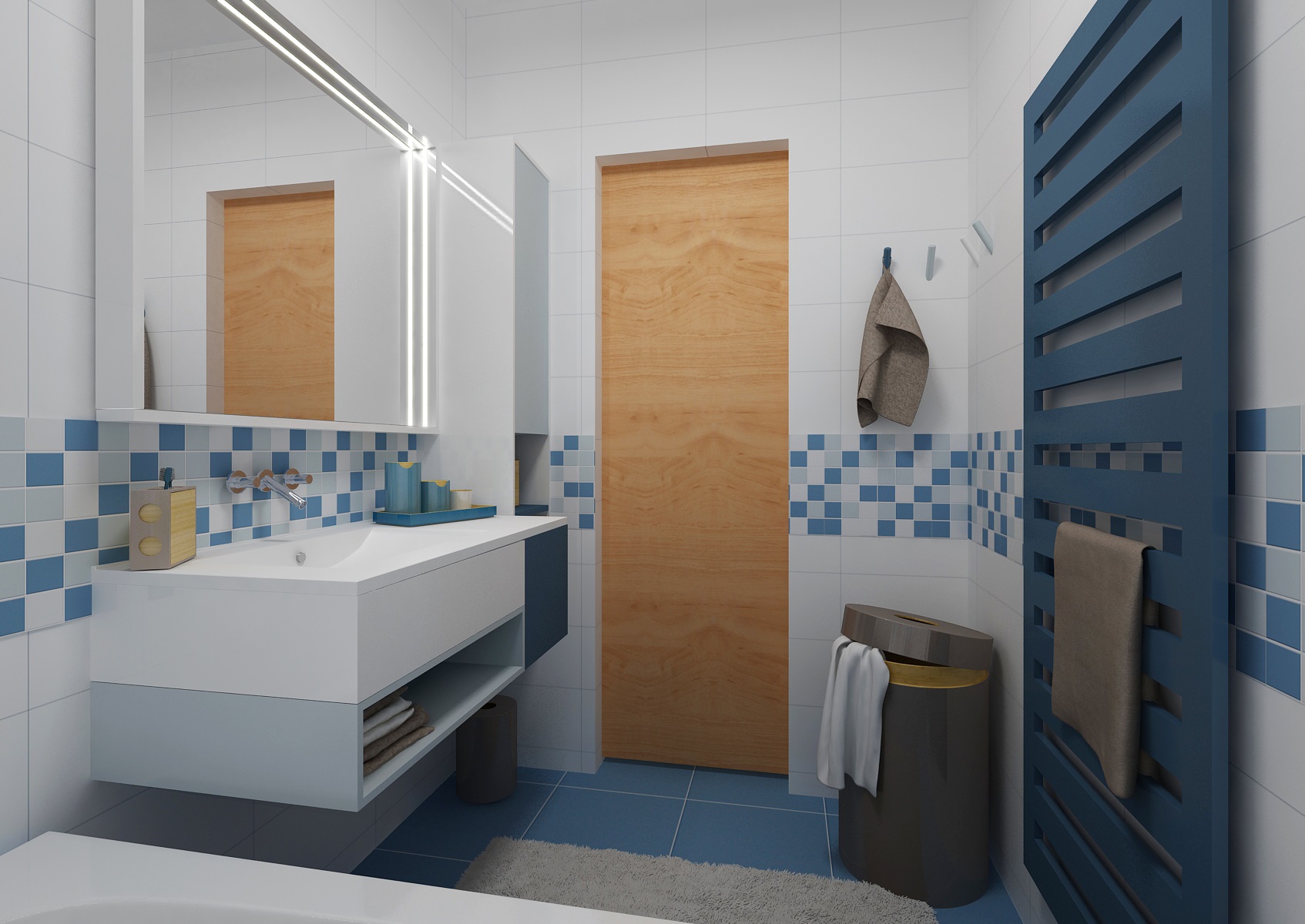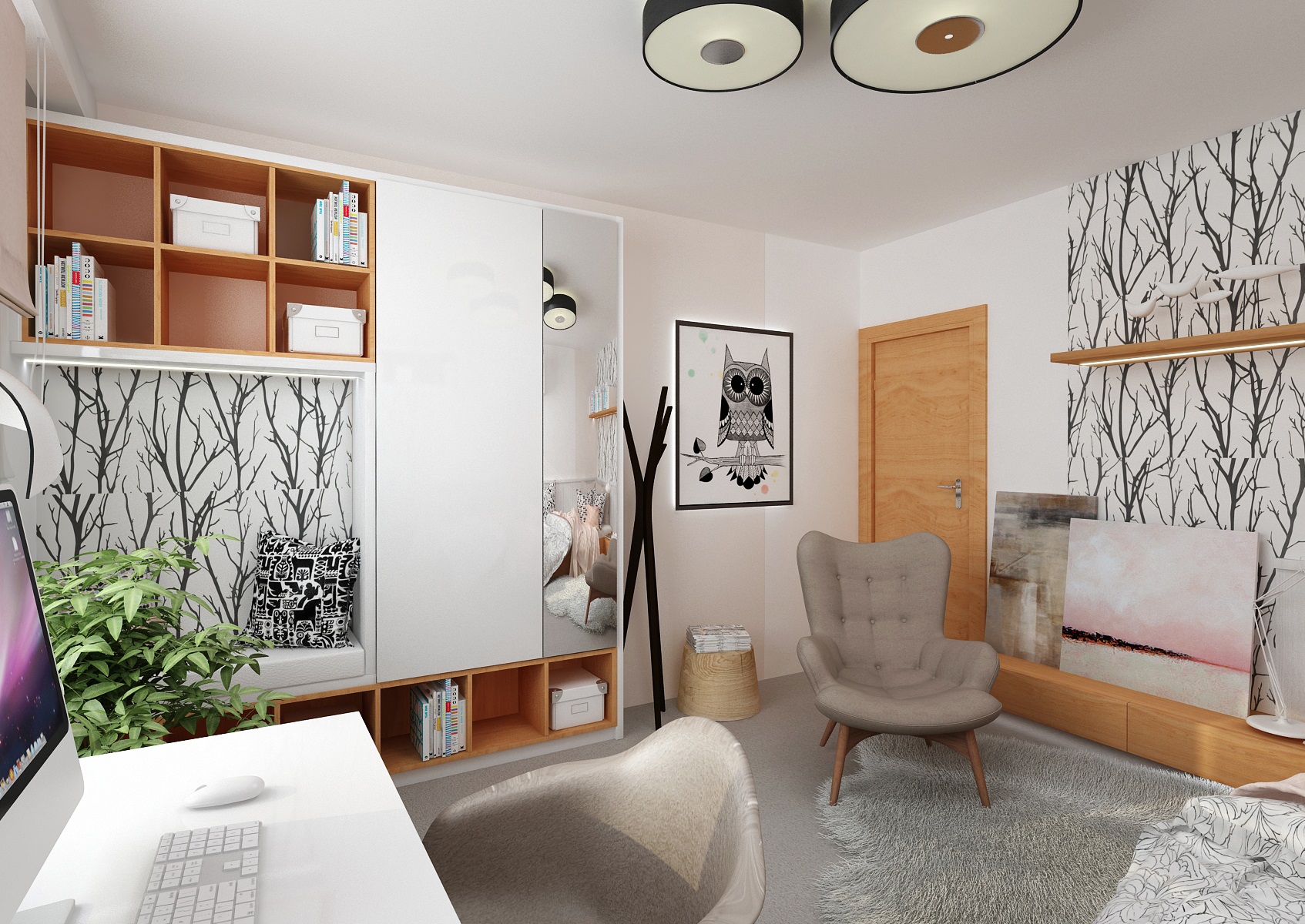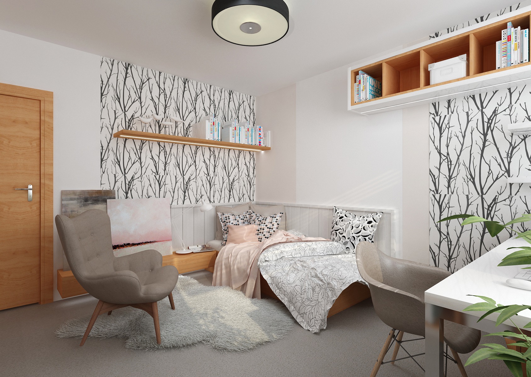 The living room has a classic upholstery, a red sofa from Resa, circular Massive-Esseo textile lamps and curtain nad wallpaper with a plant pattern from the Light and Bright series by Fiona. The kitchen is in a modern rustic style with a distinctive blue doors. The smal dining table is complemented by TON-Merano chairs.
