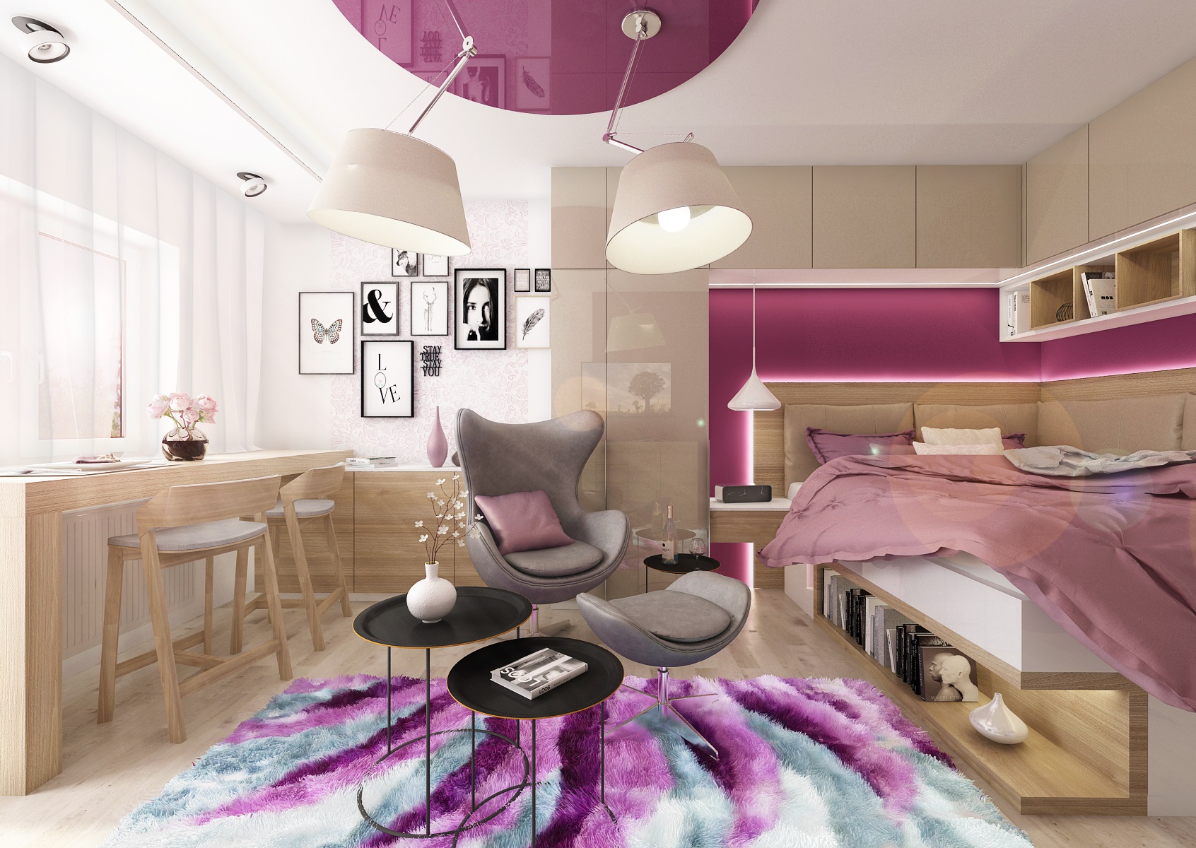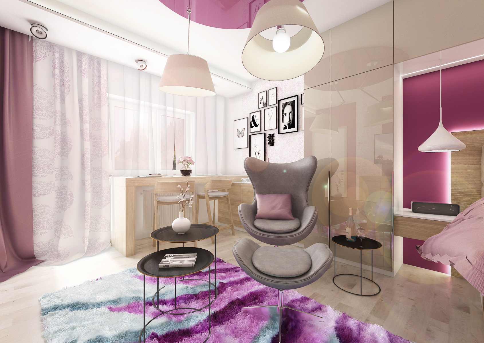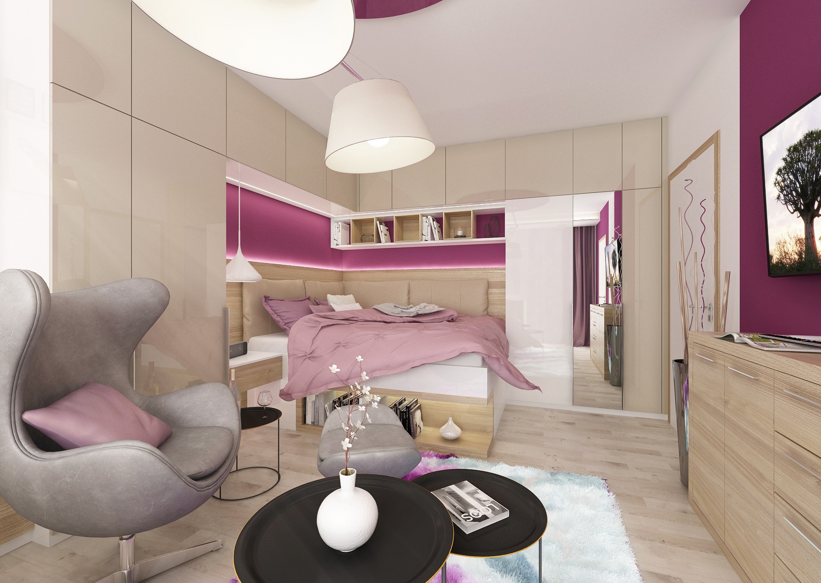 Purple and pink are the ladie's favourite colors and in this tones, in combination with neutral creme and natural oak decor is designed this studio. The raised bed optically defines, in the common area, the sleeping and living part.