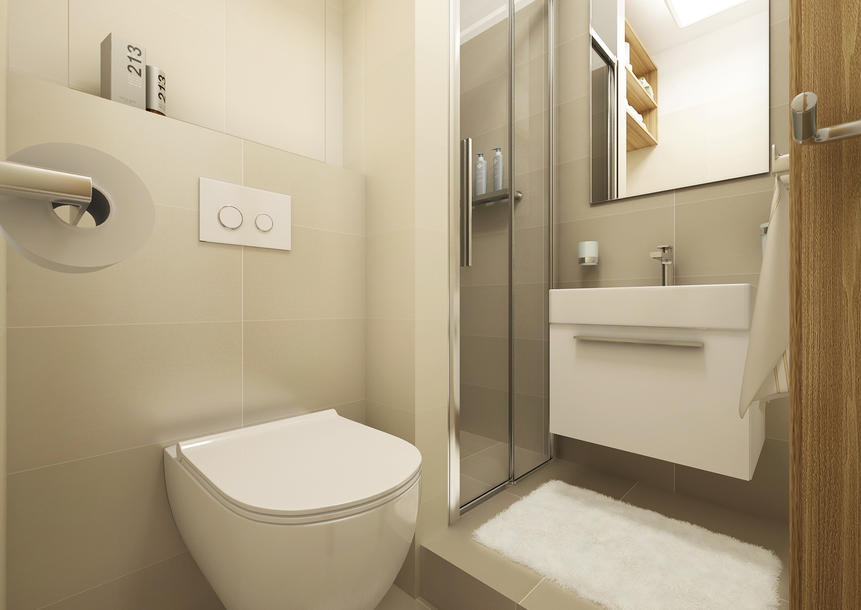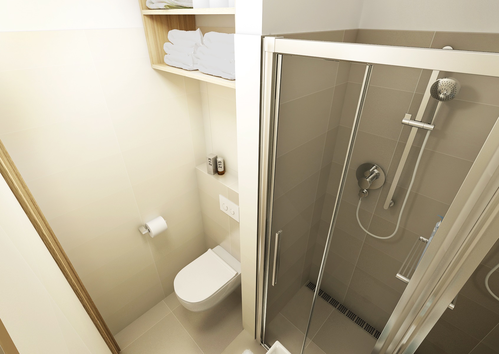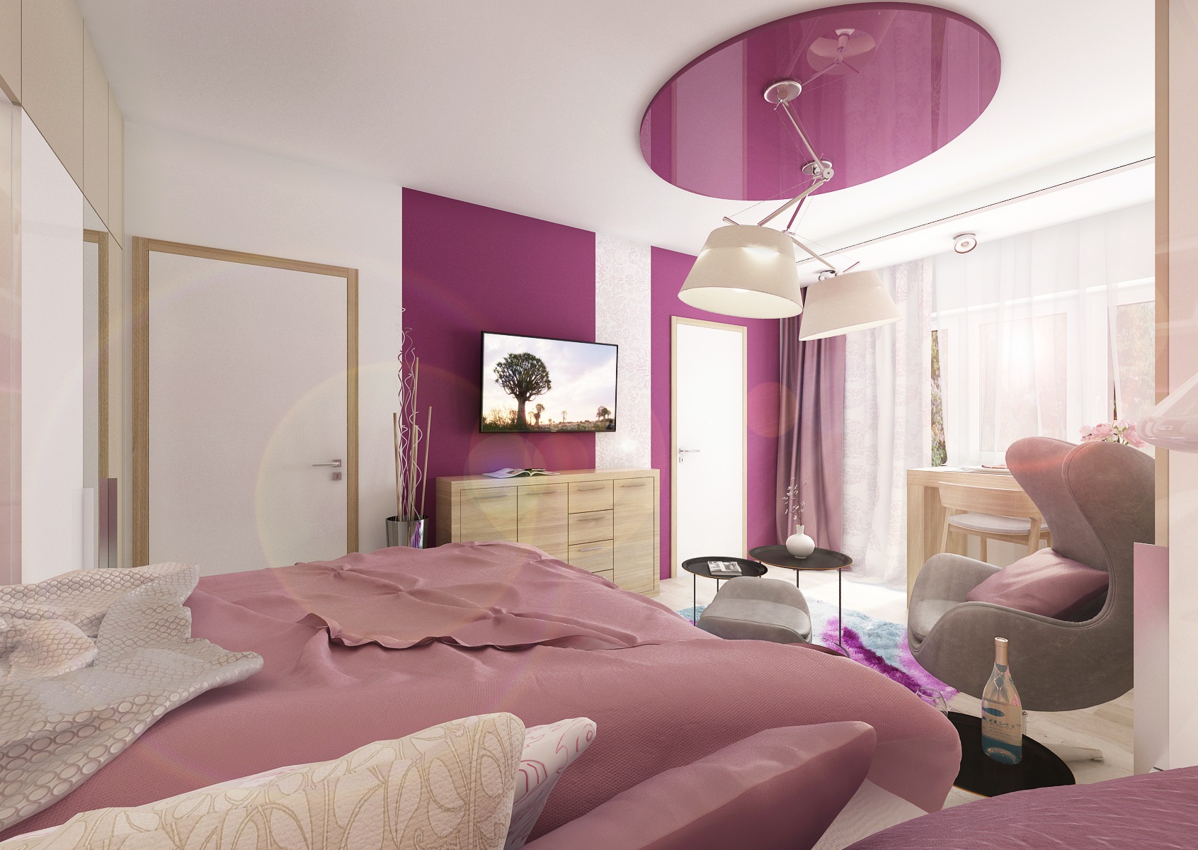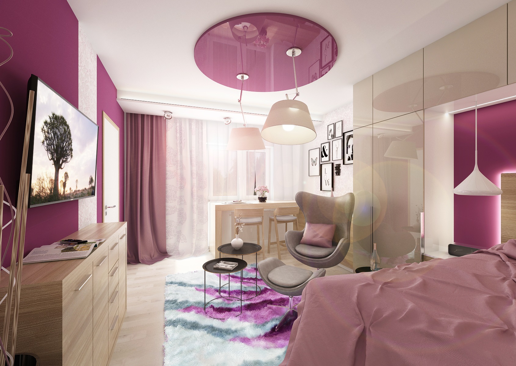 Purple and pink are the ladie's favourite colors and in this tones, in combination with neutral creme and natural oak decor is designed this studio. The raised bed optically defines, in the common area, the sleeping and living part.
