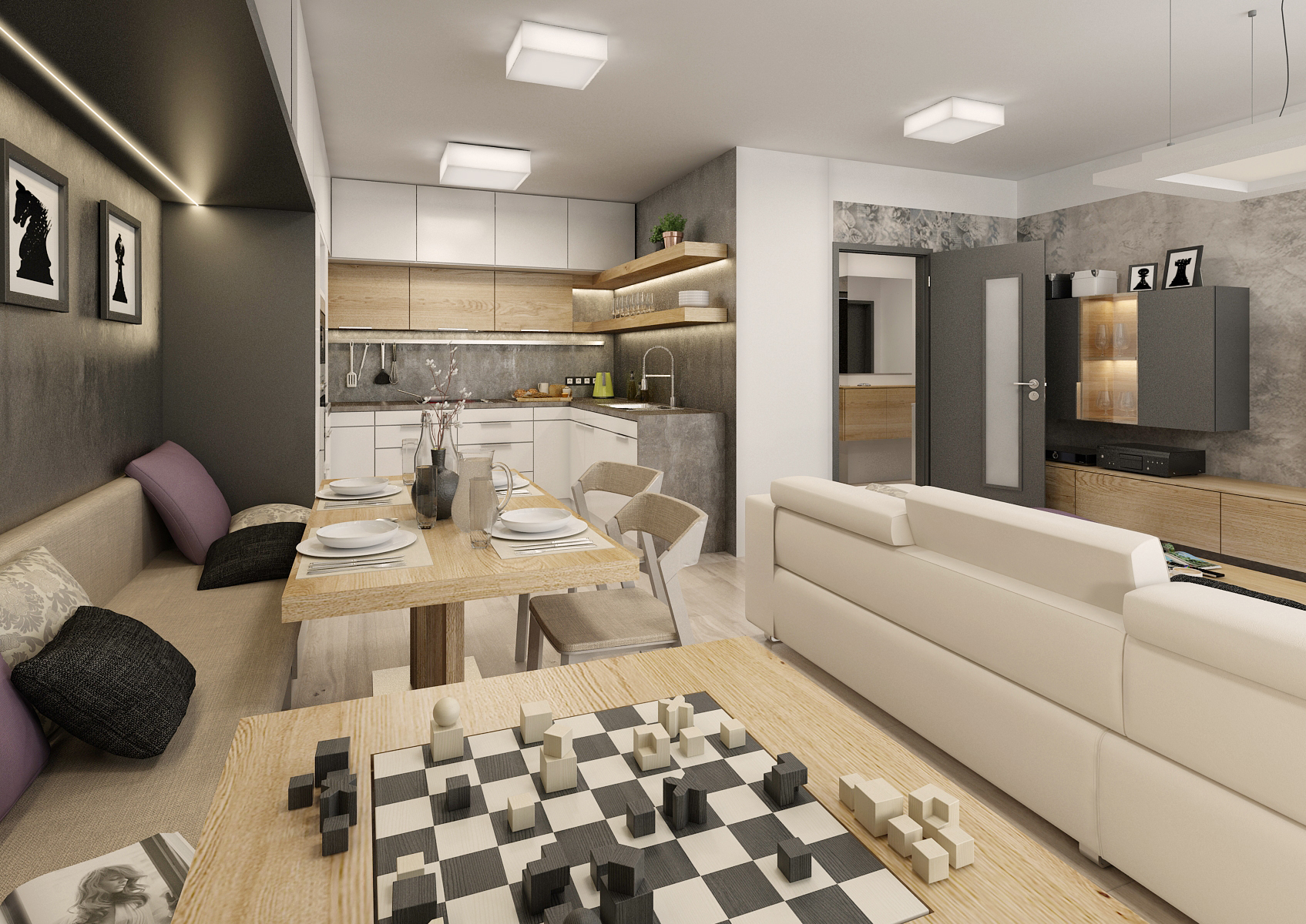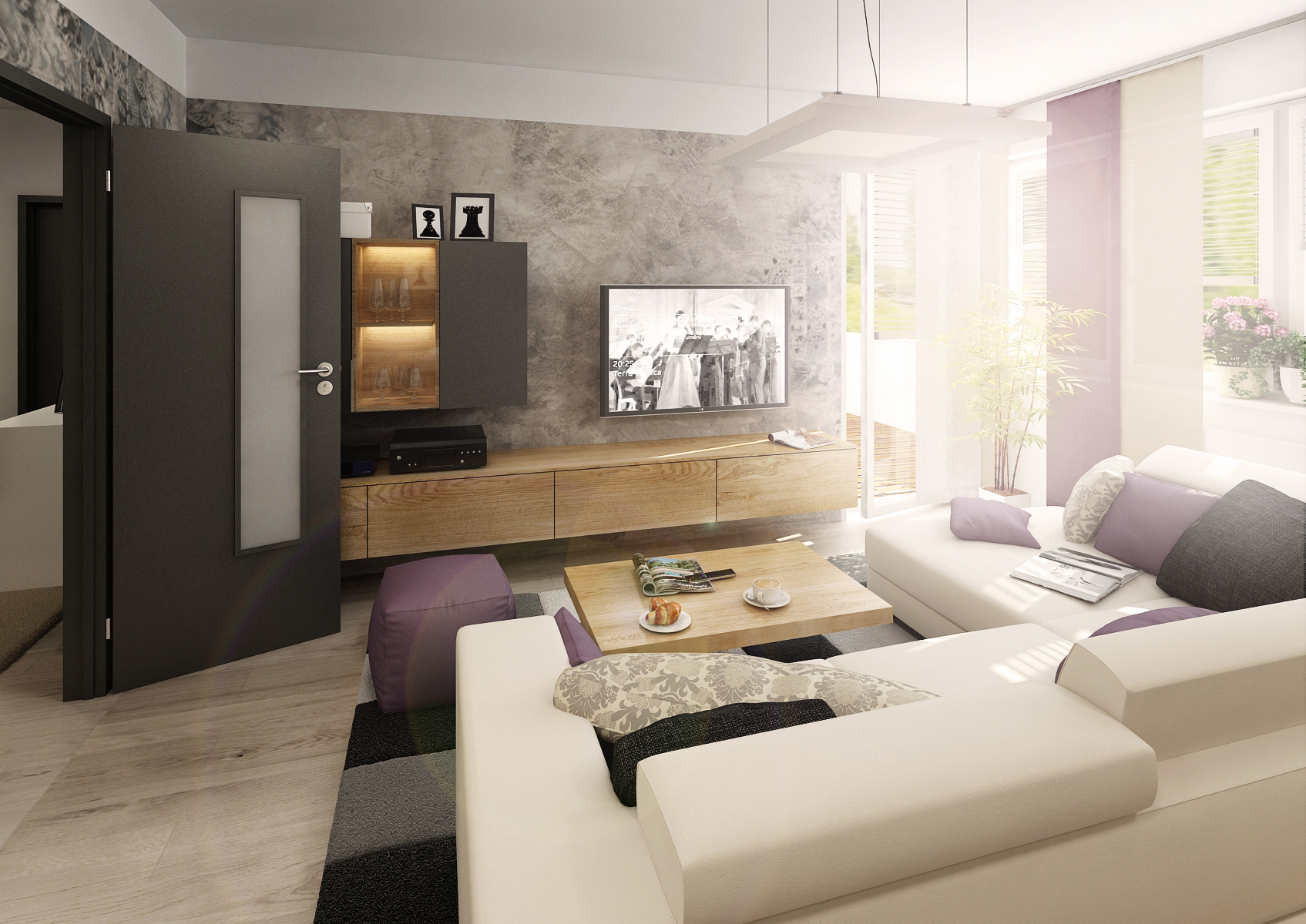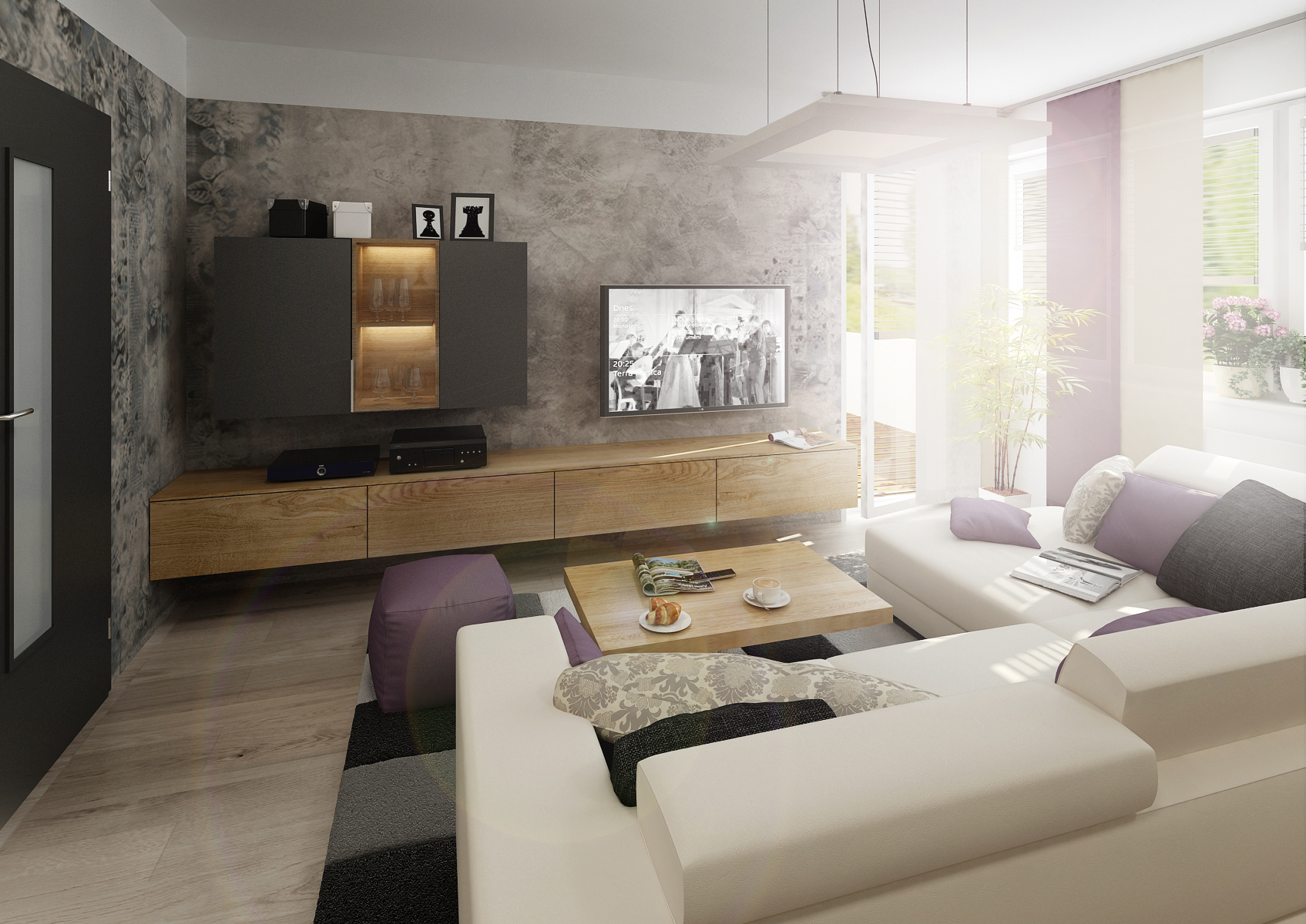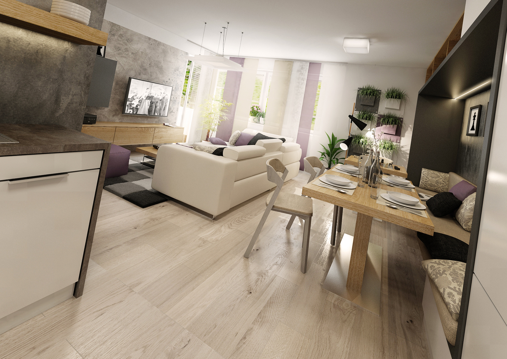 as a start up living for newlyweds. The kitchen in combination with white gloss, natural oak and cement trowel, which is repeated on the walls throughout the apartment. The kitchen seamlessly connects to the built-in upholstered bench with a dining room, which is completed with two Merano chairs by TON. The TV wall is solved only by a horizontal hanging cabinet for audio/video and a smaller display case. Other equipment includes a Hébé sofa set from Polstrin, ATEH-Aquarium ceiling lights and ECO DESIGN-STZ pedant lights.