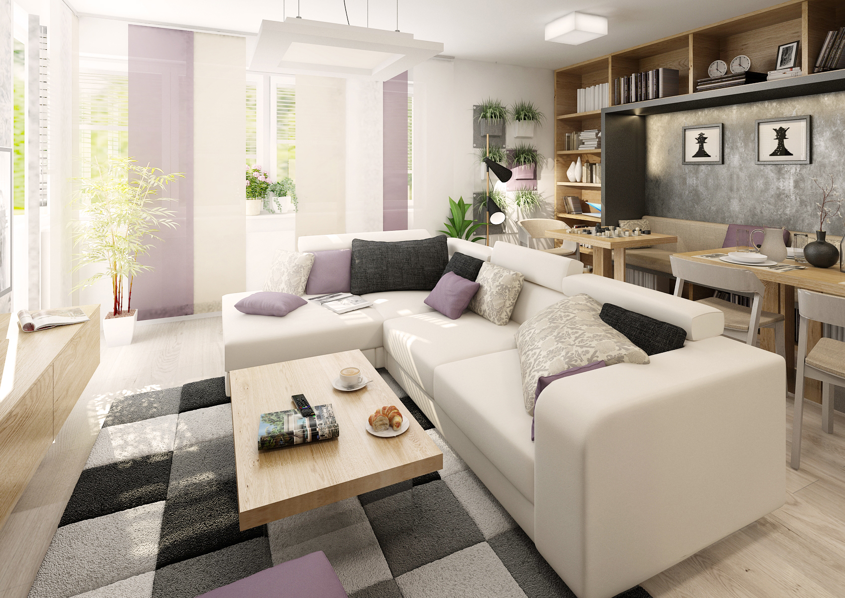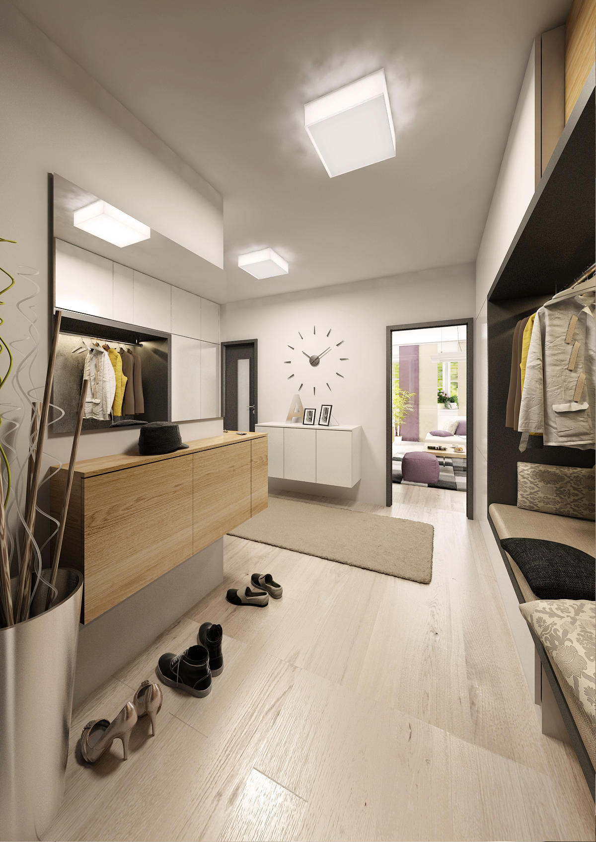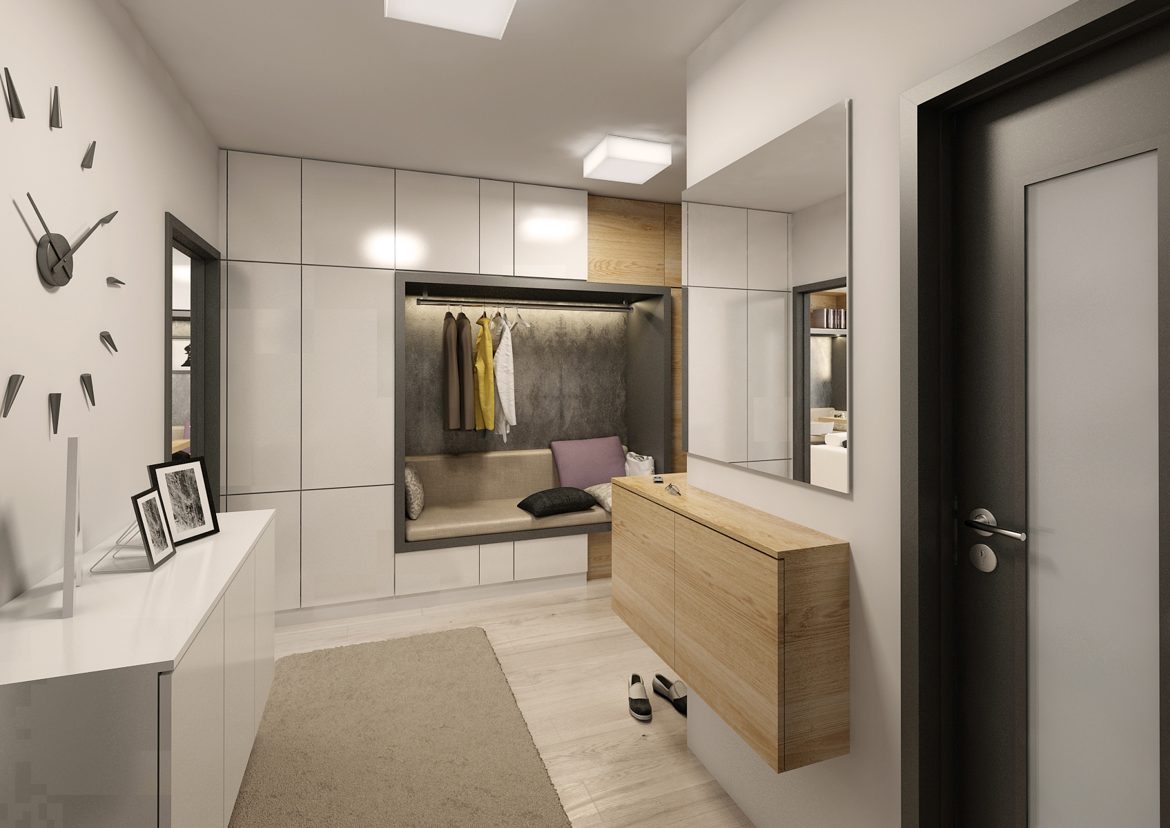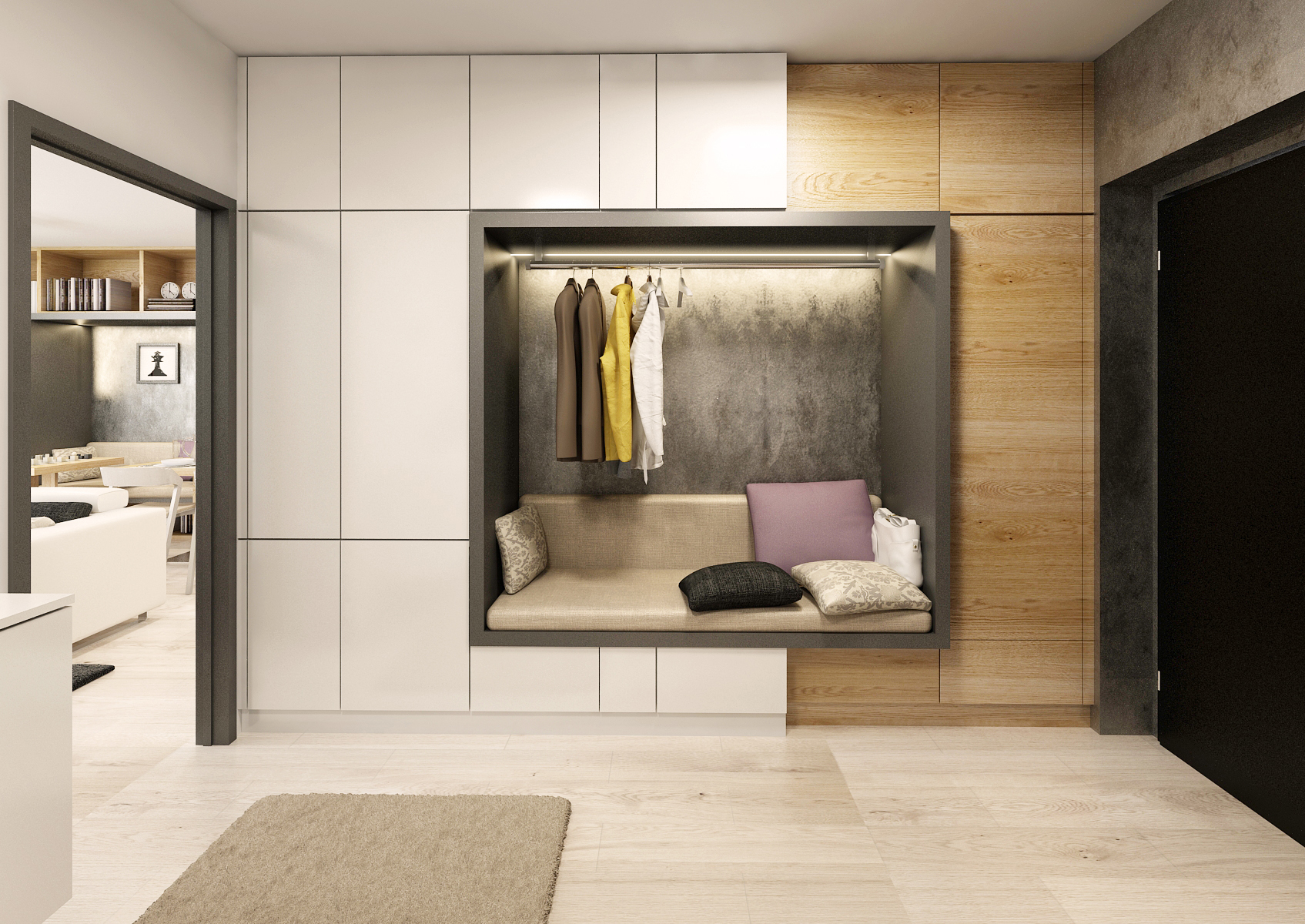 as a start up living for newlyweds. The kitchen in combination with white gloss, natural oak and cement trowel, which is repeated on the walls throughout the apartment. The kitchen seamlessly connects to the built-in upholstered bench with a dining room, which is completed with two Merano chairs by TON. The TV wall is solved only by a horizontal hanging cabinet for audio/video and a smaller display case. Other equipment includes a Hébé sofa set from Polstrin, ATEH-Aquarium ceiling lights and ECO DESIGN-STZ pedant lights.