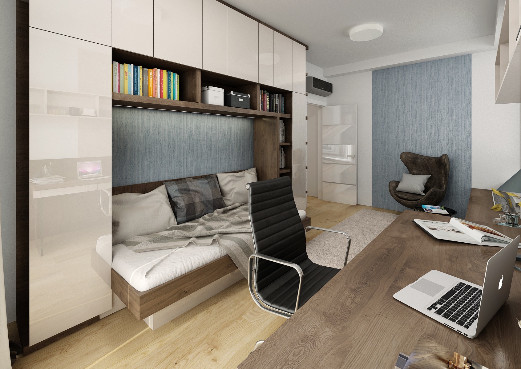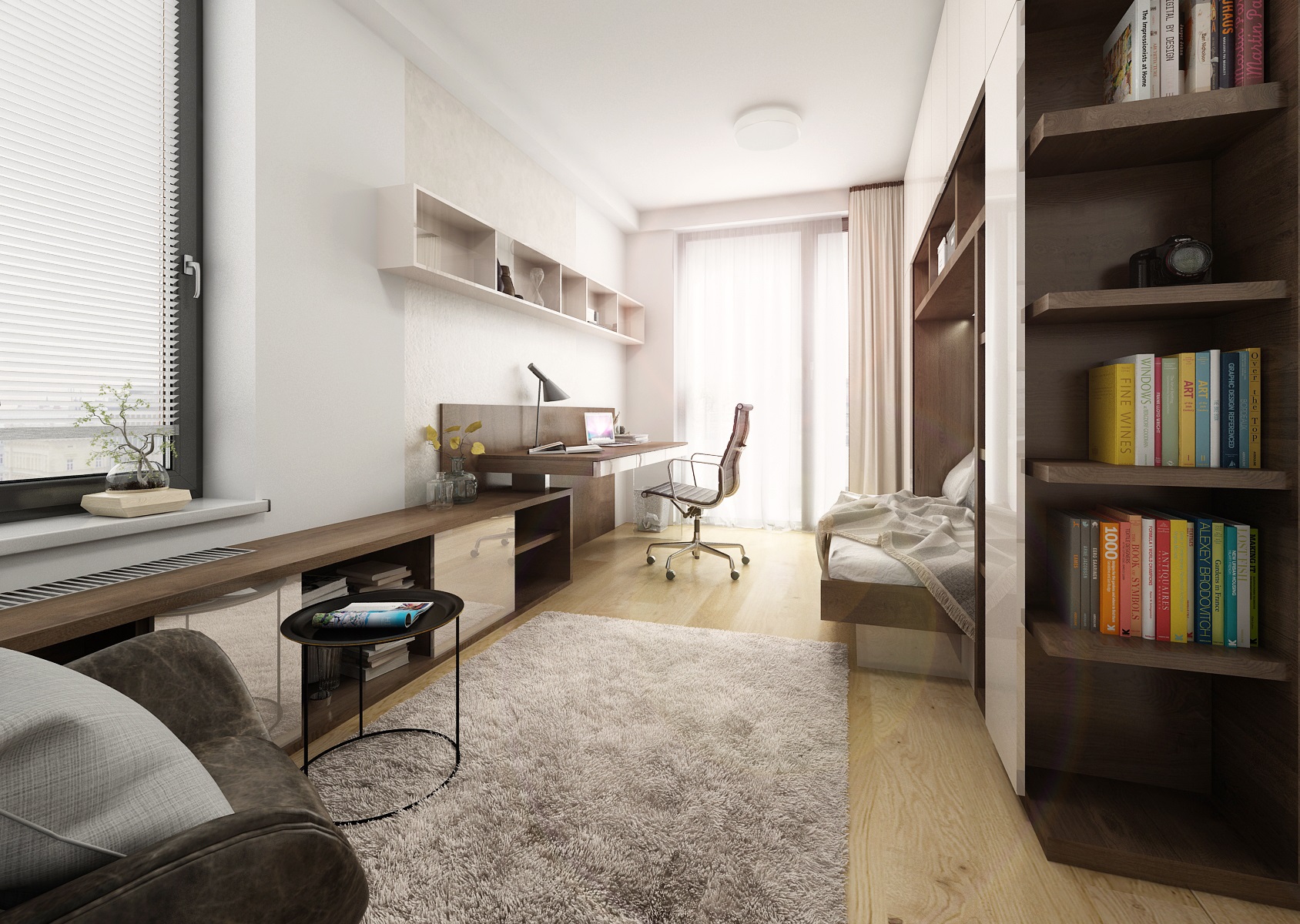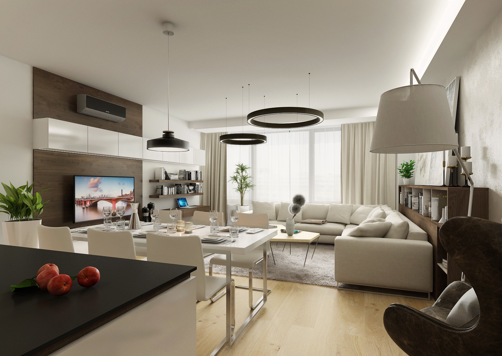 In the centre of Brno we designed a completely furnished luxurious apartment. It includes a home office, which can also serve as a guest room, a dressing room used mostly by the lady of the house. The dominated materials are dark-stained oak veneer, effectively complemented with white lacquered furniture elements, in the kitchen with a creamy accent in the form of Lacobel glass tiles.