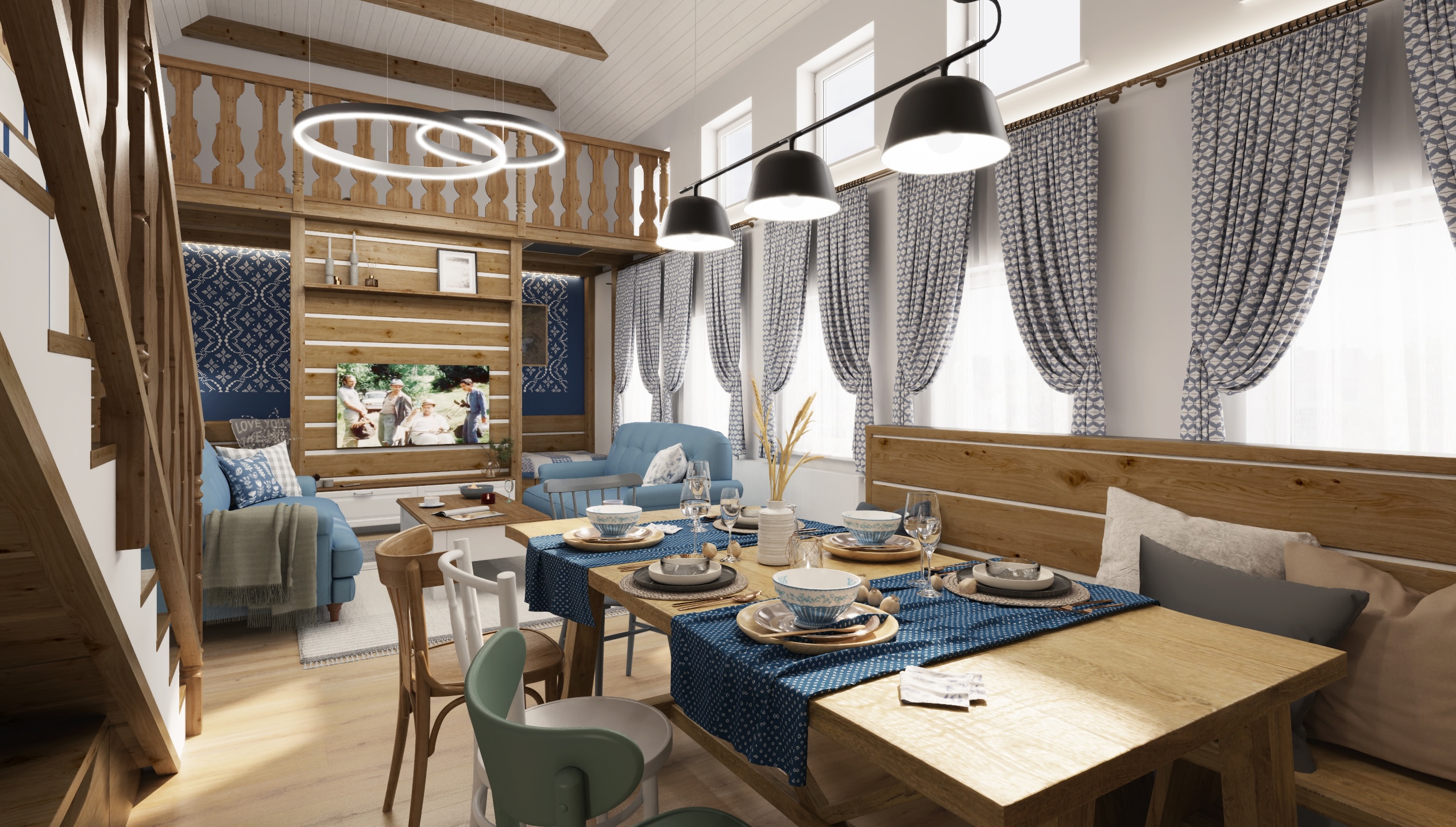 The central living area with a sofa in blue fabric and bench seating at a massive table invites you to sit and have a festive lunch. The wooden floor with a balustrade and recessed corners with a day bed emphasize the coziness and ingenious use of space in the spirit of old country houses.