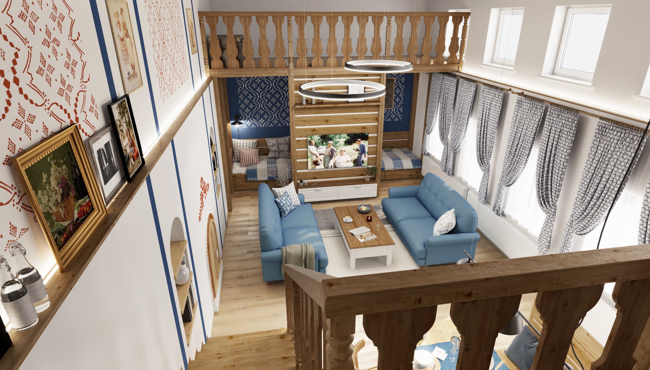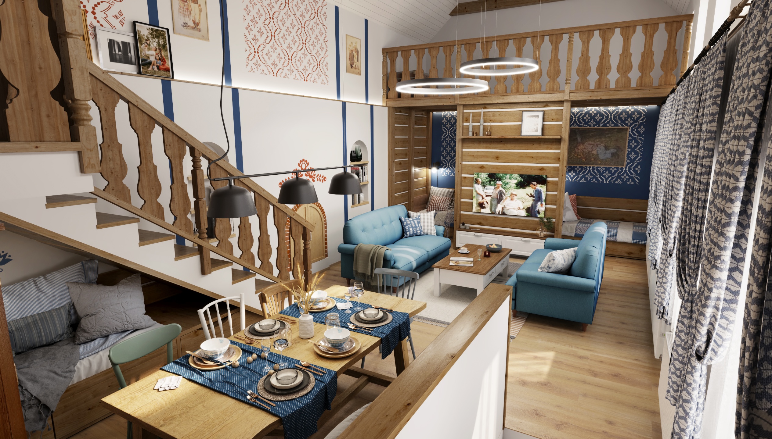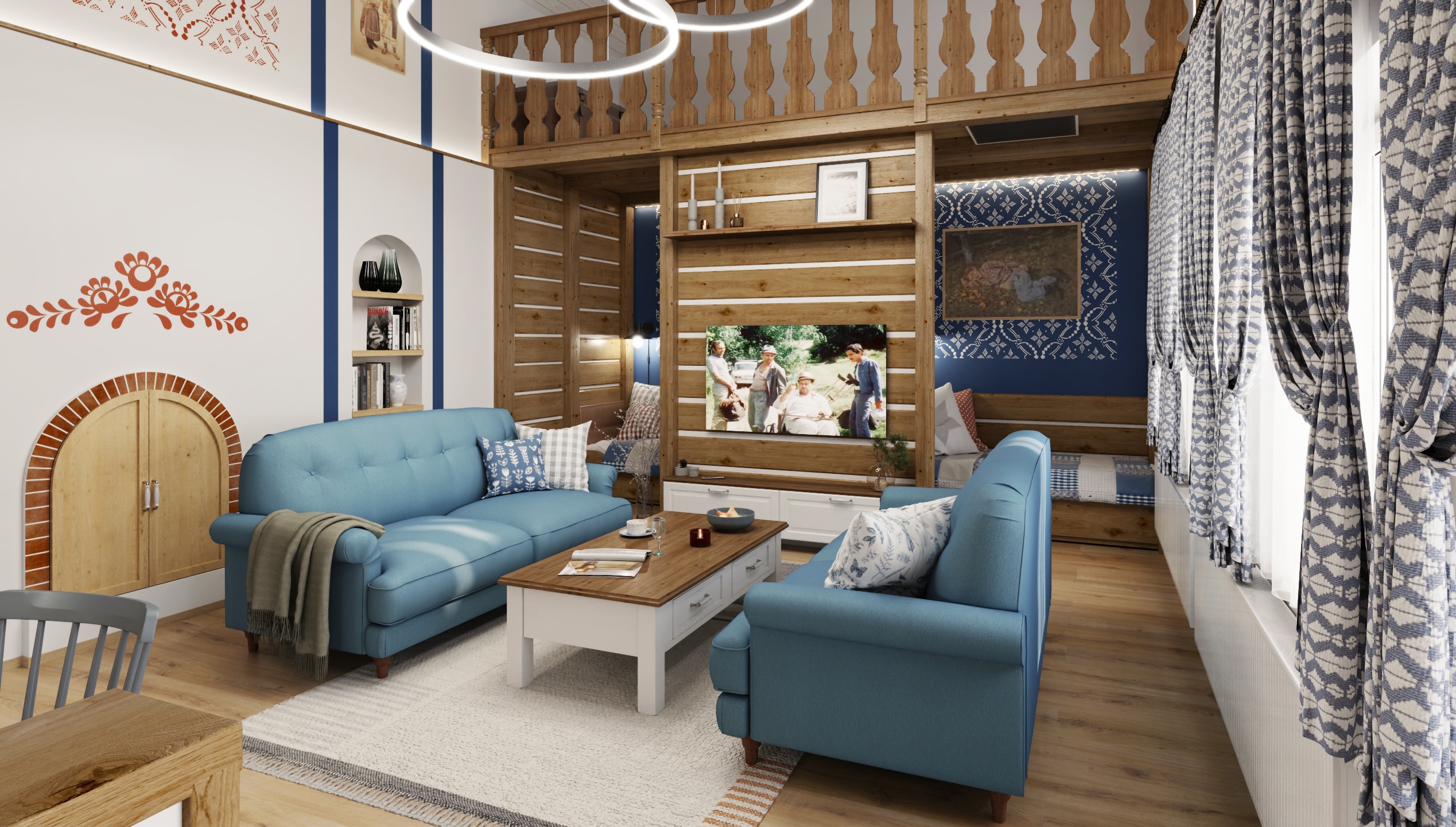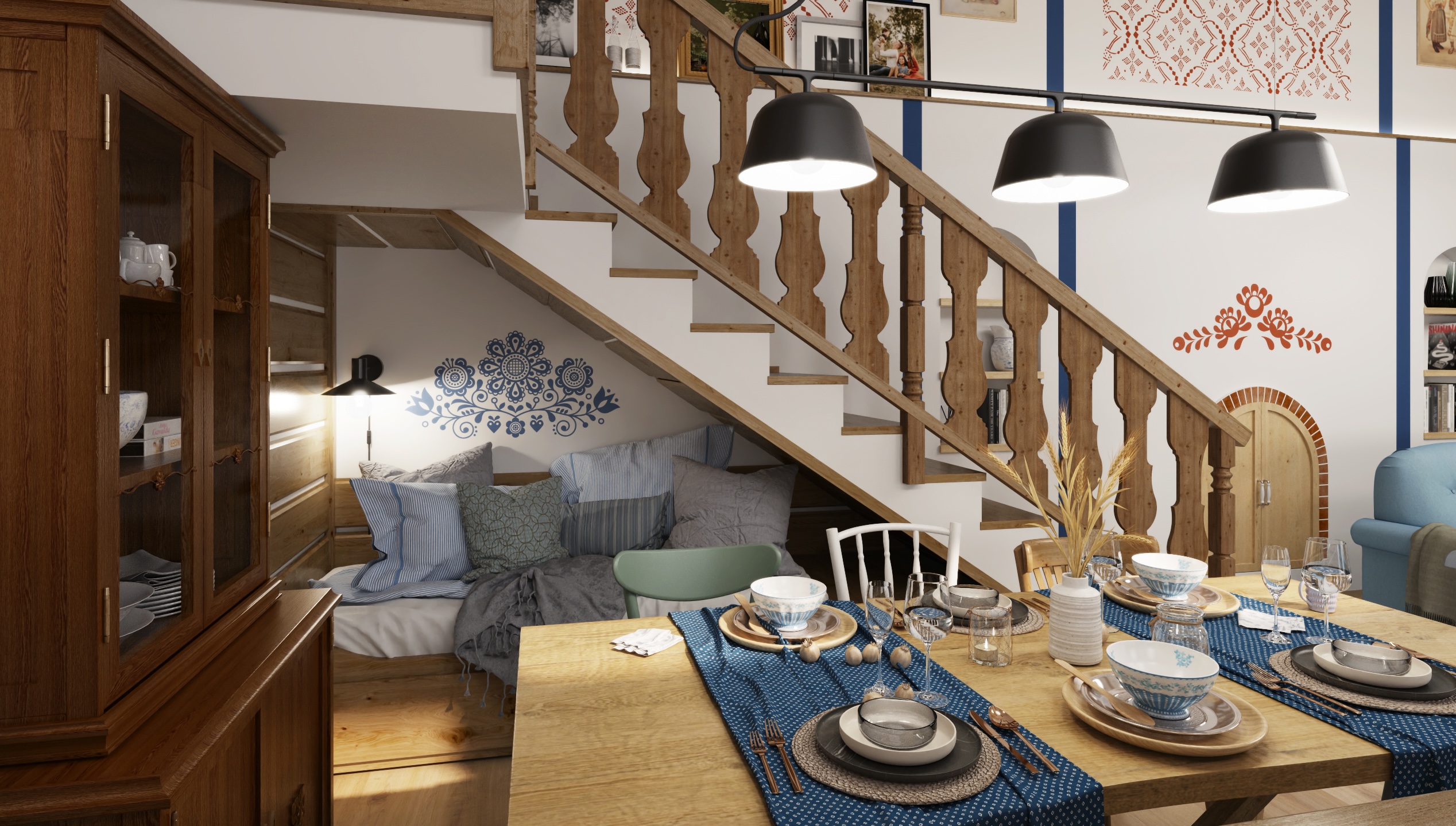 The interior of the cottage in the Slovak region combines traditional folk motifs with modern furnishings - the blue and white color scheme, wooden elements and patterned textiles inspired by folk costumes dominate here. Distinctive curtains, wall paintings and rustic details create a warm atmosphere with an emphasis on regional identity.
