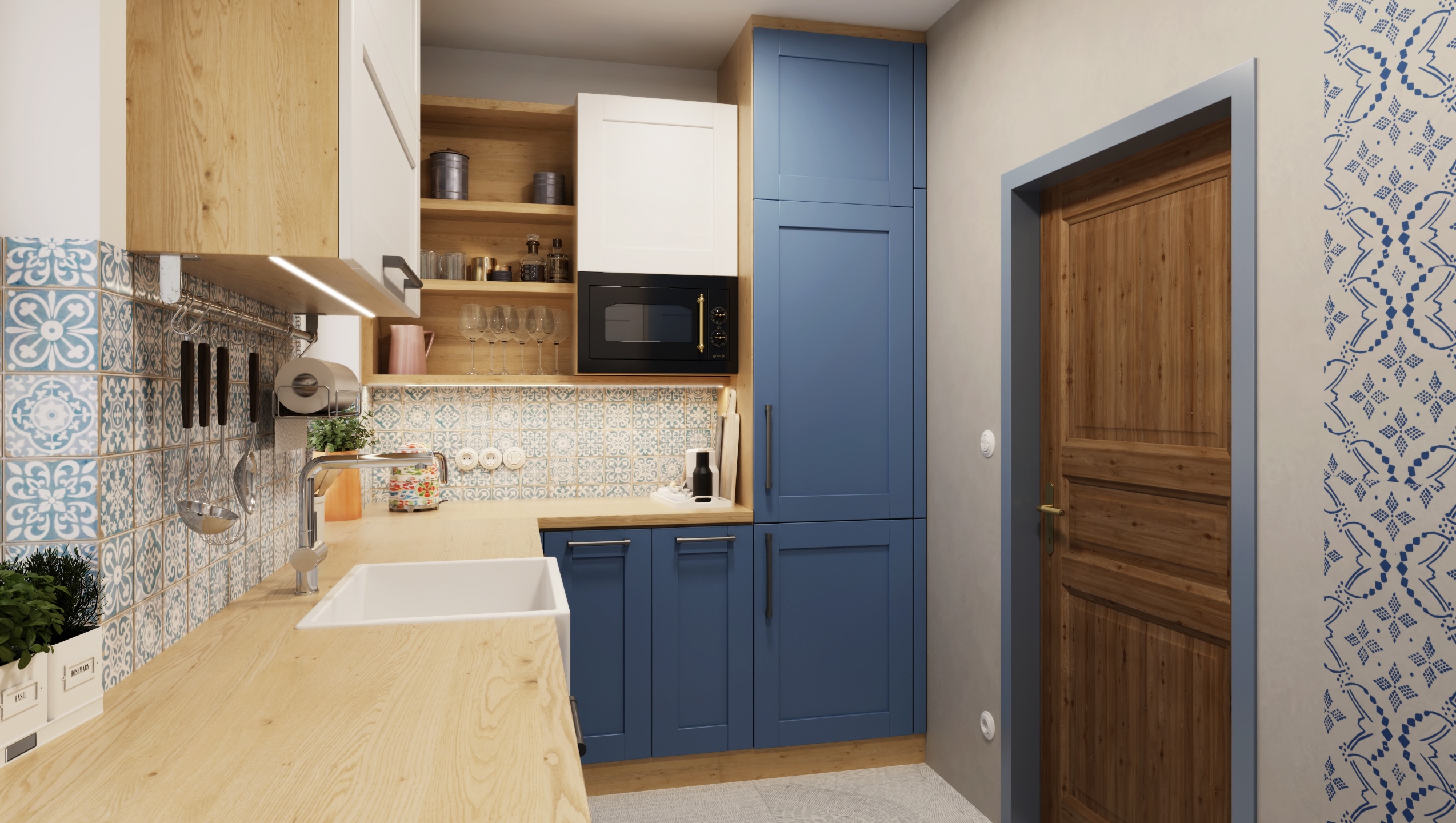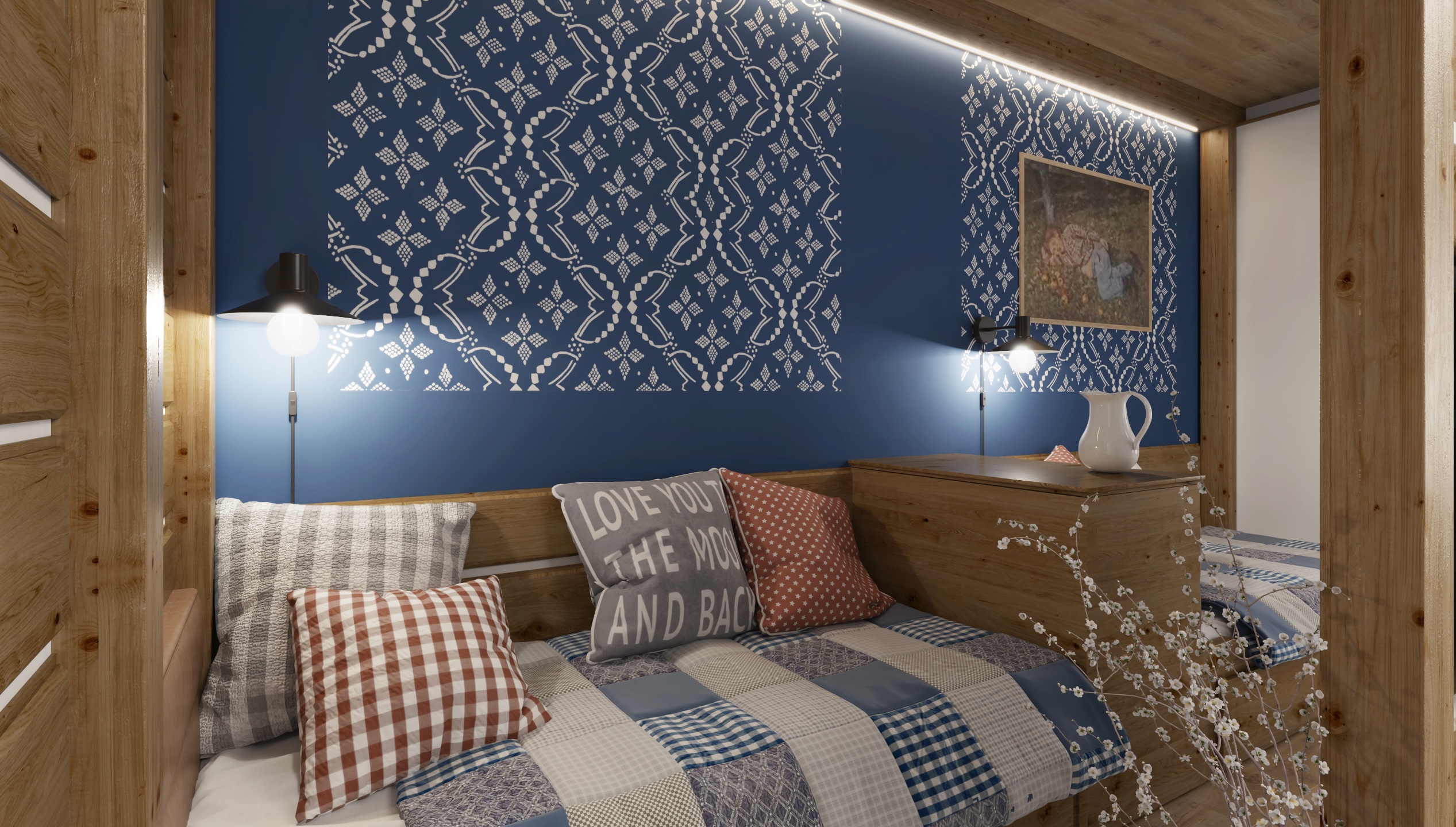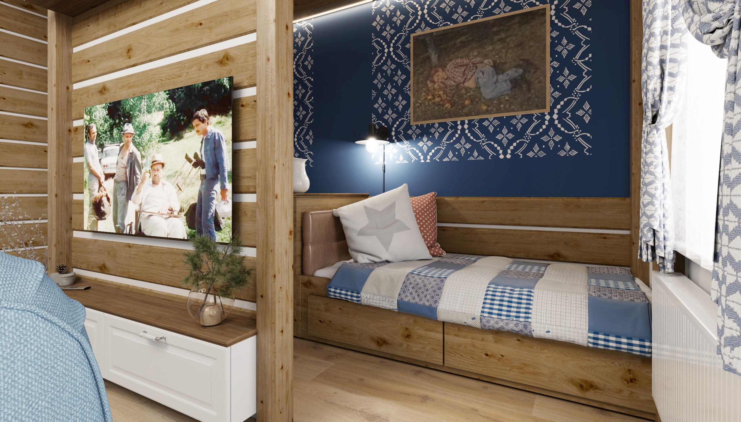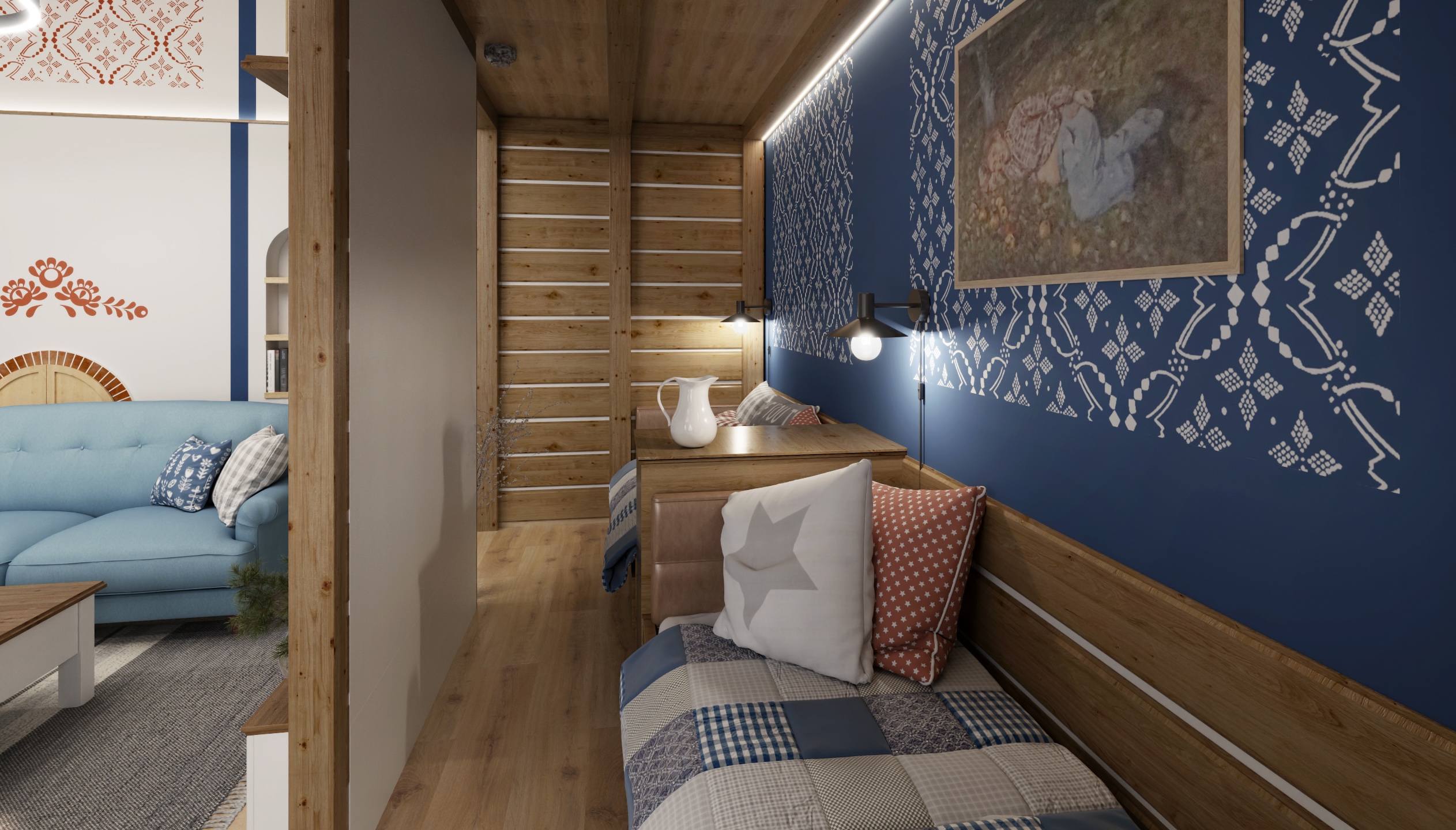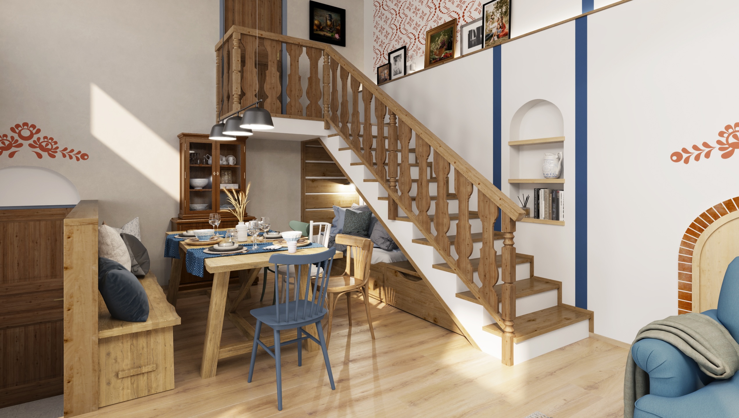 The interior of the cottage in the Slovak region combines traditional folk motifs with modern furnishings - the blue and white color scheme, wooden elements and patterned textiles inspired by folk costumes dominate here. Distinctive curtains, wall paintings and rustic details create a warm atmosphere with an emphasis on regional identity.