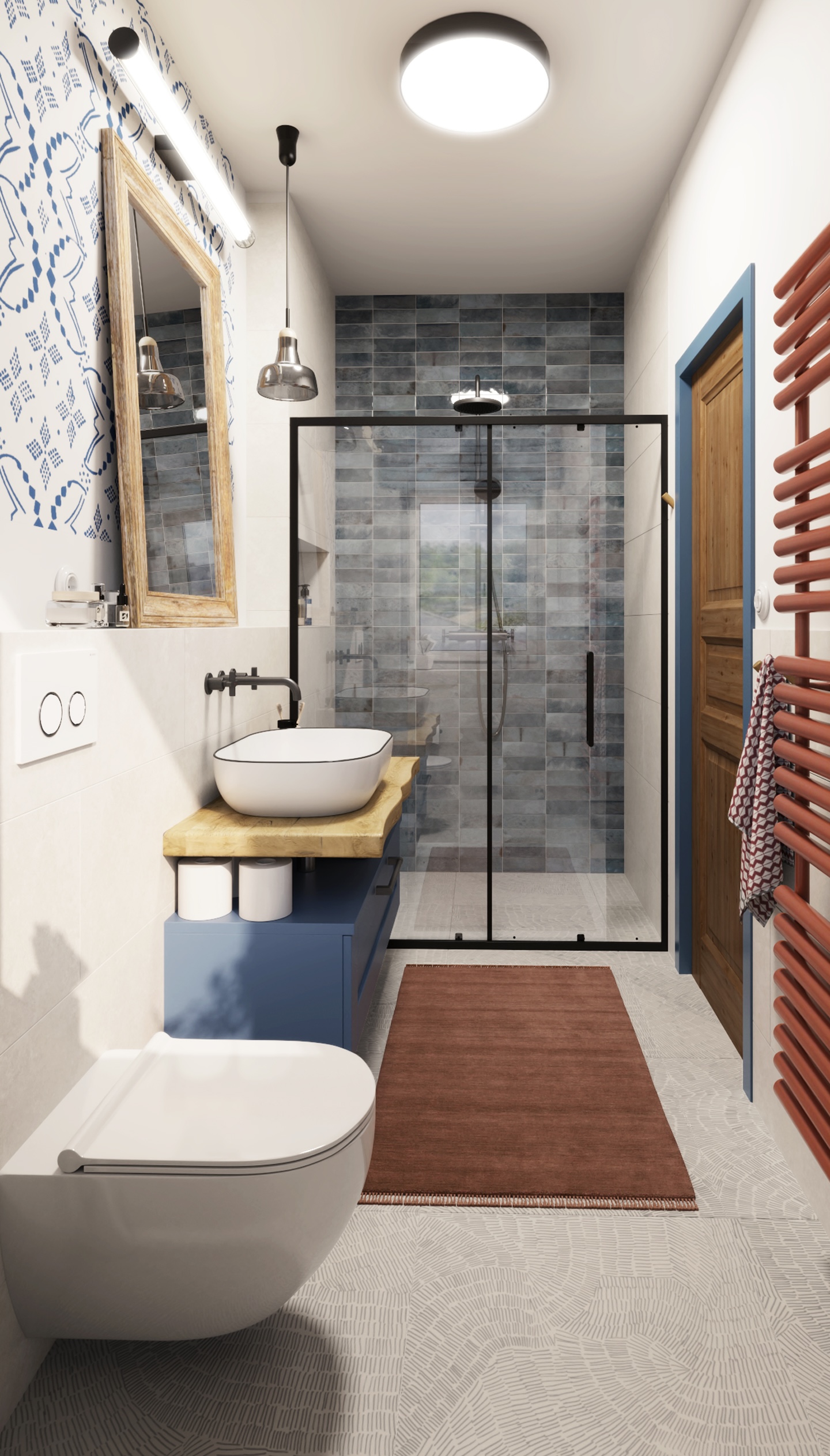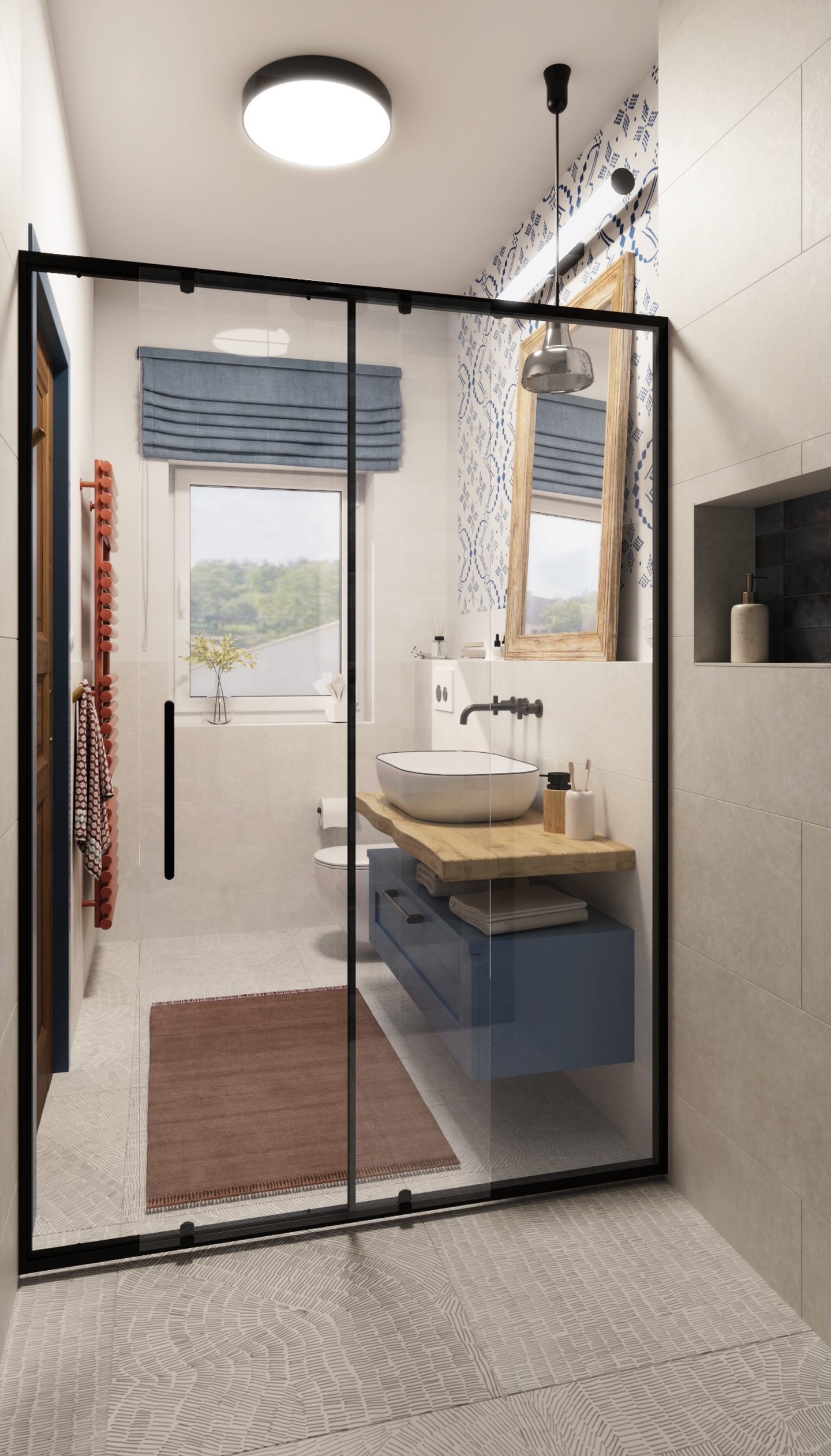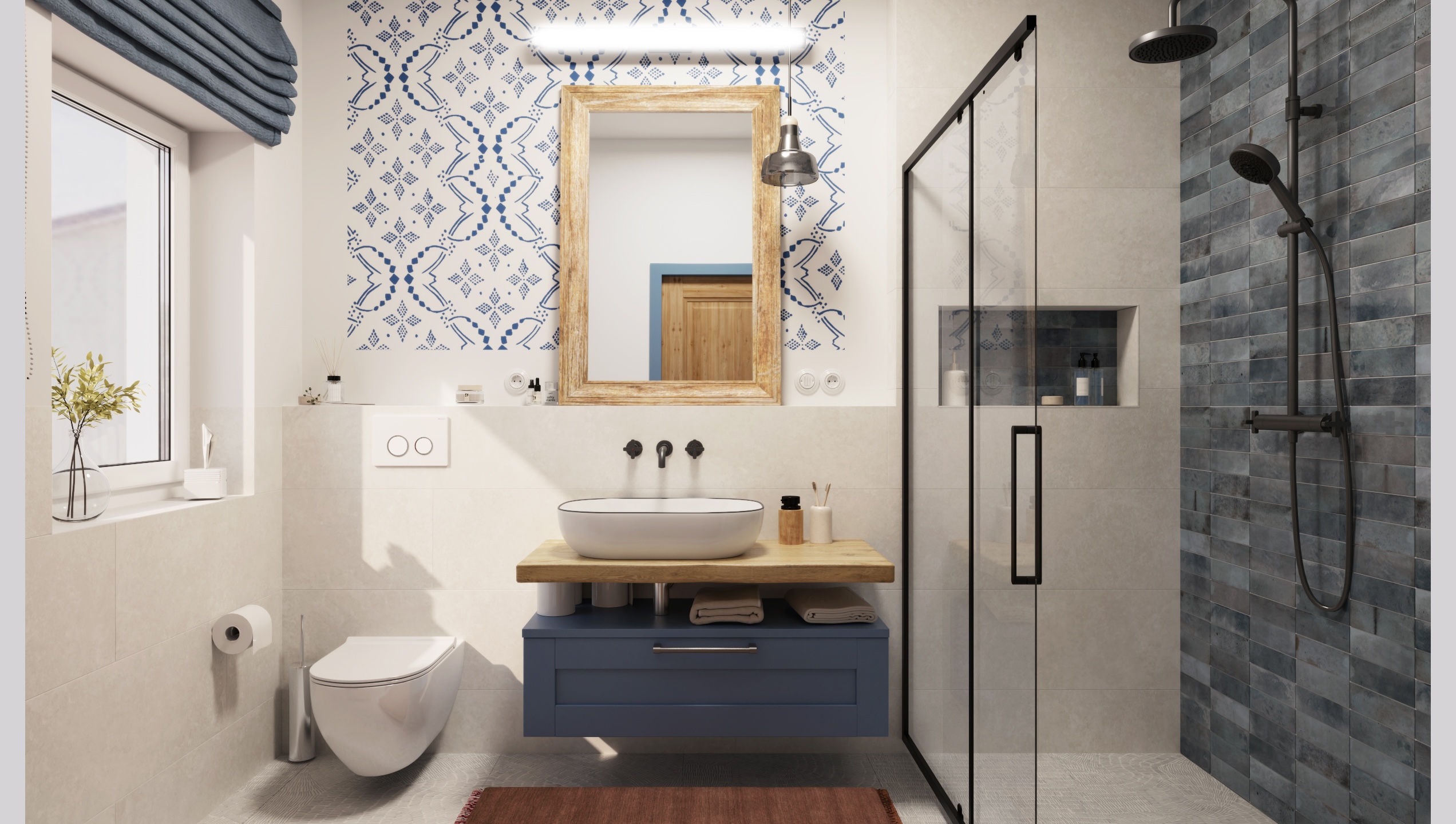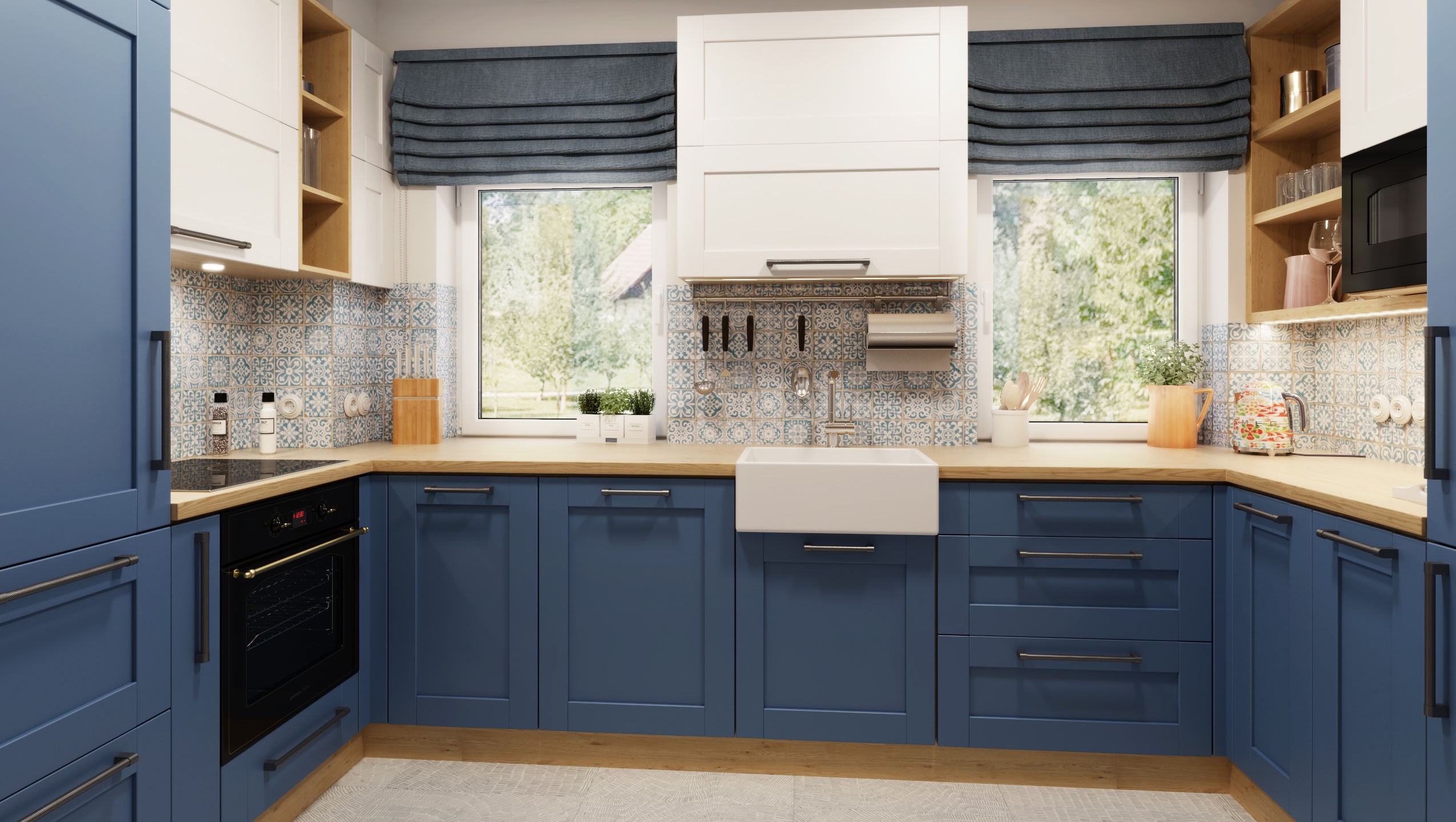 The interior of the cottage in the Slovak region combines traditional folk motifs with modern furnishings - the blue and white color scheme, wooden elements and patterned textiles inspired by folk costumes dominate here. Distinctive curtains, wall paintings and rustic details create a warm atmosphere with an emphasis on regional identity.