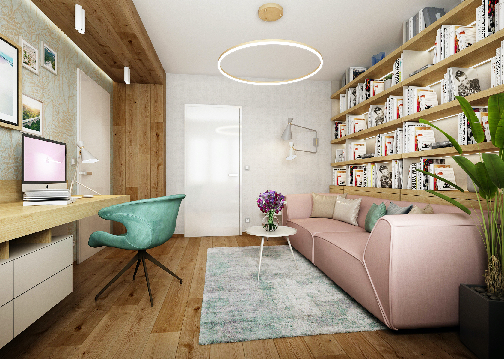 The right lady must not miss a home office where she will feel comfortable. Thanks to the wooden floor, which visually continues along the wall to the lowered ceiling, we have introduced a bit of nature into the space. Among other things, the bright floral wallpaper behind the desk also reminds us of this. The room is complemented by pink and green accessories in the form of seating furniture and a huge library.