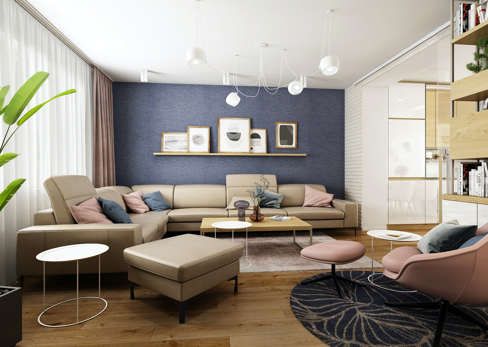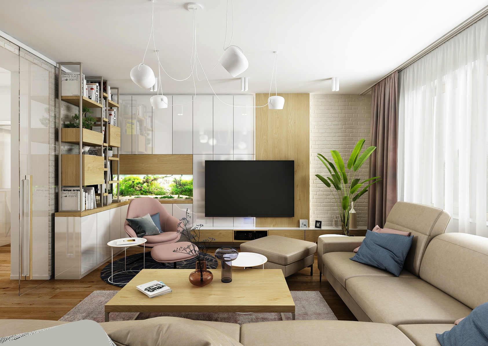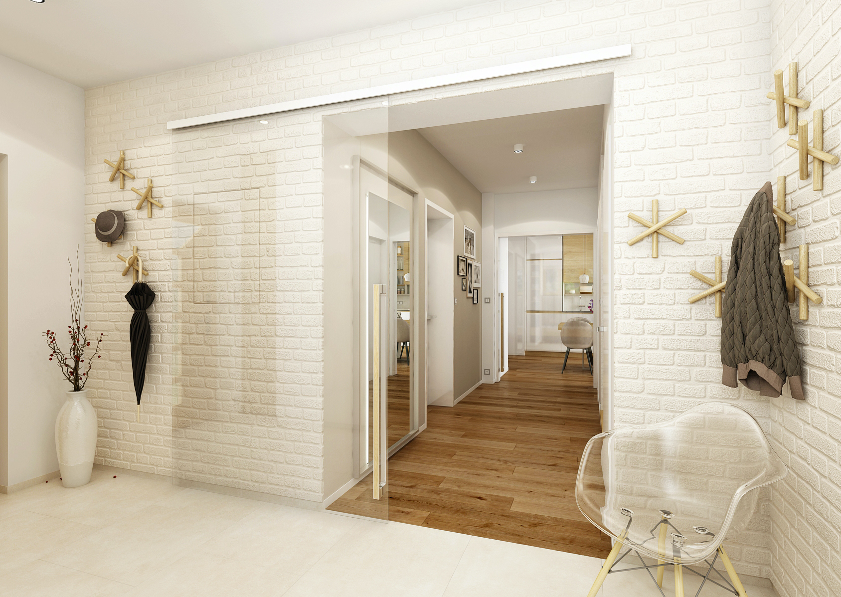 The apartment for a young lady is decorated in soft tones of pink, blue and white in combination with light wood decor. The walls are complemented by white 3D brick wallpaper, which gives the spaces a clean look. I tis also underlined by the glazed frameless sliding door, which separates the entrance hall from the rest of the interior.