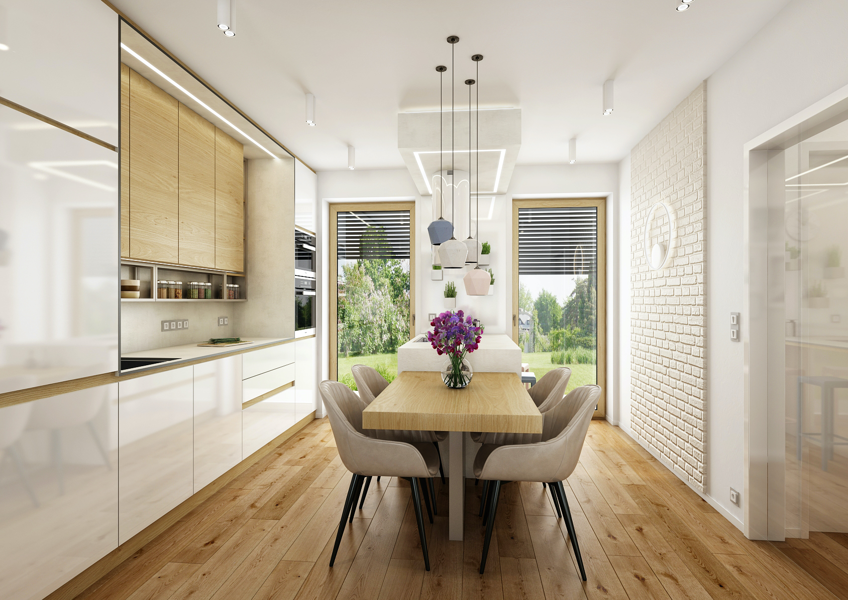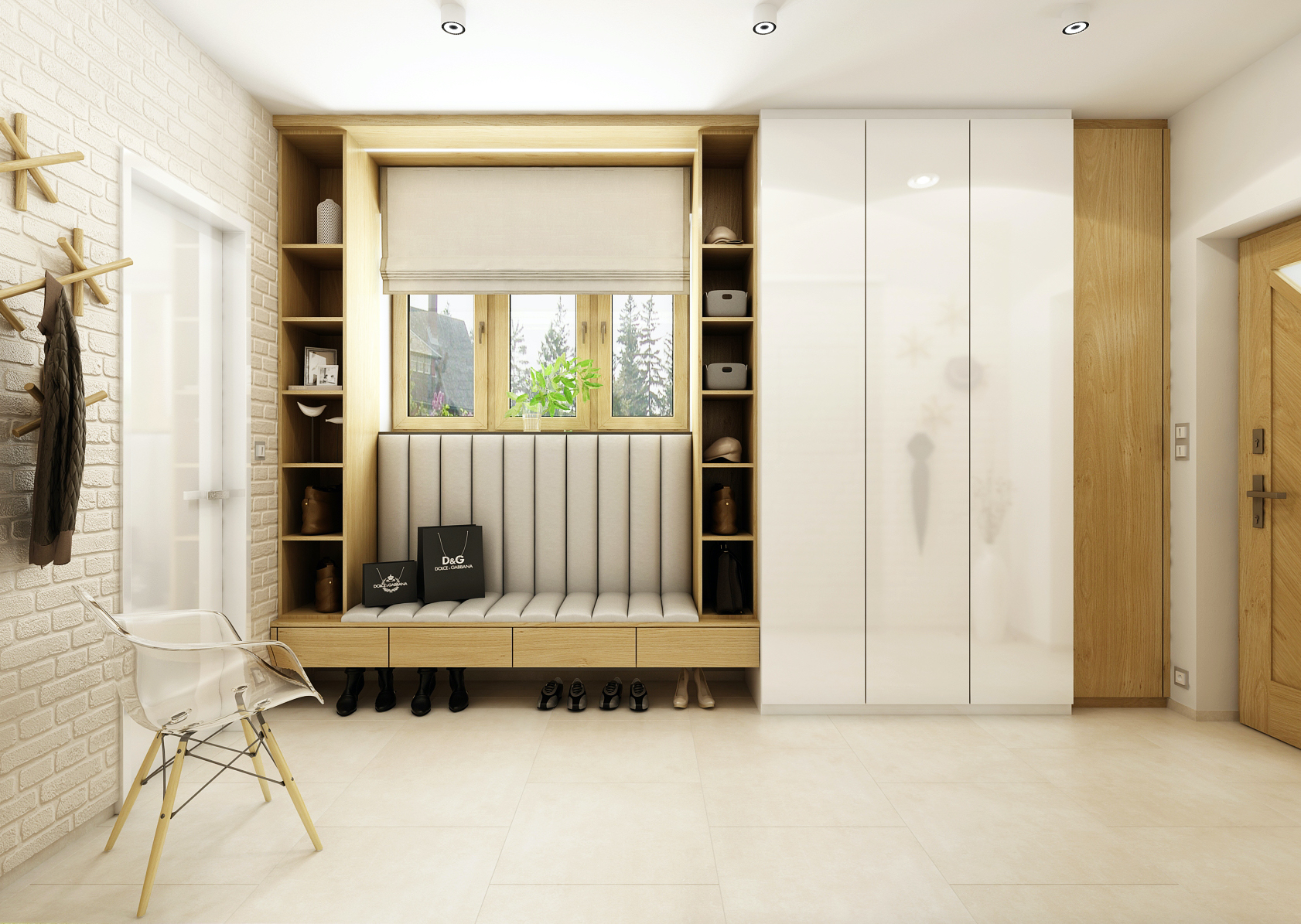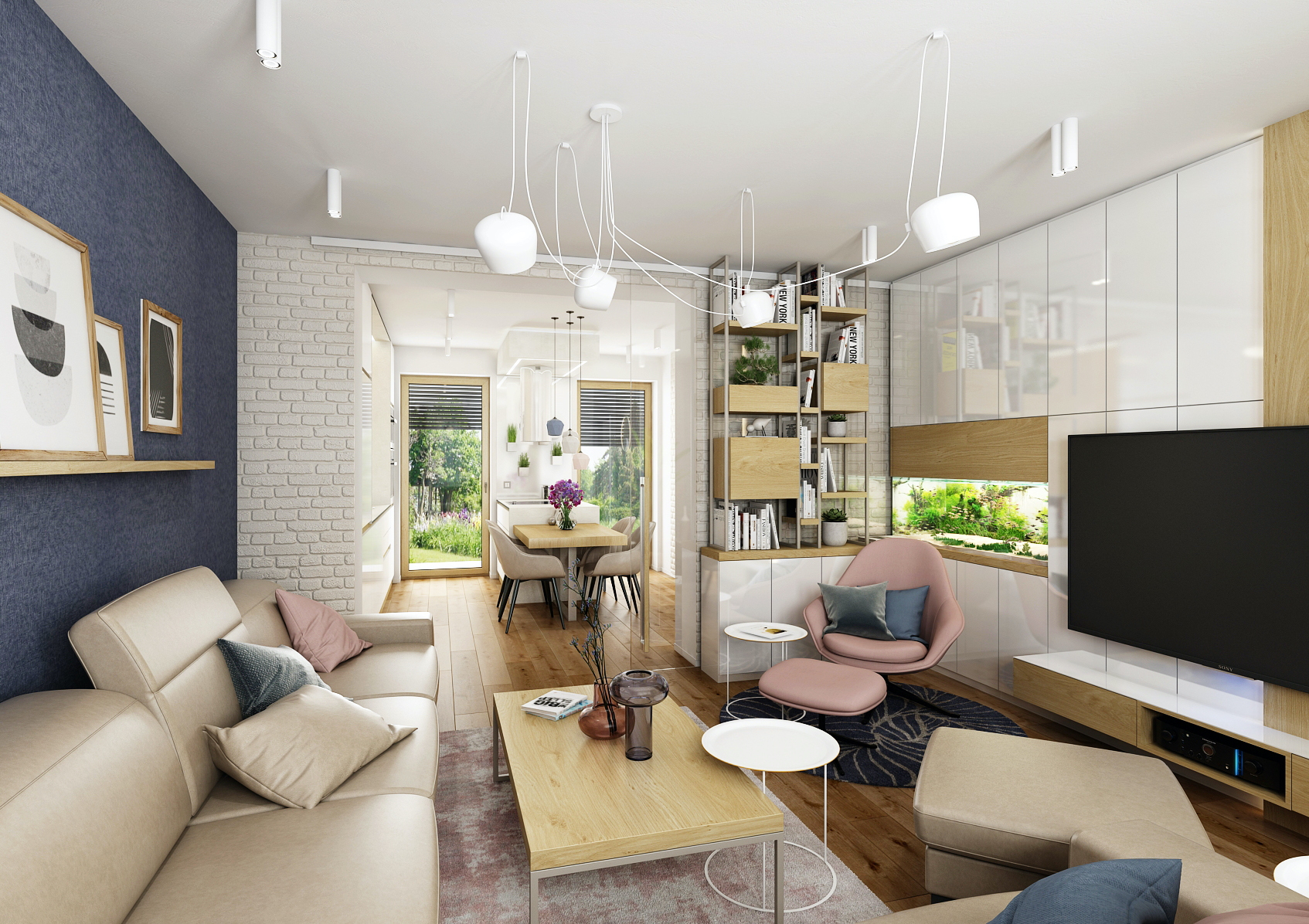 The apartment for a young lady is decorated in soft tones of pink, blue and white in combination with light wood decor. The walls are complemented by white 3D brick wallpaper, which gives the spaces a clean look. I tis also underlined by the glazed frameless sliding door, which separates the entrance hall from the rest of the interior.
