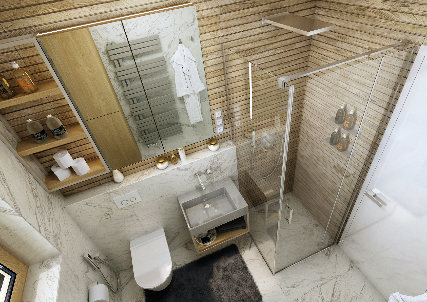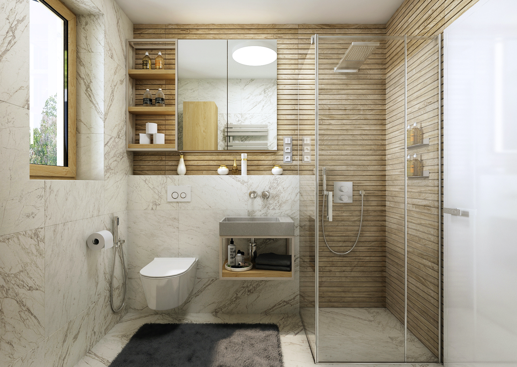 The bathroom, reminiscent of a wellness center, is lined with marble tiles, which make the room look luxurious. The tubless glass shower optically enlarges the room and the wooden cladding makes the bathroom more cozy.