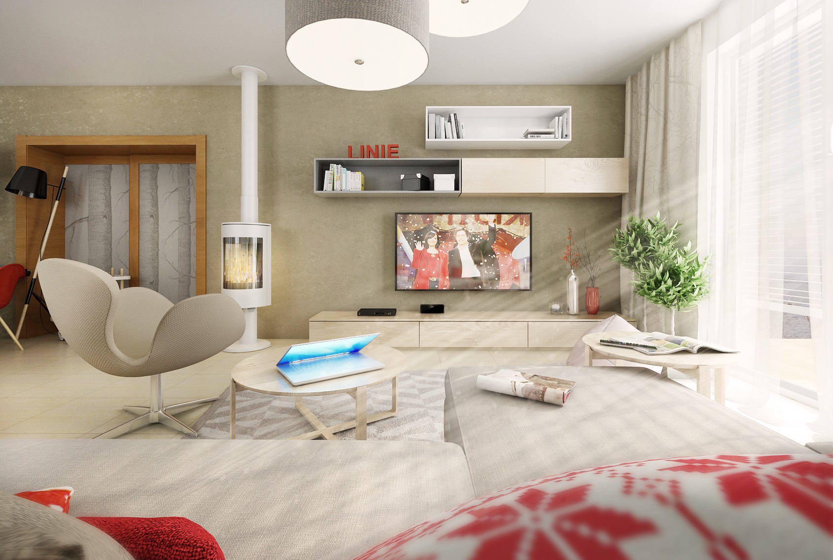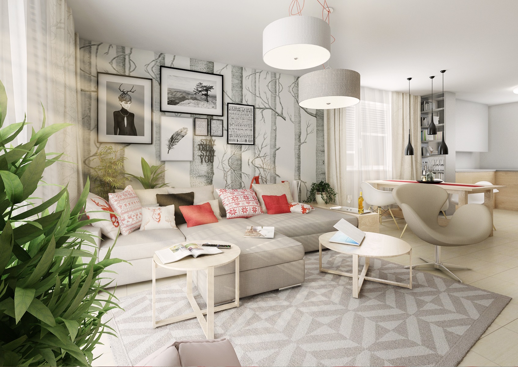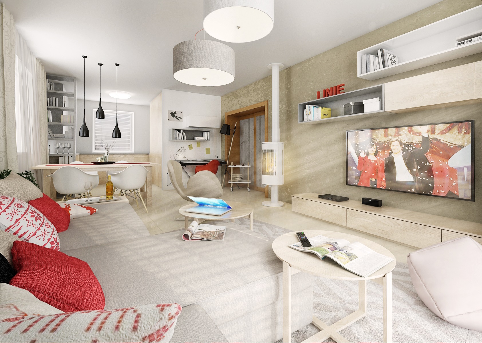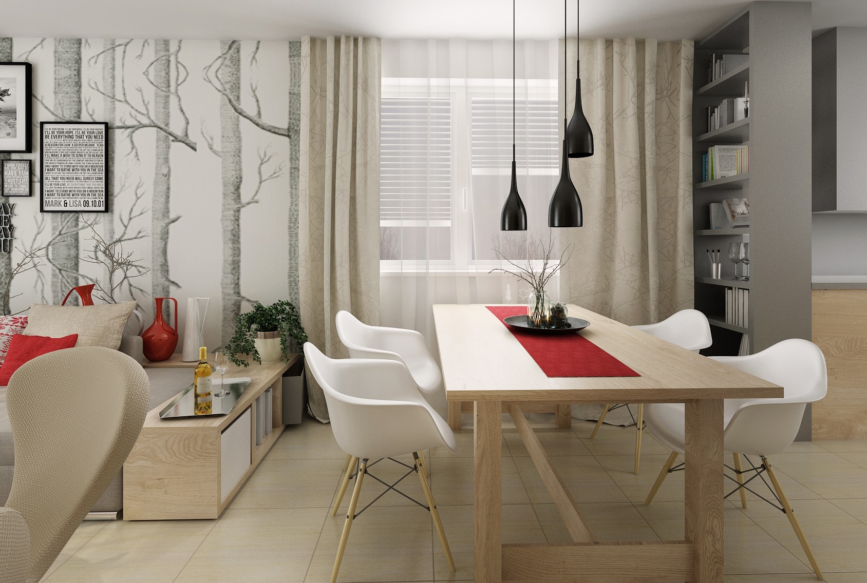 The young family was inspired by the Nordic style. They chose equipment in natural light color and materials, complemented by red decorations.