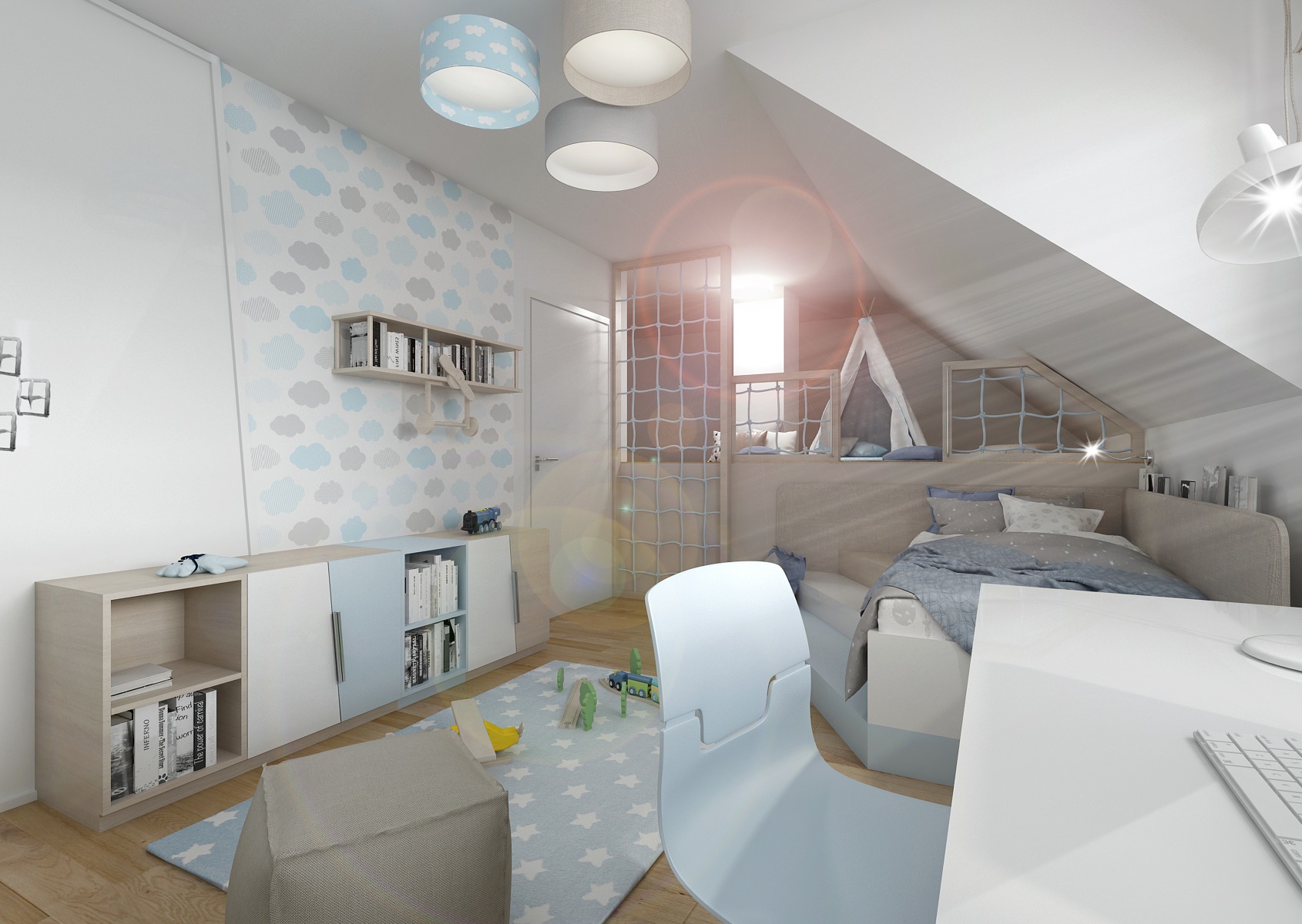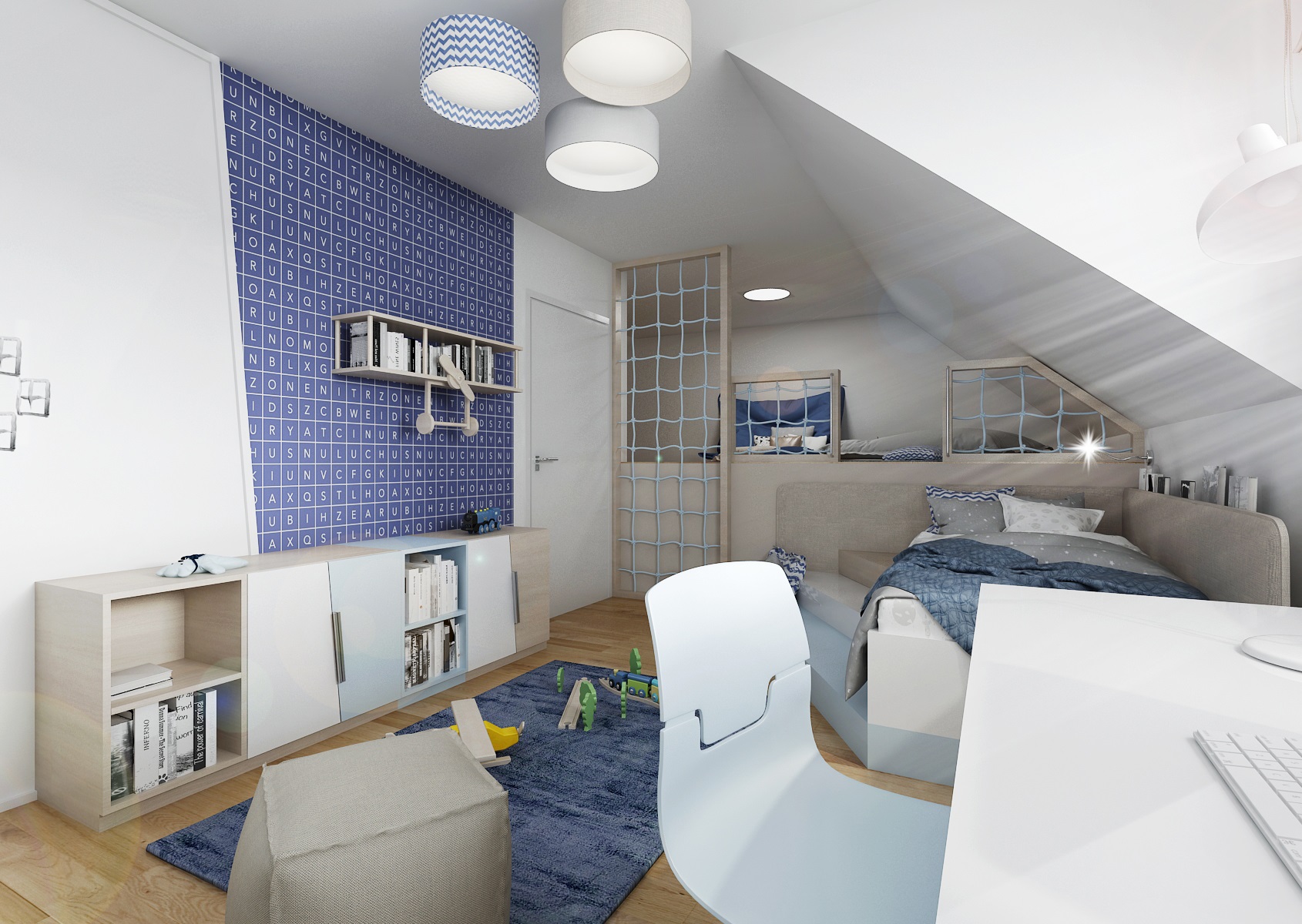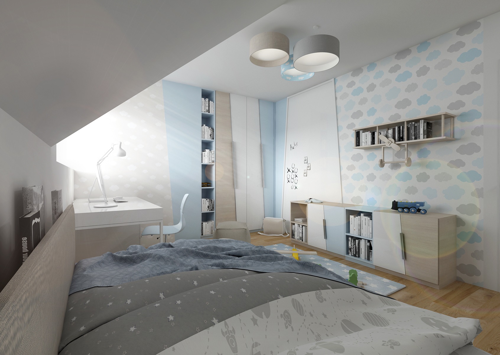 We see a room for a small aviation fan in two variants of used wallpapers. The colored wallpaper is followed by a glass tile, suitable as a painting and magnetic board. The thematic accessory is a wall library, which took on the form of a biplane, there is also a propeller. The bed is incorporated on a raised stepped podium. Through its steps you enter the playroom - relax zone. An otherwise blinded space above the stairs was used to build it.