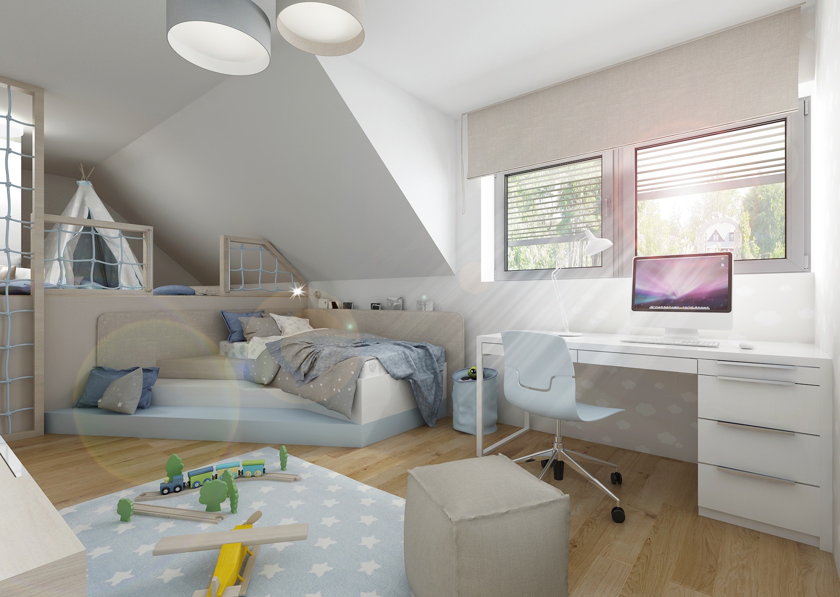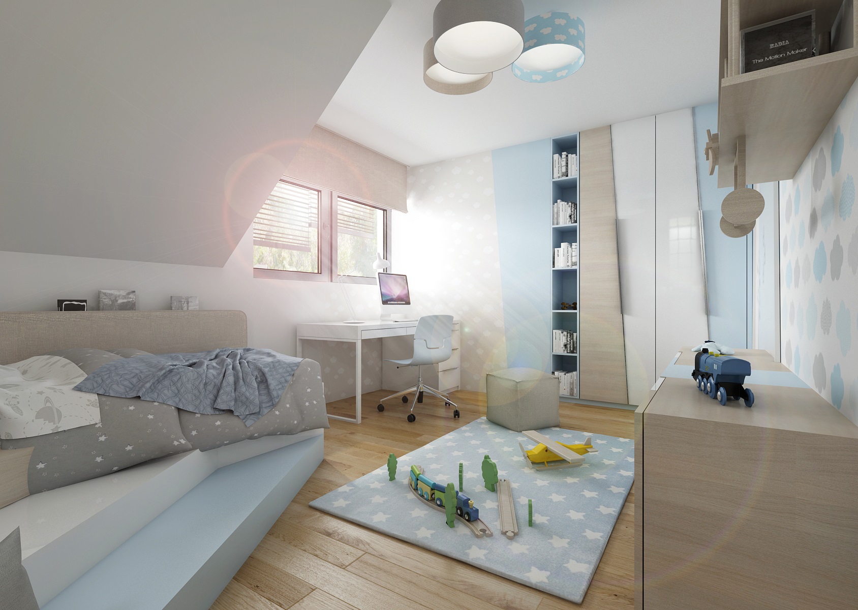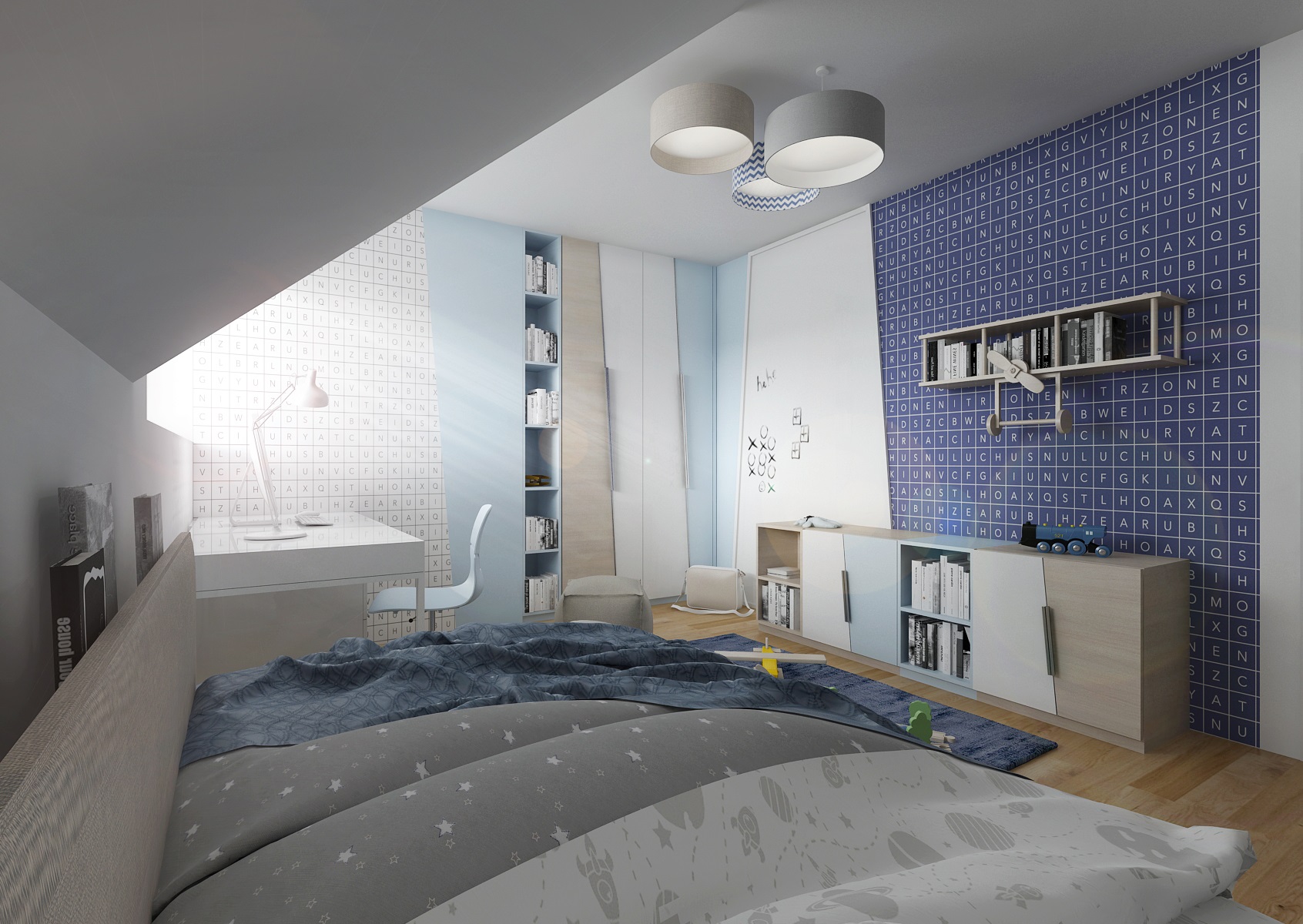 We see a room for a small aviation fan in two variants of used wallpapers. The colored wallpaper is followed by a glass tile, suitable as a painting and magnetic board. The thematic accessory is a wall library, which took on the form of a biplane, there is also a propeller. The bed is incorporated on a raised stepped podium. Through its steps you enter the playroom - relax zone. An otherwise blinded space above the stairs was used to build it.