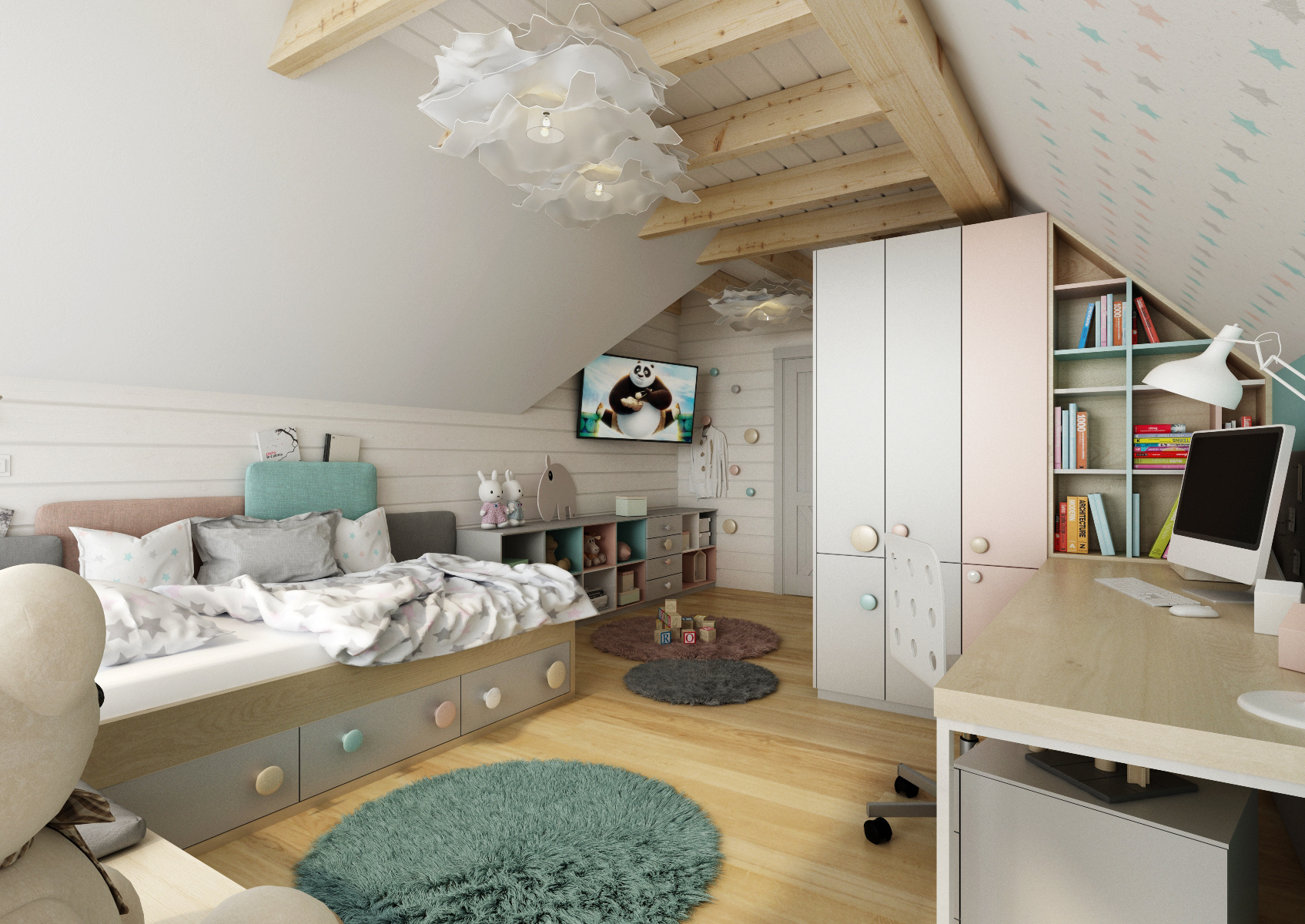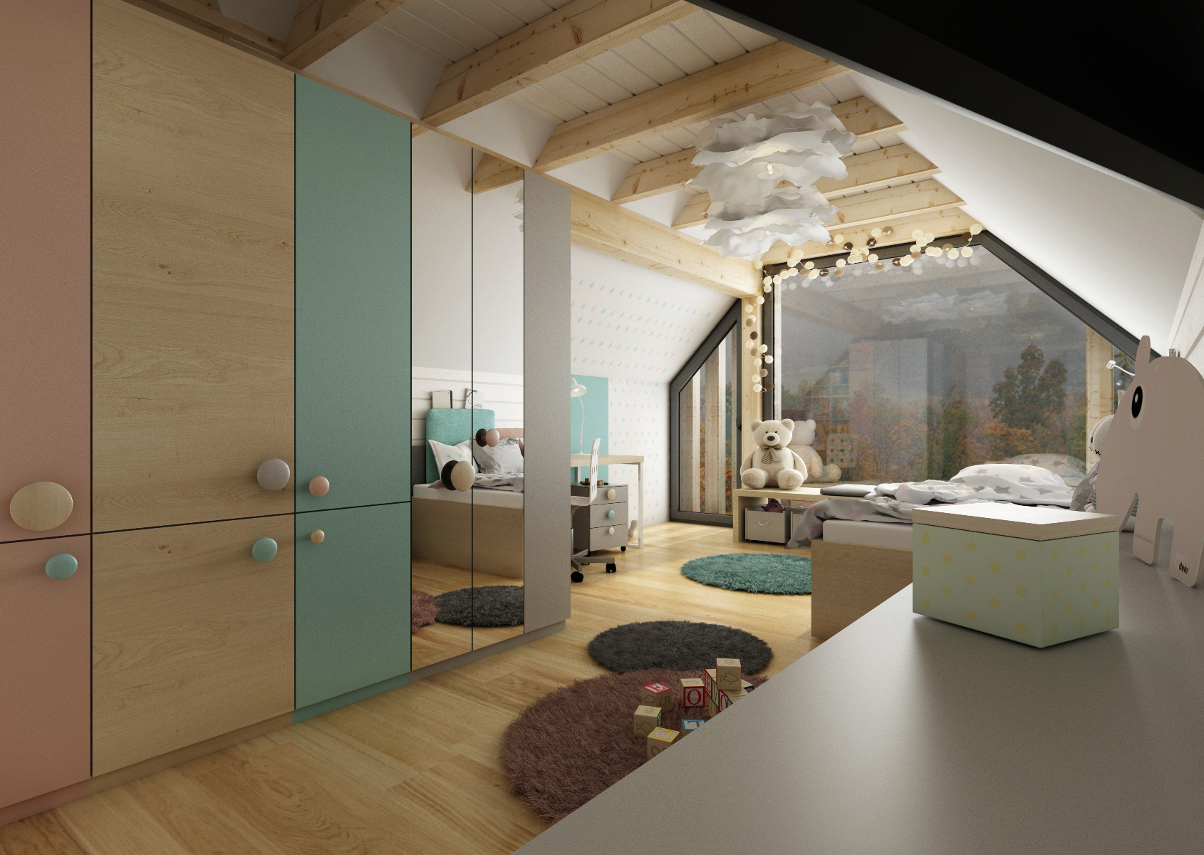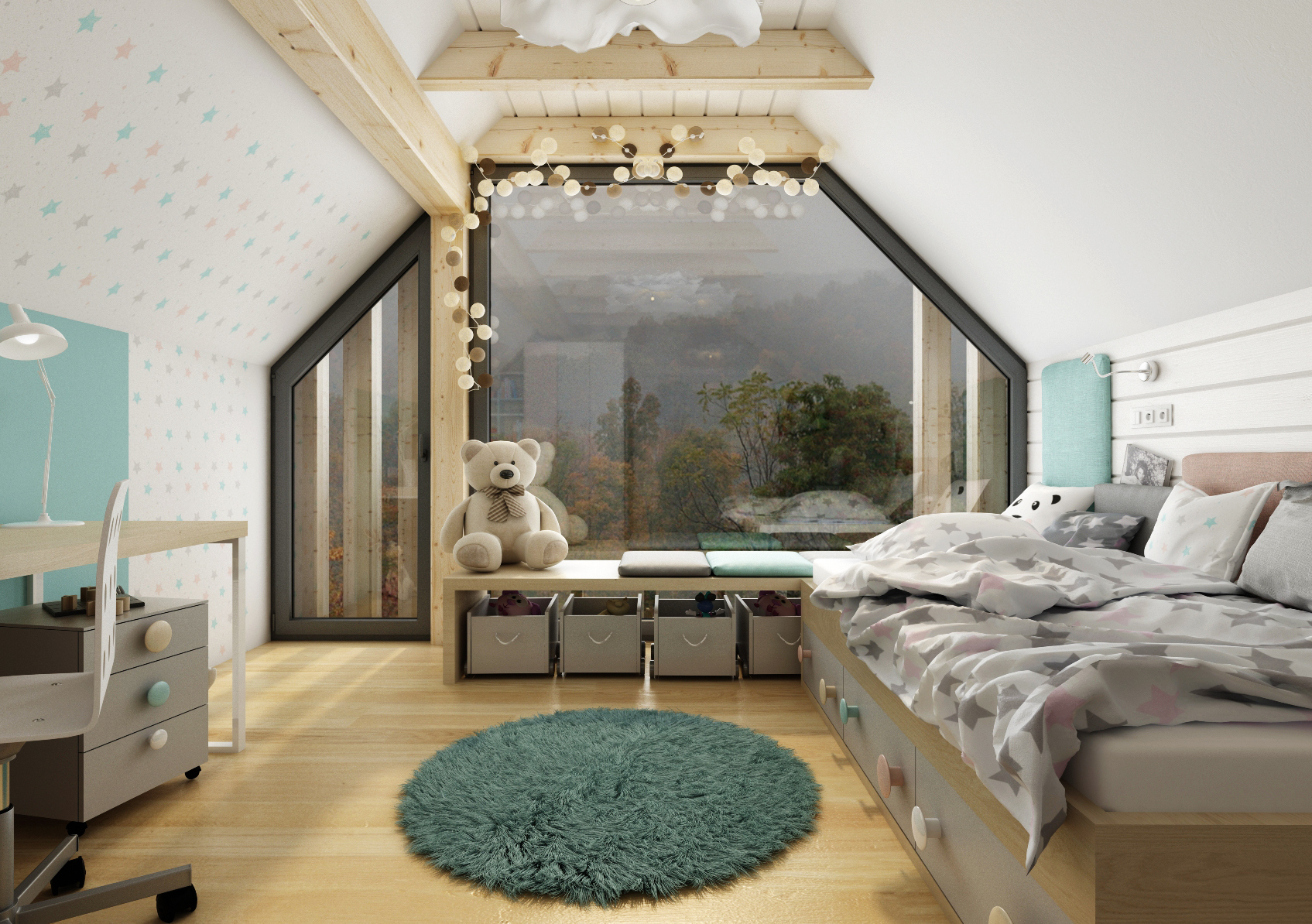 Under the gable roof, with a large windshield, overlooking the countryside. In the interior, the beams were partially preserved, treated only with transparent varnish. In the same natural tone, a vinyl floor and wood decor on the furniture were chosen. The softness of the girl's room is complemented by muted shades of selected colors - gray Fresco, pink Rose Givré and greenish Céladon, wallpaper with a star pattern and "floral" ceiling lights. Children often play on the floor - the combination of vinyl flooring and underfloor heating is an ideal combination if we do not want to choose a full-area rug.