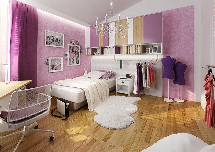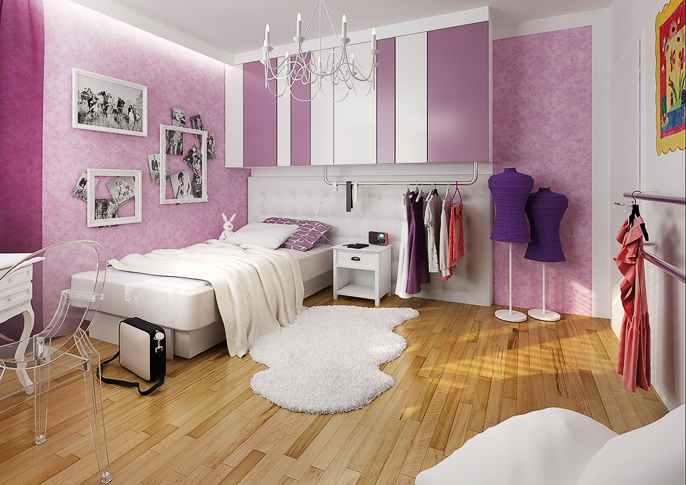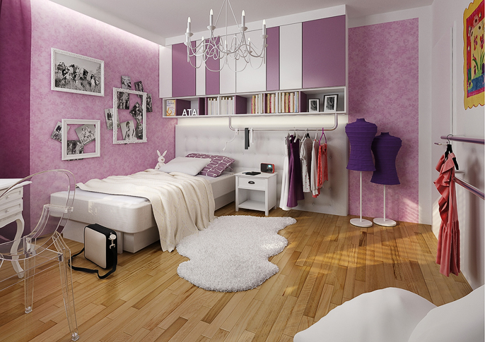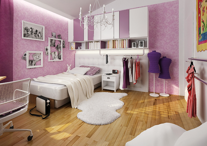Room design for a young ballerina. The built-in cabinet has mirrors on the door to simulate the mirrors that are on the walls in the gym and there are also bars on the wall. All in the girl's favorite pink and white combination. The dominant feature of this room is a magnificent chandelier anchored in the ceiling, reminiscent of a ballet hall.