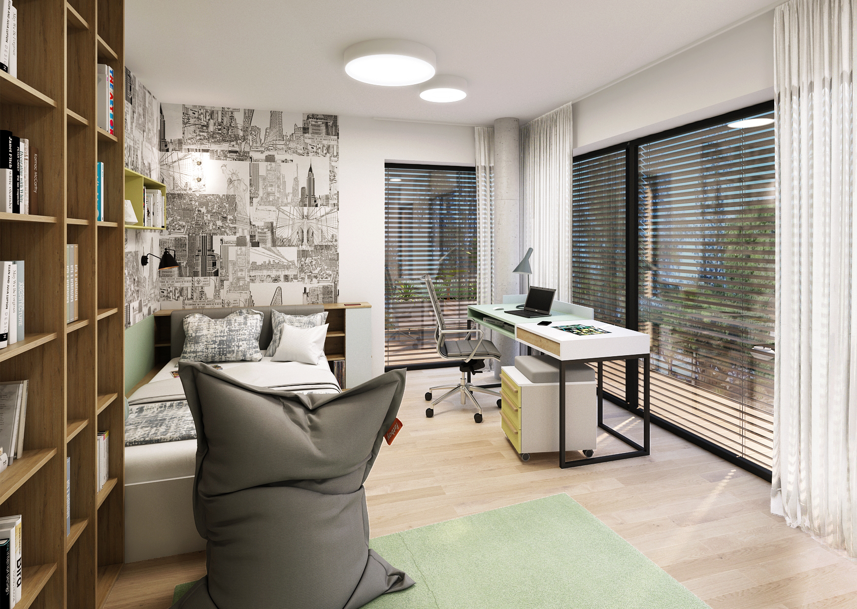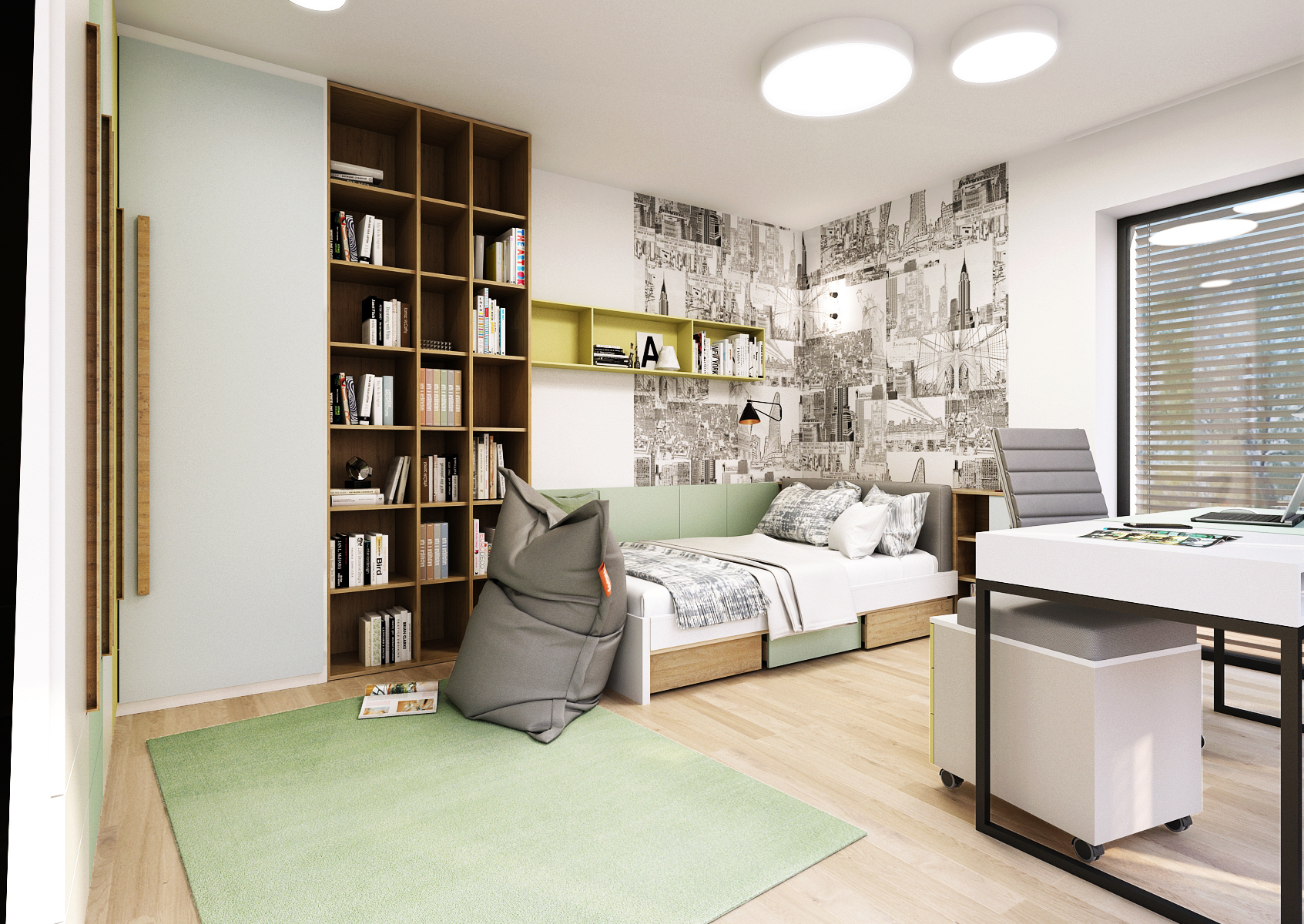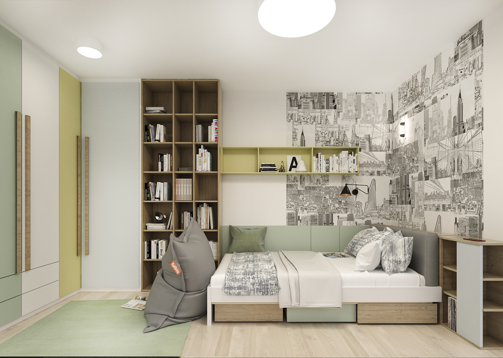 A single bed placed in the corner of the room, surrounded by wallpaper with a New York motif, visually transitions into a wardrobe system with an open bookcase. Against the window is a desk with a mobile container.