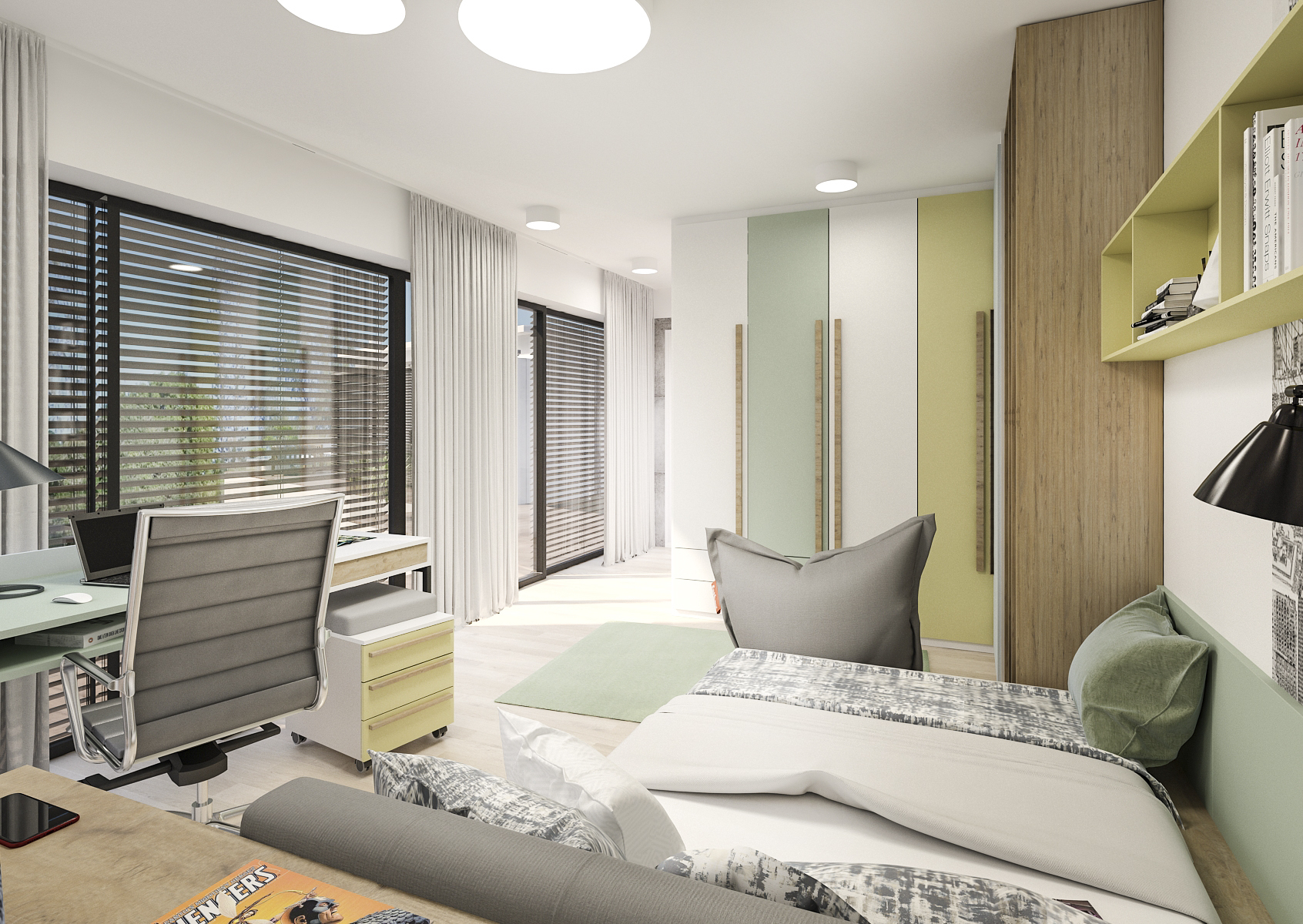 The storage space offers not only built-in wardrobes, but also several drawers under the bed or shelves above the bed. There is a bean bag by the library for relaxation. The space is lit by both ceiling lights – one larger and smaller circular light in the center of the room and a smaller one near the library area. Other smaller circular lights are placed in the aisle to the door.