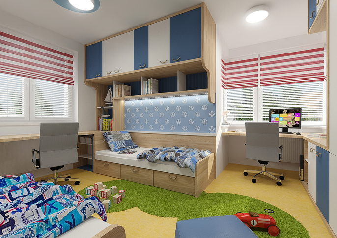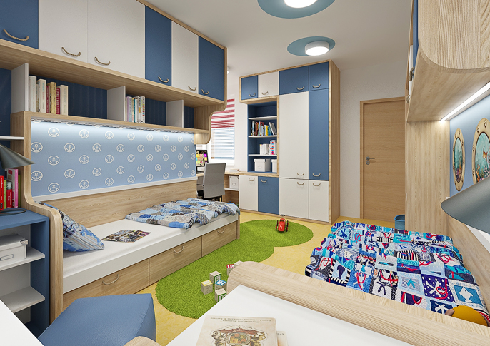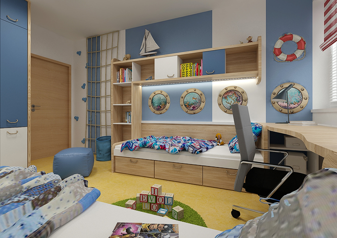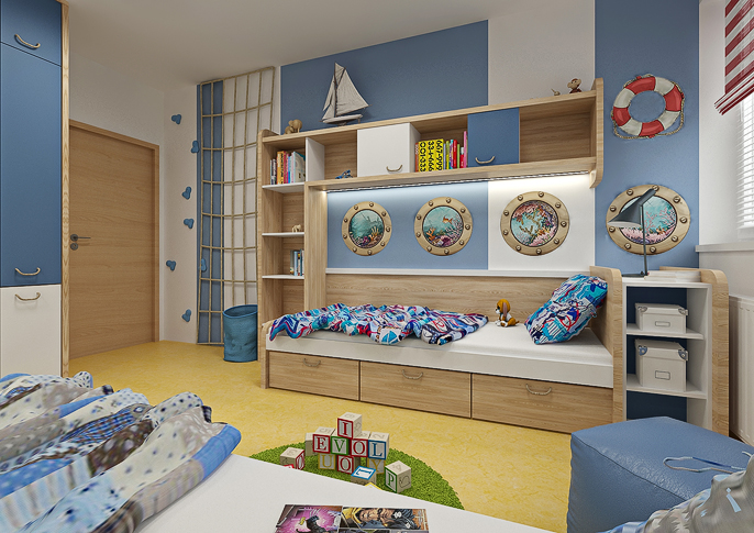 Stylish room for two brothers in a nautical style. The beds resemble a ship's cabin and the windows overlook the underwater world. An interesting element in the room is a rope net on the wall. The room is decorated in navy colors with various themed wallpapers and wall stickers in the form of windows or a lifebuoy. There is plenty of storage space in the room and the lockers have a rope instead of handles.
