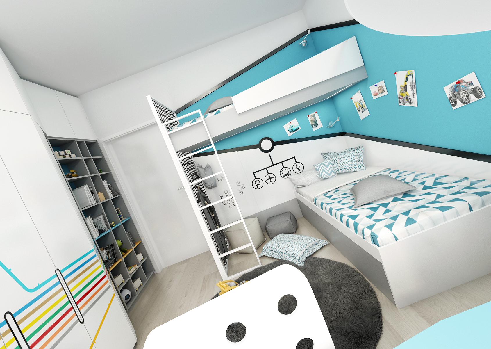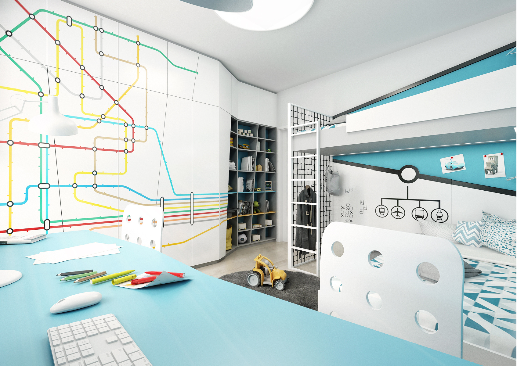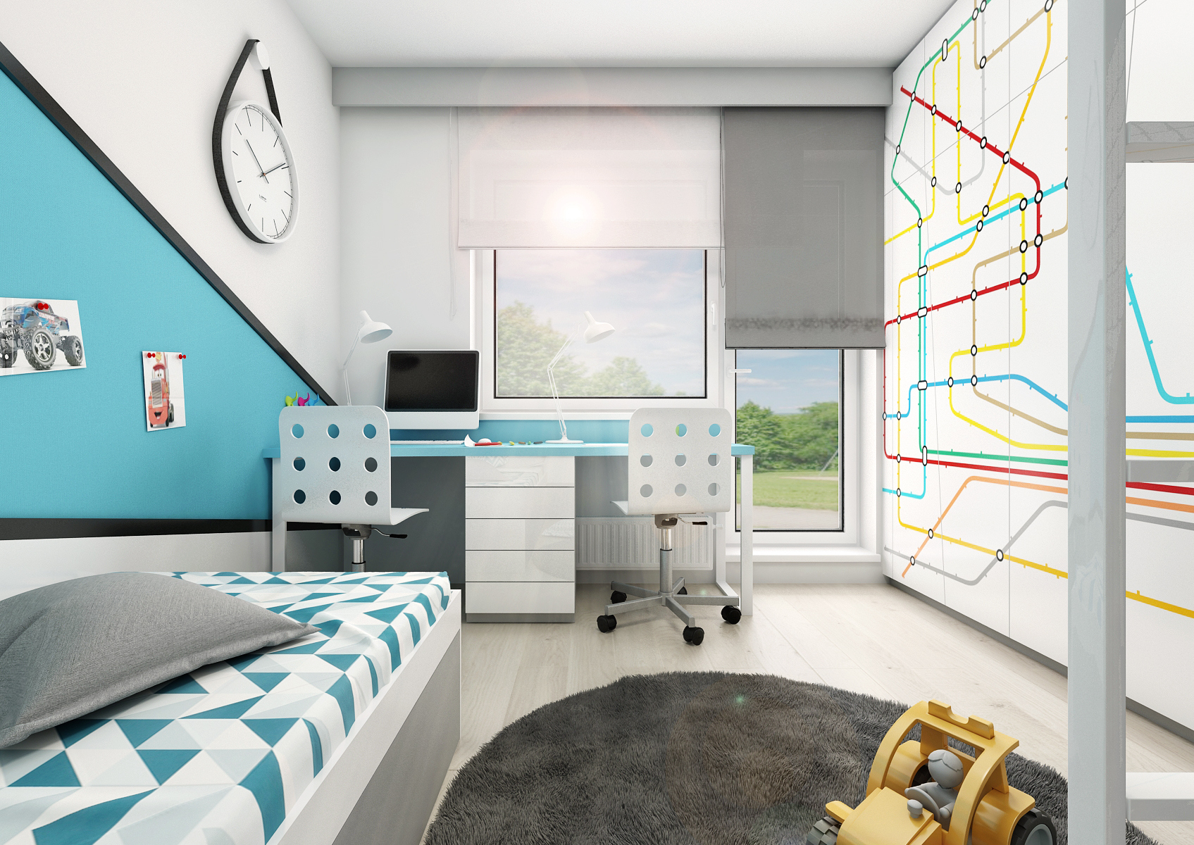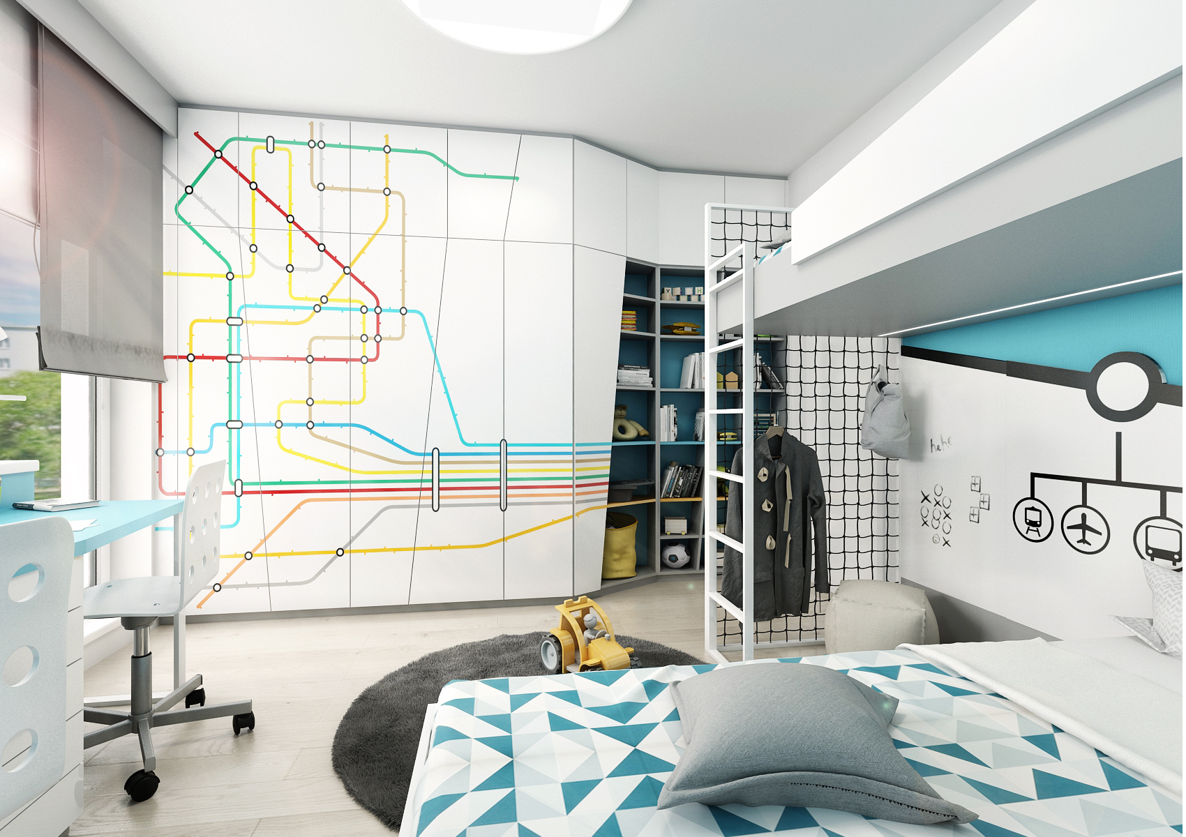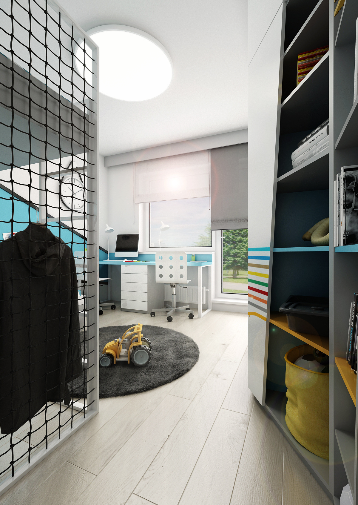 The boys love everything that rides and flies. The themed room is decorated with brightly colored stickers representing the track. The line of the yellow and blue tracks connects to the same colored shelves of the open library, where the depth of the built-in cabinet had to recede behind the door frame. The bunk beds are placed on top of each other, the lower bed is not so cramped. Steps can be used to ascend to the first floor, and a side net for a more adventurous journey. A sleeping table fit into the window, its length is limited by the entrance to the balcony, the two workstations are separated by central drawers, which the boys share. The wall paint in azure blue is magnetic, it contains metal particles, thanks to which you attach magnets to the wall. It will serve as a notice board for children.