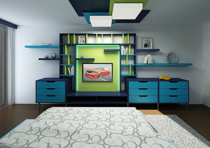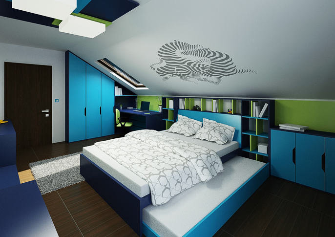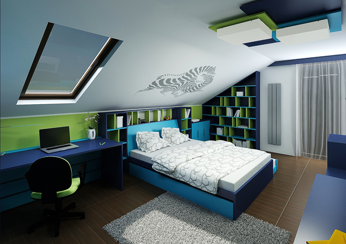 Spacious student bedrooms in a combination of blue and green colors with white accessories together form a cozy room. The space is situated in the attic and the sloping ceiling above the bed is variegated with a zebra motif. The room has plenty of storage space and lots of bookshelves. There is also a table built under the window for plenty of natural light. Under the bed is a drawer with mattress for occasional overnight.